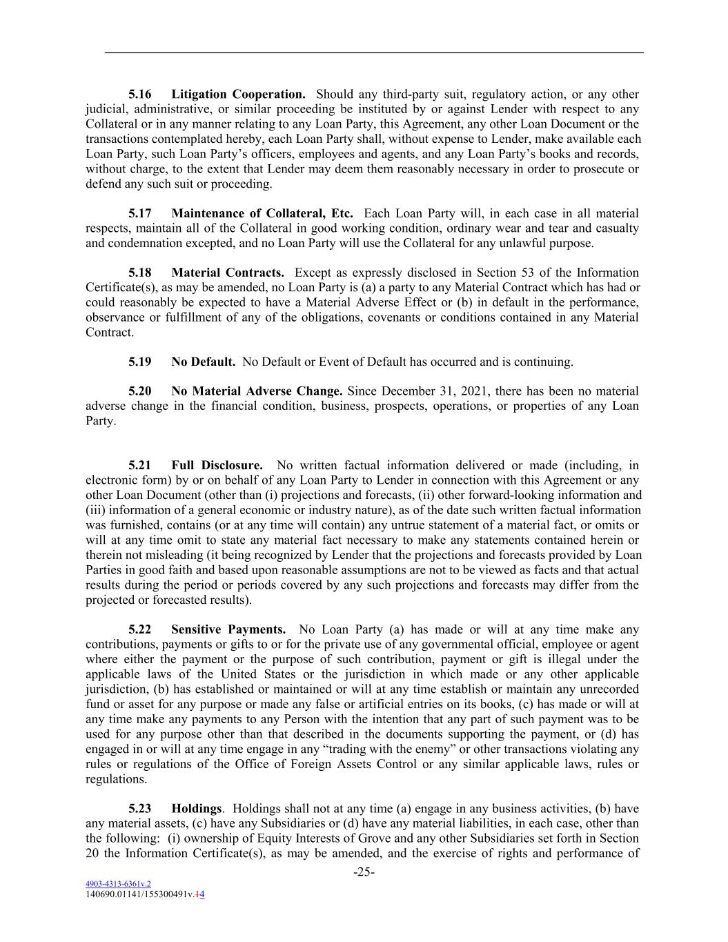 5.16 Litigation Cooperation. Should any third-party suit, regulatory action, or any other judicial, administrative, or similar proceeding be instituted by or against Lender with respect to any Collateral or in any manner relating to any Loan Party, this Agreement, any other Loan Document or the transactions contemplated hereby, each Loan Party shall, without expense to Lender, make available each Loan Party, such Loan Party’s officers, employees and agents, and any Loan Party’s books and records, without charge, to the extent that Lender may deem them reasonably necessary in order to prosecute or defend any such suit or proceeding. 5.17 Maintenance of Collateral, Etc. Each Loan Party will, in each case in all material respects, maintain all of the Collateral in good working condition, ordinary wear and tear and casualty and condemnation excepted, and no Loan Party will use the Collateral for any unlawful purpose. 5.18 Material Contracts. Except as expressly disclosed in Section 53 of the Information Certificate(s), as may be amended, no Loan Party is (a) a party to any Material Contract which has had or could reasonably be expected to have a Material Adverse Effect or (b) in default in the performance, observance or fulfillment of any of the obligations, covenants or conditions contained in any Material Contract. 5.19 No Default. No Default or Event of Default has occurred and is continuing. 5.20 No Material Adverse Change. Since December 31, 2021, there has been no material adverse change in the financial condition, business, prospects, operations, or properties of any Loan Party. 5.21 Full Disclosure. No written factual information delivered or made (including, in electronic form) by or on behalf of any Loan Party to Lender in connection with this Agreement or any other Loan Document (other than (i) projections and forecasts, (ii) other forward-looking information and (iii) information of a general economic or industry nature), as of the date such written factual information was furnished, contains (or at any time will contain) any untrue statement of a material fact, or omits or will at any time omit to state any material fact necessary to make any statements contained herein or therein not misleading (it being recognized by Lender that the projections and forecasts provided by Loan Parties in good faith and based upon reasonable assumptions are not to be viewed as facts and that actual results during the period or periods covered by any such projections and forecasts may differ from the projected or forecasted results). 5.22 Sensitive Payments. No Loan Party (a) has made or will at any time make any contributions, payments or gifts to or for the private use of any governmental official, employee or agent where either the payment or the purpose of such contribution, payment or gift is illegal under the applicable laws of the United States or the jurisdiction in which made or any other applicable jurisdiction, (b) has established or maintained or will at any time establish or maintain any unrecorded fund or asset for any purpose or made any false or artificial entries on its books, (c) has made or will at any time make any payments to any Person with the intention that any part of such payment was to be used for any purpose other than that described in the documents supporting the payment, or (d) has engaged in or will at any time engage in any “trading with the enemy” or other transactions violating any rules or regulations of the Office of Foreign Assets Control or any similar applicable laws, rules or regulations. 5.23 Holdings. Holdings shall not at any time (a) engage in any business activities, (b) have any material assets, (c) have any Subsidiaries or (d) have any material liabilities, in each case, other than the following: (i) ownership of Equity Interests of Grove and any other Subsidiaries set forth in Section 20 the Information Certificate(s), as may be amended, and the exercise of rights and performance of -25- 4903-4313-6361v.2 140690.01141/155300491v.14
