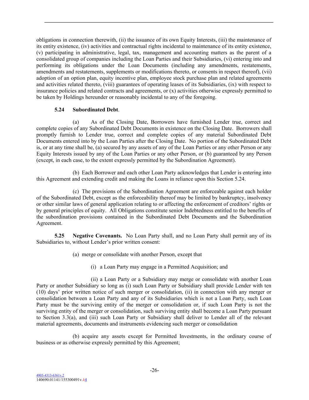 obligations in connection therewith, (ii) the issuance of its own Equity Interests, (iii) the maintenance of its entity existence, (iv) activities and contractual rights incidental to maintenance of its entity existence, (v) participating in administrative, legal, tax, management and accounting matters as the parent of a consolidated group of companies including the Loan Parties and their Subsidiaries, (vi) entering into and performing its obligations under the Loan Documents (including any amendments, restatements, amendments and restatements, supplements or modifications thereto, or consents in respect thereof), (vii) adoption of an option plan, equity incentive plan, employee stock purchase plan and related agreements and activities related thereto, (viii) guarantees of operating leases of its Subsidiaries, (ix) with respect to insurance policies and related contracts and agreements, or (x) activities otherwise expressly permitted to be taken by Holdings hereunder or reasonably incidental to any of the foregoing. 5.24 Subordinated Debt. (a) As of the Closing Date, Borrowers have furnished Lender true, correct and complete copies of any Subordinated Debt Documents in existence on the Closing Date. Borrowers shall promptly furnish to Lender true, correct and complete copies of any material Subordinated Debt Documents entered into by the Loan Parties after the Closing Date. No portion of the Subordinated Debt is, or at any time shall be, (a) secured by any assets of any of the Loan Parties or any other Person or any Equity Interests issued by any of the Loan Parties or any other Person, or (b) guaranteed by any Person (except, in each case, to the extent expressly permitted by the Subordination Agreement). (b) Each Borrower and each other Loan Party acknowledges that Lender is entering into this Agreement and extending credit and making the Loans in reliance upon this Section 5.24. (c) The provisions of the Subordination Agreement are enforceable against each holder of the Subordinated Debt, except as the enforceability thereof may be limited by bankruptcy, insolvency or other similar laws of general application relating to or affecting the enforcement of creditors’ rights or by general principles of equity. All Obligations constitute senior Indebtedness entitled to the benefits of the subordination provisions contained in the Subordinated Debt Documents and the Subordination Agreement. 5.25 Negative Covenants. No Loan Party shall, and no Loan Party shall permit any of its Subsidiaries to, without Lender’s prior written consent: (a) merge or consolidate with another Person, except that (i) a Loan Party may engage in a Permitted Acquisition; and (ii) a Loan Party or a Subsidiary may merge or consolidate with another Loan Party or another Subsidiary so long as (i) such Loan Party or Subsidiary shall provide Lender with ten (10) days’ prior written notice of such merger or consolidation, (ii) in connection with any merger or consolidation between a Loan Party and any of its Subsidiaries which is not a Loan Party, such Loan Party must be the surviving entity of the merger or consolidation or, if such Loan Party is not the surviving entity of the merger or consolidation, such surviving entity shall become a Loan Party pursuant to Section 3.3(a), and (iii) such Loan Party or Subsidiary shall deliver to Lender all of the relevant material agreements, documents and instruments evidencing such merger or consolidation (b) acquire any assets except for Permitted Investments, in the ordinary course of business or as otherwise expressly permitted by this Agreement; -26- 4903-4313-6361v.2 140690.01141/155300491v.14