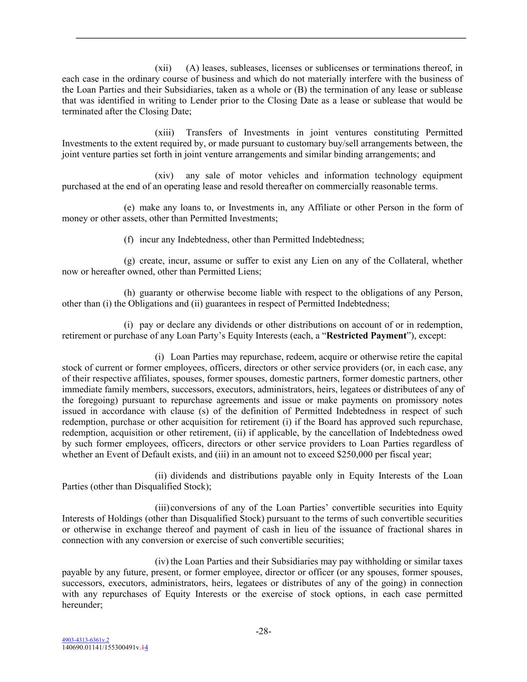 (xii) (A) leases, subleases, licenses or sublicenses or terminations thereof, in each case in the ordinary course of business and which do not materially interfere with the business of the Loan Parties and their Subsidiaries, taken as a whole or (B) the termination of any lease or sublease that was identified in writing to Lender prior to the Closing Date as a lease or sublease that would be terminated after the Closing Date; (xiii) Transfers of Investments in joint ventures constituting Permitted Investments to the extent required by, or made pursuant to customary buy/sell arrangements between, the joint venture parties set forth in joint venture arrangements and similar binding arrangements; and (xiv) any sale of motor vehicles and information technology equipment purchased at the end of an operating lease and resold thereafter on commercially reasonable terms. (e) make any loans to, or Investments in, any Affiliate or other Person in the form of money or other assets, other than Permitted Investments; (f) incur any Indebtedness, other than Permitted Indebtedness; (g) create, incur, assume or suffer to exist any Lien on any of the Collateral, whether now or hereafter owned, other than Permitted Liens; (h) guaranty or otherwise become liable with respect to the obligations of any Person, other than (i) the Obligations and (ii) guarantees in respect of Permitted Indebtedness; (i) pay or declare any dividends or other distributions on account of or in redemption, retirement or purchase of any Loan Party’s Equity Interests (each, a “Restricted Payment”), except: (i) Loan Parties may repurchase, redeem, acquire or otherwise retire the capital stock of current or former employees, officers, directors or other service providers (or, in each case, any of their respective affiliates, spouses, former spouses, domestic partners, former domestic partners, other immediate family members, successors, executors, administrators, heirs, legatees or distributees of any of the foregoing) pursuant to repurchase agreements and issue or make payments on promissory notes issued in accordance with clause (s) of the definition of Permitted Indebtedness in respect of such redemption, purchase or other acquisition for retirement (i) if the Board has approved such repurchase, redemption, acquisition or other retirement, (ii) if applicable, by the cancellation of Indebtedness owed by such former employees, officers, directors or other service providers to Loan Parties regardless of whether an Event of Default exists, and (iii) in an amount not to exceed $250,000 per fiscal year; (ii) dividends and distributions payable only in Equity Interests of the Loan Parties (other than Disqualified Stock); (iii)conversions of any of the Loan Parties’ convertible securities into Equity Interests of Holdings (other than Disqualified Stock) pursuant to the terms of such convertible securities or otherwise in exchange thereof and payment of cash in lieu of the issuance of fractional shares in connection with any conversion or exercise of such convertible securities; (iv) the Loan Parties and their Subsidiaries may pay withholding or similar taxes payable by any future, present, or former employee, director or officer (or any spouses, former spouses, successors, executors, administrators, heirs, legatees or distributes of any of the going) in connection with any repurchases of Equity Interests or the exercise of stock options, in each case permitted hereunder; -28- 4903-4313-6361v.2 140690.01141/155300491v.14