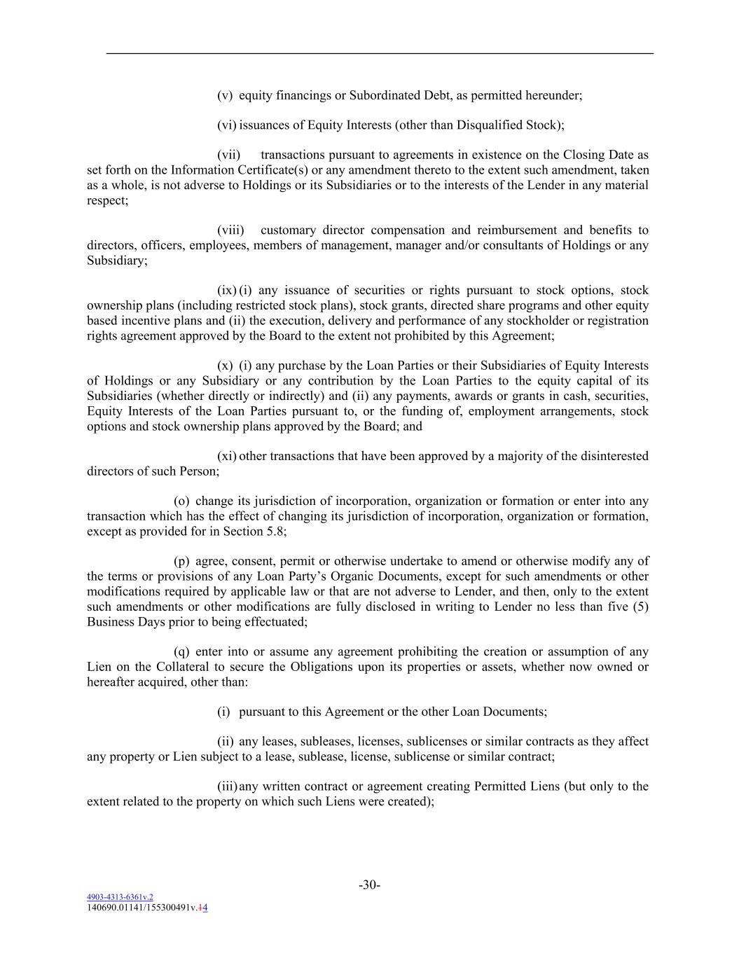 (v) equity financings or Subordinated Debt, as permitted hereunder; (vi) issuances of Equity Interests (other than Disqualified Stock); (vii) transactions pursuant to agreements in existence on the Closing Date as set forth on the Information Certificate(s) or any amendment thereto to the extent such amendment, taken as a whole, is not adverse to Holdings or its Subsidiaries or to the interests of the Lender in any material respect; (viii) customary director compensation and reimbursement and benefits to directors, officers, employees, members of management, manager and/or consultants of Holdings or any Subsidiary; (ix) (i) any issuance of securities or rights pursuant to stock options, stock ownership plans (including restricted stock plans), stock grants, directed share programs and other equity based incentive plans and (ii) the execution, delivery and performance of any stockholder or registration rights agreement approved by the Board to the extent not prohibited by this Agreement; (x) (i) any purchase by the Loan Parties or their Subsidiaries of Equity Interests of Holdings or any Subsidiary or any contribution by the Loan Parties to the equity capital of its Subsidiaries (whether directly or indirectly) and (ii) any payments, awards or grants in cash, securities, Equity Interests of the Loan Parties pursuant to, or the funding of, employment arrangements, stock options and stock ownership plans approved by the Board; and (xi) other transactions that have been approved by a majority of the disinterested directors of such Person; (o) change its jurisdiction of incorporation, organization or formation or enter into any transaction which has the effect of changing its jurisdiction of incorporation, organization or formation, except as provided for in Section 5.8; (p) agree, consent, permit or otherwise undertake to amend or otherwise modify any of the terms or provisions of any Loan Party’s Organic Documents, except for such amendments or other modifications required by applicable law or that are not adverse to Lender, and then, only to the extent such amendments or other modifications are fully disclosed in writing to Lender no less than five (5) Business Days prior to being effectuated; (q) enter into or assume any agreement prohibiting the creation or assumption of any Lien on the Collateral to secure the Obligations upon its properties or assets, whether now owned or hereafter acquired, other than: (i) pursuant to this Agreement or the other Loan Documents; (ii) any leases, subleases, licenses, sublicenses or similar contracts as they affect any property or Lien subject to a lease, sublease, license, sublicense or similar contract; (iii)any written contract or agreement creating Permitted Liens (but only to the extent related to the property on which such Liens were created); -30- 4903-4313-6361v.2 140690.01141/155300491v.14