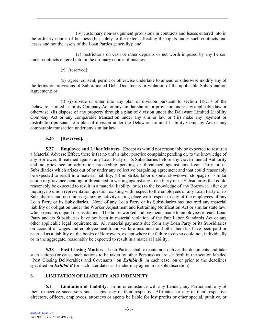(iv) customary non-assignment provisions in contracts and leases entered into in the ordinary course of business (but solely to the extent affecting the rights under such contracts and leases and not the assets of the Loan Parties generally); and (v) restrictions on cash or other deposits or net worth imposed by any Person under contracts entered into in the ordinary course of business. (r) [reserved]; (s) agree, consent, permit or otherwise undertake to amend or otherwise modify any of the terms or provisions of Subordinated Debt Documents in violation of the applicable Subordination Agreement; or (t) (i) divide or enter into any plan of division pursuant to section 18-217 of the Delaware Limited Liability Company Act or any similar stature or provision under any applicable law or otherwise, (ii) dispose of any property through a plan of division under the Delaware Limited Liability Company Act or any comparable transaction under any similar law or (iii) make any payment or distribution pursuant to a plan of division under the Delaware Limited Liability Company Act or any comparable transaction under any similar law. 5.26 [Reserved]. 5.27 Employee and Labor Matters. Except as would not reasonably be expected to result in a Material Adverse Effect, there is (a) no unfair labor practice complaint pending or, to the knowledge of any Borrower, threatened against any Loan Party or its Subsidiaries before any Governmental Authority and no grievance or arbitration proceeding pending or threatened against any Loan Party or its Subsidiaries which arises out of or under any collective bargaining agreement and that could reasonably be expected to result in a material liability, (b) no strike, labor dispute, slowdown, stoppage or similar action or grievance pending or threatened in writing against any Loan Party or its Subsidiaries that could reasonably be expected to result in a material liability, or (c) to the knowledge of any Borrower, after due inquiry, no union representation question existing with respect to the employees of any Loan Party or its Subsidiaries and no union organizing activity taking place with respect to any of the employees of any Loan Party or its Subsidiaries. None of any Loan Party or its Subsidiaries has incurred any material liability or obligation under the Worker Adjustment and Retraining Notification Act or similar state law, which remains unpaid or unsatisfied. The hours worked and payments made to employees of each Loan Party and its Subsidiaries have not been in material violation of the Fair Labor Standards Act or any other applicable legal requirements. All material payments due from any Loan Party or its Subsidiaries on account of wages and employee health and welfare insurance and other benefits have been paid or accrued as a liability on the books of Borrowers, except where the failure to do so could not, individually or in the aggregate, reasonably be expected to result in a material liability. 5.28 Post-Closing Matters. Loan Parties shall execute and deliver the documents and take such actions (or cause such actions to be taken by other Persons) as are set forth in the section labeled “Post Closing Deliverables and Covenants” on Exhibit B, in each case, on or prior to the deadlines specified on Exhibit B (or such later dates as Lender may agree in its sole discretion). 6. LIMITATION OF LIABILITY AND INDEMNITY. 6.1 Limitation of Liability. In no circumstance will any Lender, any Participant, any of their respective successors and assigns, any of their respective Affiliates, or any of their respective directors, officers, employees, attorneys or agents be liable for lost profits or other special, punitive, or -31- 4903-4313-6361v.2 140690.01141/155300491v.14