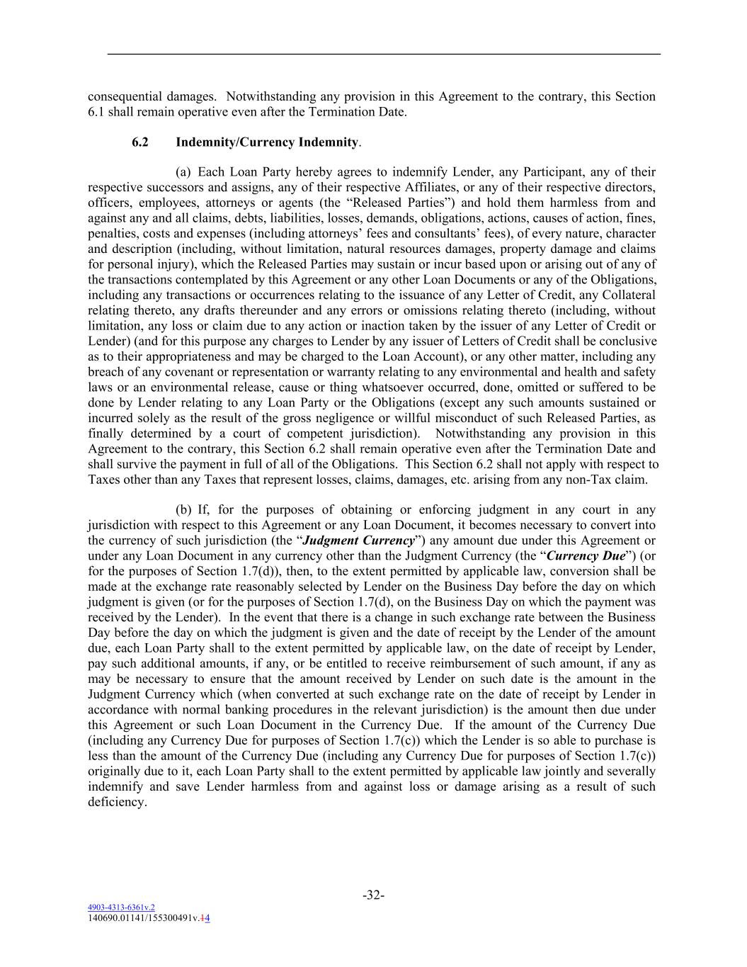 consequential damages. Notwithstanding any provision in this Agreement to the contrary, this Section 6.1 shall remain operative even after the Termination Date. 6.2 Indemnity/Currency Indemnity. (a) Each Loan Party hereby agrees to indemnify Lender, any Participant, any of their respective successors and assigns, any of their respective Affiliates, or any of their respective directors, officers, employees, attorneys or agents (the “Released Parties”) and hold them harmless from and against any and all claims, debts, liabilities, losses, demands, obligations, actions, causes of action, fines, penalties, costs and expenses (including attorneys’ fees and consultants’ fees), of every nature, character and description (including, without limitation, natural resources damages, property damage and claims for personal injury), which the Released Parties may sustain or incur based upon or arising out of any of the transactions contemplated by this Agreement or any other Loan Documents or any of the Obligations, including any transactions or occurrences relating to the issuance of any Letter of Credit, any Collateral relating thereto, any drafts thereunder and any errors or omissions relating thereto (including, without limitation, any loss or claim due to any action or inaction taken by the issuer of any Letter of Credit or Lender) (and for this purpose any charges to Lender by any issuer of Letters of Credit shall be conclusive as to their appropriateness and may be charged to the Loan Account), or any other matter, including any breach of any covenant or representation or warranty relating to any environmental and health and safety laws or an environmental release, cause or thing whatsoever occurred, done, omitted or suffered to be done by Lender relating to any Loan Party or the Obligations (except any such amounts sustained or incurred solely as the result of the gross negligence or willful misconduct of such Released Parties, as finally determined by a court of competent jurisdiction). Notwithstanding any provision in this Agreement to the contrary, this Section 6.2 shall remain operative even after the Termination Date and shall survive the payment in full of all of the Obligations. This Section 6.2 shall not apply with respect to Taxes other than any Taxes that represent losses, claims, damages, etc. arising from any non-Tax claim. (b) If, for the purposes of obtaining or enforcing judgment in any court in any jurisdiction with respect to this Agreement or any Loan Document, it becomes necessary to convert into the currency of such jurisdiction (the “Judgment Currency”) any amount due under this Agreement or under any Loan Document in any currency other than the Judgment Currency (the “Currency Due”) (or for the purposes of Section 1.7(d)), then, to the extent permitted by applicable law, conversion shall be made at the exchange rate reasonably selected by Lender on the Business Day before the day on which judgment is given (or for the purposes of Section 1.7(d), on the Business Day on which the payment was received by the Lender). In the event that there is a change in such exchange rate between the Business Day before the day on which the judgment is given and the date of receipt by the Lender of the amount due, each Loan Party shall to the extent permitted by applicable law, on the date of receipt by Lender, pay such additional amounts, if any, or be entitled to receive reimbursement of such amount, if any as may be necessary to ensure that the amount received by Lender on such date is the amount in the Judgment Currency which (when converted at such exchange rate on the date of receipt by Lender in accordance with normal banking procedures in the relevant jurisdiction) is the amount then due under this Agreement or such Loan Document in the Currency Due. If the amount of the Currency Due (including any Currency Due for purposes of Section 1.7(c)) which the Lender is so able to purchase is less than the amount of the Currency Due (including any Currency Due for purposes of Section 1.7(c)) originally due to it, each Loan Party shall to the extent permitted by applicable law jointly and severally indemnify and save Lender harmless from and against loss or damage arising as a result of such deficiency. -32- 4903-4313-6361v.2 140690.01141/155300491v.14