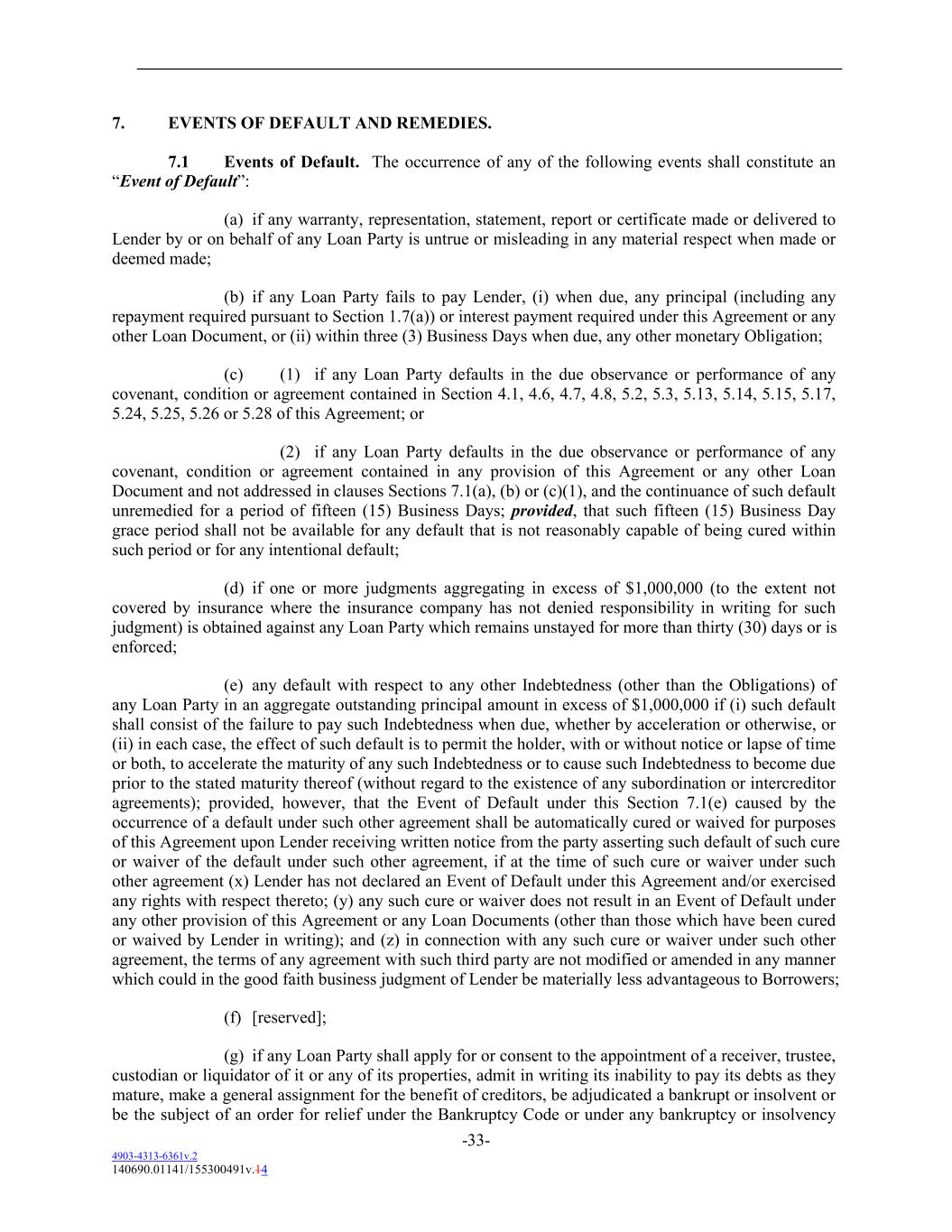 7. EVENTS OF DEFAULT AND REMEDIES. 7.1 Events of Default. The occurrence of any of the following events shall constitute an “Event of Default”: (a) if any warranty, representation, statement, report or certificate made or delivered to Lender by or on behalf of any Loan Party is untrue or misleading in any material respect when made or deemed made; (b) if any Loan Party fails to pay Lender, (i) when due, any principal (including any repayment required pursuant to Section 1.7(a)) or interest payment required under this Agreement or any other Loan Document, or (ii) within three (3) Business Days when due, any other monetary Obligation; (c) (1) if any Loan Party defaults in the due observance or performance of any covenant, condition or agreement contained in Section 4.1, 4.6, 4.7, 4.8, 5.2, 5.3, 5.13, 5.14, 5.15, 5.17, 5.24, 5.25, 5.26 or 5.28 of this Agreement; or (2) if any Loan Party defaults in the due observance or performance of any covenant, condition or agreement contained in any provision of this Agreement or any other Loan Document and not addressed in clauses Sections 7.1(a), (b) or (c)(1), and the continuance of such default unremedied for a period of fifteen (15) Business Days; provided, that such fifteen (15) Business Day grace period shall not be available for any default that is not reasonably capable of being cured within such period or for any intentional default; (d) if one or more judgments aggregating in excess of $1,000,000 (to the extent not covered by insurance where the insurance company has not denied responsibility in writing for such judgment) is obtained against any Loan Party which remains unstayed for more than thirty (30) days or is enforced; (e) any default with respect to any other Indebtedness (other than the Obligations) of any Loan Party in an aggregate outstanding principal amount in excess of $1,000,000 if (i) such default shall consist of the failure to pay such Indebtedness when due, whether by acceleration or otherwise, or (ii) in each case, the effect of such default is to permit the holder, with or without notice or lapse of time or both, to accelerate the maturity of any such Indebtedness or to cause such Indebtedness to become due prior to the stated maturity thereof (without regard to the existence of any subordination or intercreditor agreements); provided, however, that the Event of Default under this Section 7.1(e) caused by the occurrence of a default under such other agreement shall be automatically cured or waived for purposes of this Agreement upon Lender receiving written notice from the party asserting such default of such cure or waiver of the default under such other agreement, if at the time of such cure or waiver under such other agreement (x) Lender has not declared an Event of Default under this Agreement and/or exercised any rights with respect thereto; (y) any such cure or waiver does not result in an Event of Default under any other provision of this Agreement or any Loan Documents (other than those which have been cured or waived by Lender in writing); and (z) in connection with any such cure or waiver under such other agreement, the terms of any agreement with such third party are not modified or amended in any manner which could in the good faith business judgment of Lender be materially less advantageous to Borrowers; (f) [reserved]; (g) if any Loan Party shall apply for or consent to the appointment of a receiver, trustee, custodian or liquidator of it or any of its properties, admit in writing its inability to pay its debts as they mature, make a general assignment for the benefit of creditors, be adjudicated a bankrupt or insolvent or be the subject of an order for relief under the Bankruptcy Code or under any bankruptcy or insolvency -33- 4903-4313-6361v.2 140690.01141/155300491v.14