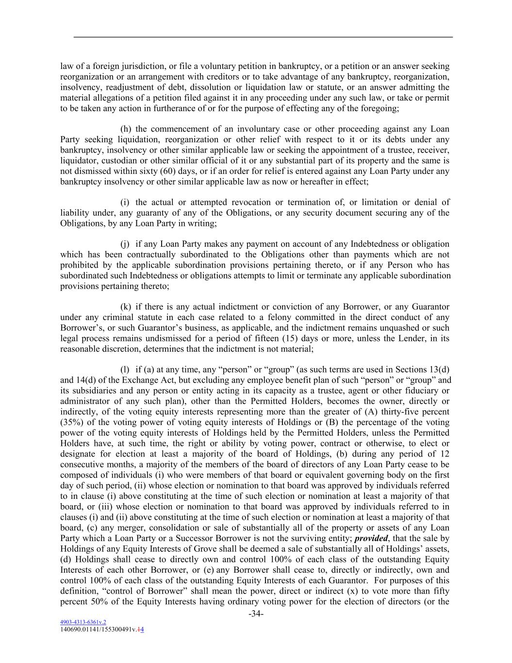 law of a foreign jurisdiction, or file a voluntary petition in bankruptcy, or a petition or an answer seeking reorganization or an arrangement with creditors or to take advantage of any bankruptcy, reorganization, insolvency, readjustment of debt, dissolution or liquidation law or statute, or an answer admitting the material allegations of a petition filed against it in any proceeding under any such law, or take or permit to be taken any action in furtherance of or for the purpose of effecting any of the foregoing; (h) the commencement of an involuntary case or other proceeding against any Loan Party seeking liquidation, reorganization or other relief with respect to it or its debts under any bankruptcy, insolvency or other similar applicable law or seeking the appointment of a trustee, receiver, liquidator, custodian or other similar official of it or any substantial part of its property and the same is not dismissed within sixty (60) days, or if an order for relief is entered against any Loan Party under any bankruptcy insolvency or other similar applicable law as now or hereafter in effect; (i) the actual or attempted revocation or termination of, or limitation or denial of liability under, any guaranty of any of the Obligations, or any security document securing any of the Obligations, by any Loan Party in writing; (j) if any Loan Party makes any payment on account of any Indebtedness or obligation which has been contractually subordinated to the Obligations other than payments which are not prohibited by the applicable subordination provisions pertaining thereto, or if any Person who has subordinated such Indebtedness or obligations attempts to limit or terminate any applicable subordination provisions pertaining thereto; (k) if there is any actual indictment or conviction of any Borrower, or any Guarantor under any criminal statute in each case related to a felony committed in the direct conduct of any Borrower’s, or such Guarantor’s business, as applicable, and the indictment remains unquashed or such legal process remains undismissed for a period of fifteen (15) days or more, unless the Lender, in its reasonable discretion, determines that the indictment is not material; (l) if (a) at any time, any “person” or “group” (as such terms are used in Sections 13(d) and 14(d) of the Exchange Act, but excluding any employee benefit plan of such “person” or “group” and its subsidiaries and any person or entity acting in its capacity as a trustee, agent or other fiduciary or administrator of any such plan), other than the Permitted Holders, becomes the owner, directly or indirectly, of the voting equity interests representing more than the greater of (A) thirty-five percent (35%) of the voting power of voting equity interests of Holdings or (B) the percentage of the voting power of the voting equity interests of Holdings held by the Permitted Holders, unless the Permitted Holders have, at such time, the right or ability by voting power, contract or otherwise, to elect or designate for election at least a majority of the board of Holdings, (b) during any period of 12 consecutive months, a majority of the members of the board of directors of any Loan Party cease to be composed of individuals (i) who were members of that board or equivalent governing body on the first day of such period, (ii) whose election or nomination to that board was approved by individuals referred to in clause (i) above constituting at the time of such election or nomination at least a majority of that board, or (iii) whose election or nomination to that board was approved by individuals referred to in clauses (i) and (ii) above constituting at the time of such election or nomination at least a majority of that board, (c) any merger, consolidation or sale of substantially all of the property or assets of any Loan Party which a Loan Party or a Successor Borrower is not the surviving entity; provided, that the sale by Holdings of any Equity Interests of Grove shall be deemed a sale of substantially all of Holdings’ assets, (d) Holdings shall cease to directly own and control 100% of each class of the outstanding Equity Interests of each other Borrower, or (e) any Borrower shall cease to, directly or indirectly, own and control 100% of each class of the outstanding Equity Interests of each Guarantor. For purposes of this definition, “control of Borrower” shall mean the power, direct or indirect (x) to vote more than fifty percent 50% of the Equity Interests having ordinary voting power for the election of directors (or the -34- 4903-4313-6361v.2 140690.01141/155300491v.14