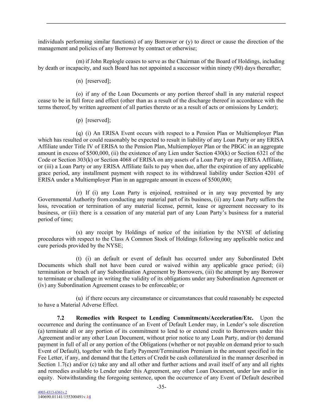 individuals performing similar functions) of any Borrower or (y) to direct or cause the direction of the management and policies of any Borrower by contract or otherwise; (m) if John Replogle ceases to serve as the Chairman of the Board of Holdings, including by death or incapacity, and such Board has not appointed a successor within ninety (90) days thereafter; (n) [reserved]; (o) if any of the Loan Documents or any portion thereof shall in any material respect cease to be in full force and effect (other than as a result of the discharge thereof in accordance with the terms thereof, by written agreement of all parties thereto or as a result of acts or omissions by Lender); (p) [reserved]; (q) (i) An ERISA Event occurs with respect to a Pension Plan or Multiemployer Plan which has resulted or could reasonably be expected to result in liability of any Loan Party or any ERISA Affiliate under Title IV of ERISA to the Pension Plan, Multiemployer Plan or the PBGC in an aggregate amount in excess of $500,000, (ii) the existence of any Lien under Section 430(k) or Section 6321 of the Code or Section 303(k) or Section 4068 of ERISA on any assets of a Loan Party or any ERISA Affiliate, or (iii) a Loan Party or any ERISA Affiliate fails to pay when due, after the expiration of any applicable grace period, any installment payment with respect to its withdrawal liability under Section 4201 of ERISA under a Multiemployer Plan in an aggregate amount in excess of $500,000; (r) If (i) any Loan Party is enjoined, restrained or in any way prevented by any Governmental Authority from conducting any material part of its business, (ii) any Loan Party suffers the loss, revocation or termination of any material license, permit, lease or agreement necessary to its business, or (iii) there is a cessation of any material part of any Loan Party’s business for a material period of time; (s) any receipt by Holdings of notice of the initiation by the NYSE of delisting procedures with respect to the Class A Common Stock of Holdings following any applicable notice and cure periods provided by the NYSE; (t) (i) an default or event of default has occurred under any Subordinated Debt Documents which shall not have been cured or waived within any applicable grace period; (ii) termination or breach of any Subordination Agreement by Borrowers, (iii) the attempt by any Borrower to terminate or challenge in writing the validity of its obligations under any Subordination Agreement or (iv) any Subordination Agreement ceases to be enforceable; or (u) if there occurs any circumstance or circumstances that could reasonably be expected to have a Material Adverse Effect. 7.2 Remedies with Respect to Lending Commitments/Acceleration/Etc. Upon the occurrence and during the continuance of an Event of Default Lender may, in Lender’s sole discretion (a) terminate all or any portion of its commitment to lend to or extend credit to Borrowers under this Agreement and/or any other Loan Document, without prior notice to any Loan Party, and/or (b) demand payment in full of all or any portion of the Obligations (whether or not payable on demand prior to such Event of Default), together with the Early Payment/Termination Premium in the amount specified in the Fee Letter, if any, and demand that the Letters of Credit be cash collateralized in the manner described in Section 1.7(c) and/or (c) take any and all other and further actions and avail itself of any and all rights and remedies available to Lender under this Agreement, any other Loan Document, under law and/or in equity. Notwithstanding the foregoing sentence, upon the occurrence of any Event of Default described -35- 4903-4313-6361v.2 140690.01141/155300491v.14