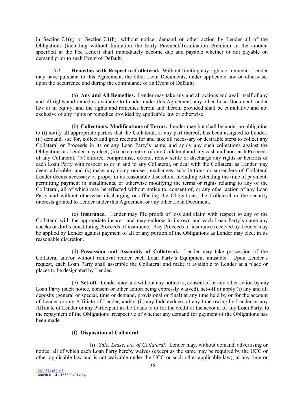 in Section 7.1(g) or Section 7.1(h), without notice, demand or other action by Lender all of the Obligations (including without limitation the Early Payment/Termination Premium in the amount specified in the Fee Letter) shall immediately become due and payable whether or not payable on demand prior to such Event of Default. 7.3 Remedies with Respect to Collateral. Without limiting any rights or remedies Lender may have pursuant to this Agreement, the other Loan Documents, under applicable law or otherwise, upon the occurrence and during the continuance of an Event of Default: (a) Any and All Remedies. Lender may take any and all actions and avail itself of any and all rights and remedies available to Lender under this Agreement, any other Loan Document, under law or in equity, and the rights and remedies herein and therein provided shall be cumulative and not exclusive of any rights or remedies provided by applicable law or otherwise. (b) Collections; Modifications of Terms. Lender may but shall be under no obligation to (i) notify all appropriate parties that the Collateral, or any part thereof, has been assigned to Lender; (ii) demand, sue for, collect and give receipts for and take all necessary or desirable steps to collect any Collateral or Proceeds in its or any Loan Party’s name, and apply any such collections against the Obligations as Lender may elect; (iii) take control of any Collateral and any cash and non-cash Proceeds of any Collateral; (iv) enforce, compromise, extend, renew settle or discharge any rights or benefits of each Loan Party with respect to or in and to any Collateral, or deal with the Collateral as Lender may deem advisable; and (v) make any compromises, exchanges, substitutions or surrenders of Collateral Lender deems necessary or proper in its reasonable discretion, including extending the time of payment, permitting payment in installments, or otherwise modifying the terms or rights relating to any of the Collateral, all of which may be effected without notice to, consent of, or any other action of any Loan Party and without otherwise discharging or affecting the Obligations, the Collateral or the security interests granted to Lender under this Agreement or any other Loan Document. (c) Insurance. Lender may file proofs of loss and claim with respect to any of the Collateral with the appropriate insurer, and may endorse in its own and each Loan Party’s name any checks or drafts constituting Proceeds of insurance. Any Proceeds of insurance received by Lender may be applied by Lender against payment of all or any portion of the Obligations as Lender may elect in its reasonable discretion. (d) Possession and Assembly of Collateral. Lender may take possession of the Collateral and/or without removal render each Loan Party’s Equipment unusable. Upon Lender’s request, each Loan Party shall assemble the Collateral and make it available to Lender at a place or places to be designated by Lender. (e) Set-off. Lender may and without any notice to, consent of or any other action by any Loan Party (such notice, consent or other action being expressly waived), set-off or apply (i) any and all deposits (general or special, time or demand, provisional or final) at any time held by or for the account of Lender or any Affiliate of Lender, and/or (ii) any Indebtedness at any time owing by Lender or any Affiliate of Lender or any Participant in the Loans to or for the credit or the account of any Loan Party, to the repayment of the Obligations irrespective of whether any demand for payment of the Obligations has been made. (f) Disposition of Collateral. (i) Sale, Lease, etc. of Collateral. Lender may, without demand, advertising or notice, all of which each Loan Party hereby waives (except as the same may be required by the UCC or other applicable law and is not waivable under the UCC or such other applicable law), at any time or -36- 4903-4313-6361v.2 140690.01141/155300491v.14