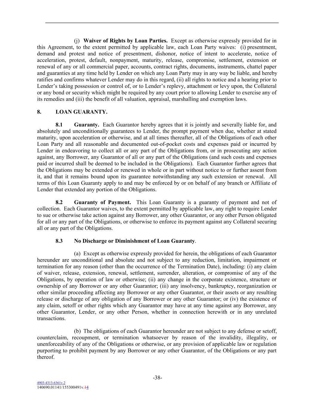 (j) Waiver of Rights by Loan Parties. Except as otherwise expressly provided for in this Agreement, to the extent permitted by applicable law, each Loan Party waives: (i) presentment, demand and protest and notice of presentment, dishonor, notice of intent to accelerate, notice of acceleration, protest, default, nonpayment, maturity, release, compromise, settlement, extension or renewal of any or all commercial paper, accounts, contract rights, documents, instruments, chattel paper and guaranties at any time held by Lender on which any Loan Party may in any way be liable, and hereby ratifies and confirms whatever Lender may do in this regard, (ii) all rights to notice and a hearing prior to Lender’s taking possession or control of, or to Lender’s replevy, attachment or levy upon, the Collateral or any bond or security which might be required by any court prior to allowing Lender to exercise any of its remedies and (iii) the benefit of all valuation, appraisal, marshalling and exemption laws. 8. LOAN GUARANTY. 8.1 Guaranty. Each Guarantor hereby agrees that it is jointly and severally liable for, and absolutely and unconditionally guarantees to Lender, the prompt payment when due, whether at stated maturity, upon acceleration or otherwise, and at all times thereafter, all of the Obligations of each other Loan Party and all reasonable and documented out-of-pocket costs and expenses paid or incurred by Lender in endeavoring to collect all or any part of the Obligations from, or in prosecuting any action against, any Borrower, any Guarantor of all or any part of the Obligations (and such costs and expenses paid or incurred shall be deemed to be included in the Obligations). Each Guarantor further agrees that the Obligations may be extended or renewed in whole or in part without notice to or further assent from it, and that it remains bound upon its guarantee notwithstanding any such extension or renewal. All terms of this Loan Guaranty apply to and may be enforced by or on behalf of any branch or Affiliate of Lender that extended any portion of the Obligations. 8.2 Guaranty of Payment. This Loan Guaranty is a guaranty of payment and not of collection. Each Guarantor waives, to the extent permitted by applicable law, any right to require Lender to sue or otherwise take action against any Borrower, any other Guarantor, or any other Person obligated for all or any part of the Obligations, or otherwise to enforce its payment against any Collateral securing all or any part of the Obligations. 8.3 No Discharge or Diminishment of Loan Guaranty. (a) Except as otherwise expressly provided for herein, the obligations of each Guarantor hereunder are unconditional and absolute and not subject to any reduction, limitation, impairment or termination for any reason (other than the occurrence of the Termination Date), including: (i) any claim of waiver, release, extension, renewal, settlement, surrender, alteration, or compromise of any of the Obligations, by operation of law or otherwise; (ii) any change in the corporate existence, structure or ownership of any Borrower or any other Guarantor; (iii) any insolvency, bankruptcy, reorganization or other similar proceeding affecting any Borrower or any other Guarantor, or their assets or any resulting release or discharge of any obligation of any Borrower or any other Guarantor; or (iv) the existence of any claim, setoff or other rights which any Guarantor may have at any time against any Borrower, any other Guarantor, Lender, or any other Person, whether in connection herewith or in any unrelated transactions. (b) The obligations of each Guarantor hereunder are not subject to any defense or setoff, counterclaim, recoupment, or termination whatsoever by reason of the invalidity, illegality, or unenforceability of any of the Obligations or otherwise, or any provision of applicable law or regulation purporting to prohibit payment by any Borrower or any other Guarantor, of the Obligations or any part thereof. -38- 4903-4313-6361v.2 140690.01141/155300491v.14