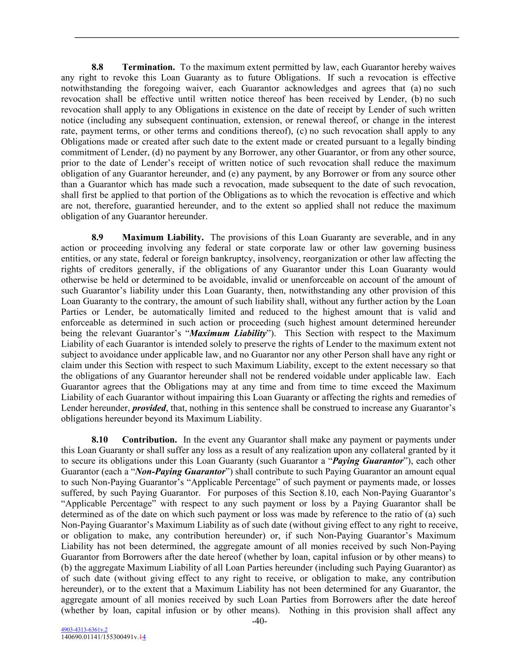 8.8 Termination. To the maximum extent permitted by law, each Guarantor hereby waives any right to revoke this Loan Guaranty as to future Obligations. If such a revocation is effective notwithstanding the foregoing waiver, each Guarantor acknowledges and agrees that (a) no such revocation shall be effective until written notice thereof has been received by Lender, (b) no such revocation shall apply to any Obligations in existence on the date of receipt by Lender of such written notice (including any subsequent continuation, extension, or renewal thereof, or change in the interest rate, payment terms, or other terms and conditions thereof), (c) no such revocation shall apply to any Obligations made or created after such date to the extent made or created pursuant to a legally binding commitment of Lender, (d) no payment by any Borrower, any other Guarantor, or from any other source, prior to the date of Lender’s receipt of written notice of such revocation shall reduce the maximum obligation of any Guarantor hereunder, and (e) any payment, by any Borrower or from any source other than a Guarantor which has made such a revocation, made subsequent to the date of such revocation, shall first be applied to that portion of the Obligations as to which the revocation is effective and which are not, therefore, guarantied hereunder, and to the extent so applied shall not reduce the maximum obligation of any Guarantor hereunder. 8.9 Maximum Liability. The provisions of this Loan Guaranty are severable, and in any action or proceeding involving any federal or state corporate law or other law governing business entities, or any state, federal or foreign bankruptcy, insolvency, reorganization or other law affecting the rights of creditors generally, if the obligations of any Guarantor under this Loan Guaranty would otherwise be held or determined to be avoidable, invalid or unenforceable on account of the amount of such Guarantor’s liability under this Loan Guaranty, then, notwithstanding any other provision of this Loan Guaranty to the contrary, the amount of such liability shall, without any further action by the Loan Parties or Lender, be automatically limited and reduced to the highest amount that is valid and enforceable as determined in such action or proceeding (such highest amount determined hereunder being the relevant Guarantor’s “Maximum Liability”). This Section with respect to the Maximum Liability of each Guarantor is intended solely to preserve the rights of Lender to the maximum extent not subject to avoidance under applicable law, and no Guarantor nor any other Person shall have any right or claim under this Section with respect to such Maximum Liability, except to the extent necessary so that the obligations of any Guarantor hereunder shall not be rendered voidable under applicable law. Each Guarantor agrees that the Obligations may at any time and from time to time exceed the Maximum Liability of each Guarantor without impairing this Loan Guaranty or affecting the rights and remedies of Lender hereunder, provided, that, nothing in this sentence shall be construed to increase any Guarantor’s obligations hereunder beyond its Maximum Liability. 8.10 Contribution. In the event any Guarantor shall make any payment or payments under this Loan Guaranty or shall suffer any loss as a result of any realization upon any collateral granted by it to secure its obligations under this Loan Guaranty (such Guarantor a “Paying Guarantor”), each other Guarantor (each a “Non-Paying Guarantor”) shall contribute to such Paying Guarantor an amount equal to such Non-Paying Guarantor’s “Applicable Percentage” of such payment or payments made, or losses suffered, by such Paying Guarantor. For purposes of this Section 8.10, each Non-Paying Guarantor’s “Applicable Percentage” with respect to any such payment or loss by a Paying Guarantor shall be determined as of the date on which such payment or loss was made by reference to the ratio of (a) such Non-Paying Guarantor’s Maximum Liability as of such date (without giving effect to any right to receive, or obligation to make, any contribution hereunder) or, if such Non-Paying Guarantor’s Maximum Liability has not been determined, the aggregate amount of all monies received by such Non-Paying Guarantor from Borrowers after the date hereof (whether by loan, capital infusion or by other means) to (b) the aggregate Maximum Liability of all Loan Parties hereunder (including such Paying Guarantor) as of such date (without giving effect to any right to receive, or obligation to make, any contribution hereunder), or to the extent that a Maximum Liability has not been determined for any Guarantor, the aggregate amount of all monies received by such Loan Parties from Borrowers after the date hereof (whether by loan, capital infusion or by other means). Nothing in this provision shall affect any -40- 4903-4313-6361v.2 140690.01141/155300491v.14