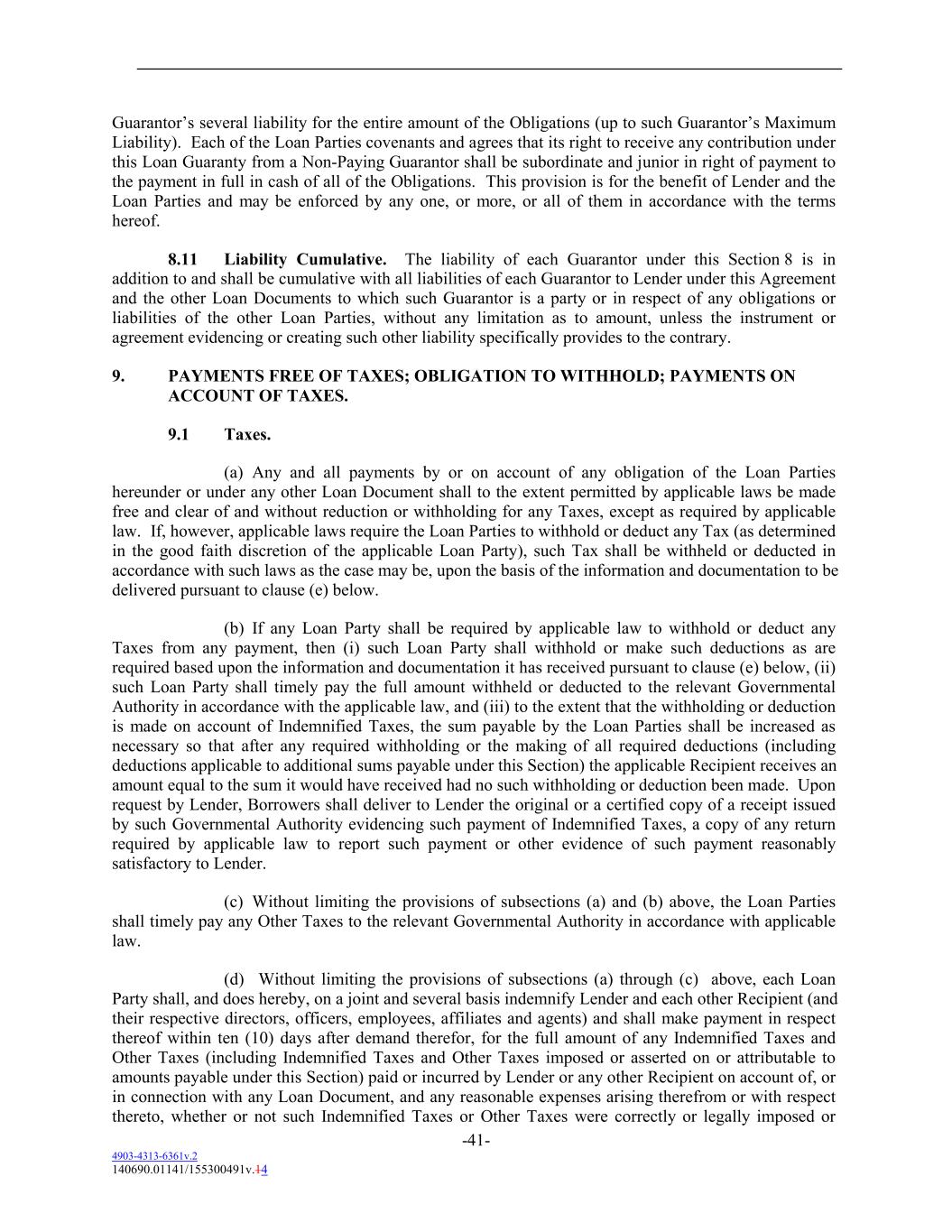 Guarantor’s several liability for the entire amount of the Obligations (up to such Guarantor’s Maximum Liability). Each of the Loan Parties covenants and agrees that its right to receive any contribution under this Loan Guaranty from a Non-Paying Guarantor shall be subordinate and junior in right of payment to the payment in full in cash of all of the Obligations. This provision is for the benefit of Lender and the Loan Parties and may be enforced by any one, or more, or all of them in accordance with the terms hereof. 8.11 Liability Cumulative. The liability of each Guarantor under this Section 8 is in addition to and shall be cumulative with all liabilities of each Guarantor to Lender under this Agreement and the other Loan Documents to which such Guarantor is a party or in respect of any obligations or liabilities of the other Loan Parties, without any limitation as to amount, unless the instrument or agreement evidencing or creating such other liability specifically provides to the contrary. 9. PAYMENTS FREE OF TAXES; OBLIGATION TO WITHHOLD; PAYMENTS ON ACCOUNT OF TAXES. 9.1 Taxes. (a) Any and all payments by or on account of any obligation of the Loan Parties hereunder or under any other Loan Document shall to the extent permitted by applicable laws be made free and clear of and without reduction or withholding for any Taxes, except as required by applicable law. If, however, applicable laws require the Loan Parties to withhold or deduct any Tax (as determined in the good faith discretion of the applicable Loan Party), such Tax shall be withheld or deducted in accordance with such laws as the case may be, upon the basis of the information and documentation to be delivered pursuant to clause (e) below. (b) If any Loan Party shall be required by applicable law to withhold or deduct any Taxes from any payment, then (i) such Loan Party shall withhold or make such deductions as are required based upon the information and documentation it has received pursuant to clause (e) below, (ii) such Loan Party shall timely pay the full amount withheld or deducted to the relevant Governmental Authority in accordance with the applicable law, and (iii) to the extent that the withholding or deduction is made on account of Indemnified Taxes, the sum payable by the Loan Parties shall be increased as necessary so that after any required withholding or the making of all required deductions (including deductions applicable to additional sums payable under this Section) the applicable Recipient receives an amount equal to the sum it would have received had no such withholding or deduction been made. Upon request by Lender, Borrowers shall deliver to Lender the original or a certified copy of a receipt issued by such Governmental Authority evidencing such payment of Indemnified Taxes, a copy of any return required by applicable law to report such payment or other evidence of such payment reasonably satisfactory to Lender. (c) Without limiting the provisions of subsections (a) and (b) above, the Loan Parties shall timely pay any Other Taxes to the relevant Governmental Authority in accordance with applicable law. (d) Without limiting the provisions of subsections (a) through (c) above, each Loan Party shall, and does hereby, on a joint and several basis indemnify Lender and each other Recipient (and their respective directors, officers, employees, affiliates and agents) and shall make payment in respect thereof within ten (10) days after demand therefor, for the full amount of any Indemnified Taxes and Other Taxes (including Indemnified Taxes and Other Taxes imposed or asserted on or attributable to amounts payable under this Section) paid or incurred by Lender or any other Recipient on account of, or in connection with any Loan Document, and any reasonable expenses arising therefrom or with respect thereto, whether or not such Indemnified Taxes or Other Taxes were correctly or legally imposed or -41- 4903-4313-6361v.2 140690.01141/155300491v.14