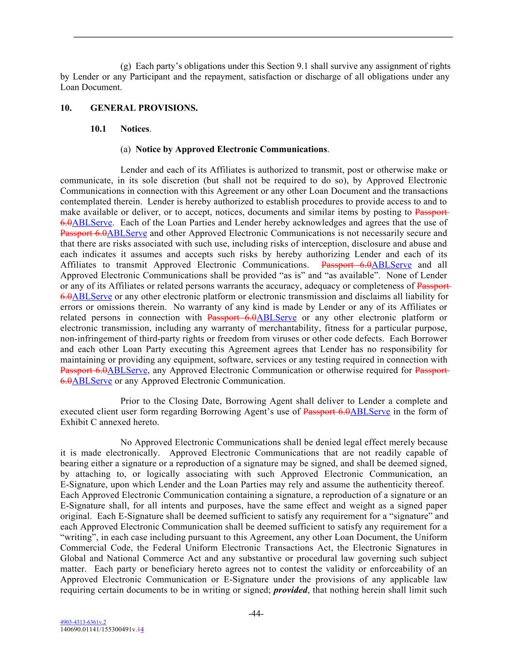 (g) Each party’s obligations under this Section 9.1 shall survive any assignment of rights by Lender or any Participant and the repayment, satisfaction or discharge of all obligations under any Loan Document. 10. GENERAL PROVISIONS. 10.1 Notices. (a) Notice by Approved Electronic Communications. Lender and each of its Affiliates is authorized to transmit, post or otherwise make or communicate, in its sole discretion (but shall not be required to do so), by Approved Electronic Communications in connection with this Agreement or any other Loan Document and the transactions contemplated therein. Lender is hereby authorized to establish procedures to provide access to and to make available or deliver, or to accept, notices, documents and similar items by posting to Passport 6.0ABLServe. Each of the Loan Parties and Lender hereby acknowledges and agrees that the use of Passport 6.0ABLServe and other Approved Electronic Communications is not necessarily secure and that there are risks associated with such use, including risks of interception, disclosure and abuse and each indicates it assumes and accepts such risks by hereby authorizing Lender and each of its Affiliates to transmit Approved Electronic Communications. Passport 6.0ABLServe and all Approved Electronic Communications shall be provided “as is” and “as available”. None of Lender or any of its Affiliates or related persons warrants the accuracy, adequacy or completeness of Passport 6.0ABLServe or any other electronic platform or electronic transmission and disclaims all liability for errors or omissions therein. No warranty of any kind is made by Lender or any of its Affiliates or related persons in connection with Passport 6.0ABLServe or any other electronic platform or electronic transmission, including any warranty of merchantability, fitness for a particular purpose, non-infringement of third-party rights or freedom from viruses or other code defects. Each Borrower and each other Loan Party executing this Agreement agrees that Lender has no responsibility for maintaining or providing any equipment, software, services or any testing required in connection with Passport 6.0ABLServe, any Approved Electronic Communication or otherwise required for Passport 6.0ABLServe or any Approved Electronic Communication. Prior to the Closing Date, Borrowing Agent shall deliver to Lender a complete and executed client user form regarding Borrowing Agent’s use of Passport 6.0ABLServe in the form of Exhibit C annexed hereto. No Approved Electronic Communications shall be denied legal effect merely because it is made electronically. Approved Electronic Communications that are not readily capable of bearing either a signature or a reproduction of a signature may be signed, and shall be deemed signed, by attaching to, or logically associating with such Approved Electronic Communication, an E-Signature, upon which Lender and the Loan Parties may rely and assume the authenticity thereof. Each Approved Electronic Communication containing a signature, a reproduction of a signature or an E-Signature shall, for all intents and purposes, have the same effect and weight as a signed paper original. Each E-Signature shall be deemed sufficient to satisfy any requirement for a “signature” and each Approved Electronic Communication shall be deemed sufficient to satisfy any requirement for a “writing”, in each case including pursuant to this Agreement, any other Loan Document, the Uniform Commercial Code, the Federal Uniform Electronic Transactions Act, the Electronic Signatures in Global and National Commerce Act and any substantive or procedural law governing such subject matter. Each party or beneficiary hereto agrees not to contest the validity or enforceability of an Approved Electronic Communication or E-Signature under the provisions of any applicable law requiring certain documents to be in writing or signed; provided, that nothing herein shall limit such -44- 4903-4313-6361v.2 140690.01141/155300491v.14
