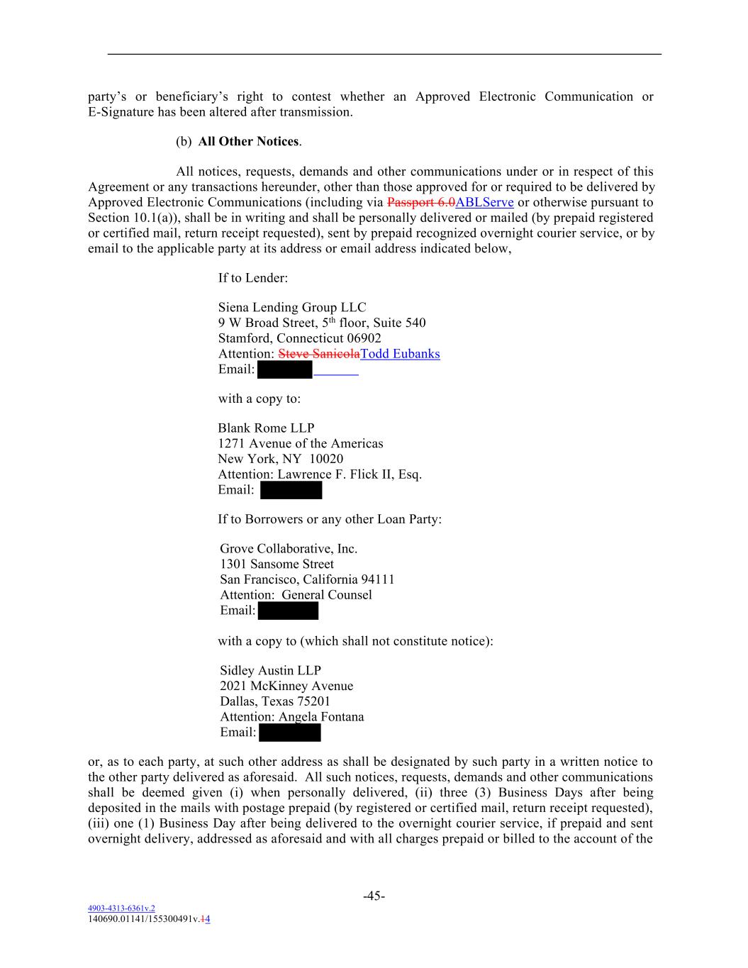 party’s or beneficiary’s right to contest whether an Approved Electronic Communication or E-Signature has been altered after transmission. (b) All Other Notices. All notices, requests, demands and other communications under or in respect of this Agreement or any transactions hereunder, other than those approved for or required to be delivered by Approved Electronic Communications (including via Passport 6.0ABLServe or otherwise pursuant to Section 10.1(a)), shall be in writing and shall be personally delivered or mailed (by prepaid registered or certified mail, return receipt requested), sent by prepaid recognized overnight courier service, or by email to the applicable party at its address or email address indicated below, If to Lender: Siena Lending Group LLC 9 W Broad Street, 5th floor, Suite 540 Stamford, Connecticut 06902 Attention: Steve SanicolaTodd Eubanks Email: with a copy to: Blank Rome LLP 1271 Avenue of the Americas New York, NY 10020 Attention: Lawrence F. Flick II, Esq. Email: If to Borrowers or any other Loan Party: Grove Collaborative, Inc. 1301 Sansome Street San Francisco, California 94111 Attention: General Counsel Email: with a copy to (which shall not constitute notice): Sidley Austin LLP 2021 McKinney Avenue Dallas, Texas 75201 Attention: Angela Fontana Email: or, as to each party, at such other address as shall be designated by such party in a written notice to the other party delivered as aforesaid. All such notices, requests, demands and other communications shall be deemed given (i) when personally delivered, (ii) three (3) Business Days after being deposited in the mails with postage prepaid (by registered or certified mail, return receipt requested), (iii) one (1) Business Day after being delivered to the overnight courier service, if prepaid and sent overnight delivery, addressed as aforesaid and with all charges prepaid or billed to the account of the -45- 4903-4313-6361v.2 140690.01141/155300491v.14