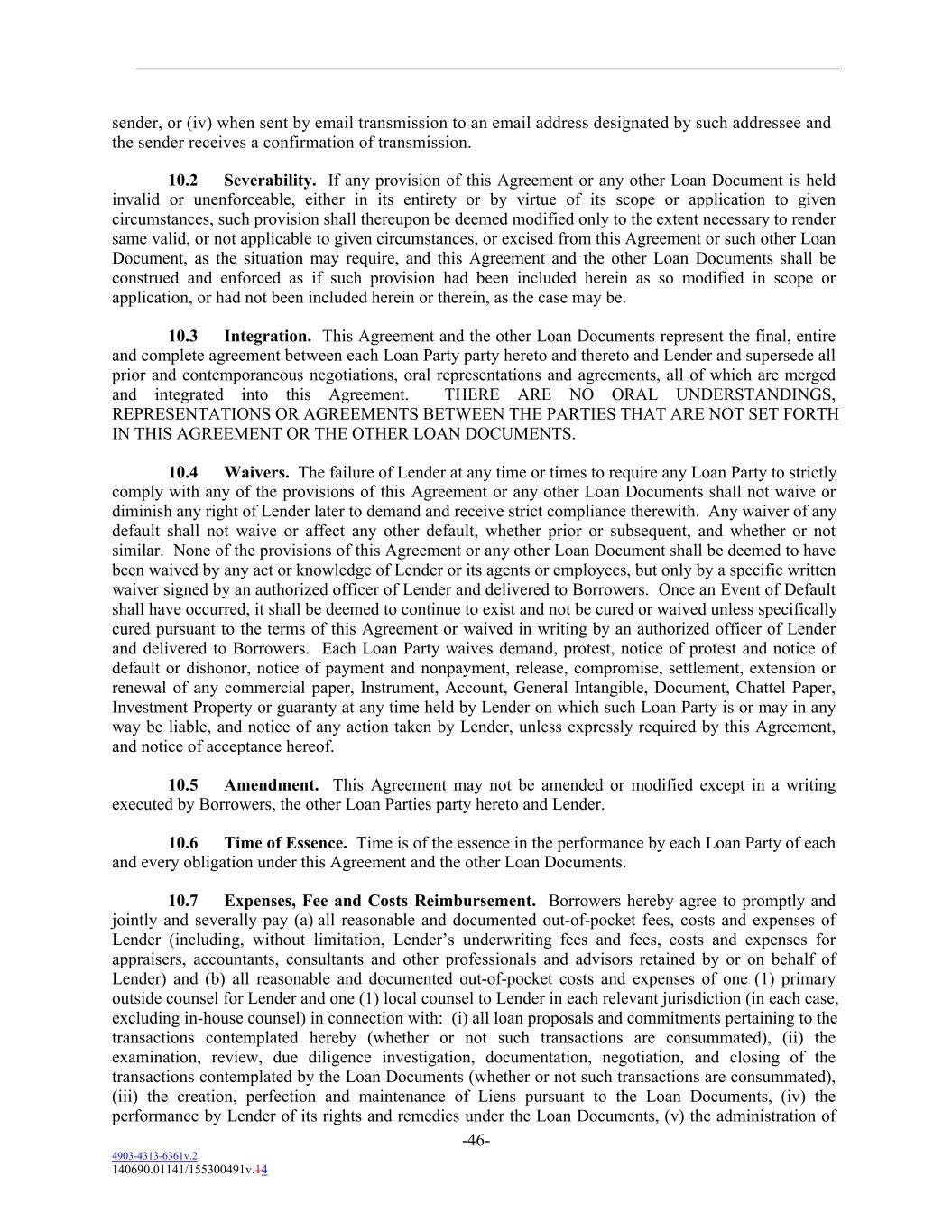 sender, or (iv) when sent by email transmission to an email address designated by such addressee and the sender receives a confirmation of transmission. 10.2 Severability. If any provision of this Agreement or any other Loan Document is held invalid or unenforceable, either in its entirety or by virtue of its scope or application to given circumstances, such provision shall thereupon be deemed modified only to the extent necessary to render same valid, or not applicable to given circumstances, or excised from this Agreement or such other Loan Document, as the situation may require, and this Agreement and the other Loan Documents shall be construed and enforced as if such provision had been included herein as so modified in scope or application, or had not been included herein or therein, as the case may be. 10.3 Integration. This Agreement and the other Loan Documents represent the final, entire and complete agreement between each Loan Party party hereto and thereto and Lender and supersede all prior and contemporaneous negotiations, oral representations and agreements, all of which are merged and integrated into this Agreement. THERE ARE NO ORAL UNDERSTANDINGS, REPRESENTATIONS OR AGREEMENTS BETWEEN THE PARTIES THAT ARE NOT SET FORTH IN THIS AGREEMENT OR THE OTHER LOAN DOCUMENTS. 10.4 Waivers. The failure of Lender at any time or times to require any Loan Party to strictly comply with any of the provisions of this Agreement or any other Loan Documents shall not waive or diminish any right of Lender later to demand and receive strict compliance therewith. Any waiver of any default shall not waive or affect any other default, whether prior or subsequent, and whether or not similar. None of the provisions of this Agreement or any other Loan Document shall be deemed to have been waived by any act or knowledge of Lender or its agents or employees, but only by a specific written waiver signed by an authorized officer of Lender and delivered to Borrowers. Once an Event of Default shall have occurred, it shall be deemed to continue to exist and not be cured or waived unless specifically cured pursuant to the terms of this Agreement or waived in writing by an authorized officer of Lender and delivered to Borrowers. Each Loan Party waives demand, protest, notice of protest and notice of default or dishonor, notice of payment and nonpayment, release, compromise, settlement, extension or renewal of any commercial paper, Instrument, Account, General Intangible, Document, Chattel Paper, Investment Property or guaranty at any time held by Lender on which such Loan Party is or may in any way be liable, and notice of any action taken by Lender, unless expressly required by this Agreement, and notice of acceptance hereof. 10.5 Amendment. This Agreement may not be amended or modified except in a writing executed by Borrowers, the other Loan Parties party hereto and Lender. 10.6 Time of Essence. Time is of the essence in the performance by each Loan Party of each and every obligation under this Agreement and the other Loan Documents. 10.7 Expenses, Fee and Costs Reimbursement. Borrowers hereby agree to promptly and jointly and severally pay (a) all reasonable and documented out-of-pocket fees, costs and expenses of Lender (including, without limitation, Lender’s underwriting fees and fees, costs and expenses for appraisers, accountants, consultants and other professionals and advisors retained by or on behalf of Lender) and (b) all reasonable and documented out-of-pocket costs and expenses of one (1) primary outside counsel for Lender and one (1) local counsel to Lender in each relevant jurisdiction (in each case, excluding in-house counsel) in connection with: (i) all loan proposals and commitments pertaining to the transactions contemplated hereby (whether or not such transactions are consummated), (ii) the examination, review, due diligence investigation, documentation, negotiation, and closing of the transactions contemplated by the Loan Documents (whether or not such transactions are consummated), (iii) the creation, perfection and maintenance of Liens pursuant to the Loan Documents, (iv) the performance by Lender of its rights and remedies under the Loan Documents, (v) the administration of -46- 4903-4313-6361v.2 140690.01141/155300491v.14