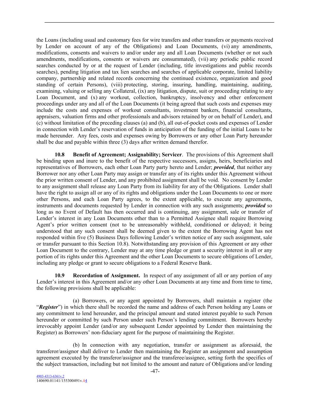 the Loans (including usual and customary fees for wire transfers and other transfers or payments received by Lender on account of any of the Obligations) and Loan Documents, (vi) any amendments, modifications, consents and waivers to and/or under any and all Loan Documents (whether or not such amendments, modifications, consents or waivers are consummated), (vii) any periodic public record searches conducted by or at the request of Lender (including, title investigations and public records searches), pending litigation and tax lien searches and searches of applicable corporate, limited liability company, partnership and related records concerning the continued existence, organization and good standing of certain Persons), (viii) protecting, storing, insuring, handling, maintaining, auditing, examining, valuing or selling any Collateral, (ix) any litigation, dispute, suit or proceeding relating to any Loan Document, and (x) any workout, collection, bankruptcy, insolvency and other enforcement proceedings under any and all of the Loan Documents (it being agreed that such costs and expenses may include the costs and expenses of workout consultants, investment bankers, financial consultants, appraisers, valuation firms and other professionals and advisors retained by or on behalf of Lender), and (c) without limitation of the preceding clauses (a) and (b), all out-of-pocket costs and expenses of Lender in connection with Lender’s reservation of funds in anticipation of the funding of the initial Loans to be made hereunder. Any fees, costs and expenses owing by Borrowers or any other Loan Party hereunder shall be due and payable within three (3) days after written demand therefor. 10.8 Benefit of Agreement; Assignability; Servicer. The provisions of this Agreement shall be binding upon and inure to the benefit of the respective successors, assigns, heirs, beneficiaries and representatives of Borrowers, each other Loan Party party hereto and Lender; provided, that neither any Borrower nor any other Loan Party may assign or transfer any of its rights under this Agreement without the prior written consent of Lender, and any prohibited assignment shall be void. No consent by Lender to any assignment shall release any Loan Party from its liability for any of the Obligations. Lender shall have the right to assign all or any of its rights and obligations under the Loan Documents to one or more other Persons, and each Loan Party agrees, to the extent applicable, to execute any agreements, instruments and documents requested by Lender in connection with any such assignments; provided so long as no Event of Default has then occurred and is continuing, any assignment, sale or transfer of Lender’s interest in any Loan Documents other than to a Permitted Assignee shall require Borrowing Agent’s prior written consent (not to be unreasonably withheld, conditioned or delayed; it being understood that any such consent shall be deemed given to the extent the Borrowing Agent has not responded within five (5) Business Days following Lender’s written notice of any such assignment, sale or transfer pursuant to this Section 10.8). Notwithstanding any provision of this Agreement or any other Loan Document to the contrary, Lender may at any time pledge or grant a security interest in all or any portion of its rights under this Agreement and the other Loan Documents to secure obligations of Lender, including any pledge or grant to secure obligations to a Federal Reserve Bank. 10.9 Recordation of Assignment. In respect of any assignment of all or any portion of any Lender’s interest in this Agreement and/or any other Loan Documents at any time and from time to time, the following provisions shall be applicable: (a) Borrowers, or any agent appointed by Borrowers, shall maintain a register (the “Register”) in which there shall be recorded the name and address of each Person holding any Loans or any commitment to lend hereunder, and the principal amount and stated interest payable to such Person hereunder or committed by such Person under such Person’s lending commitment. Borrowers hereby irrevocably appoint Lender (and/or any subsequent Lender appointed by Lender then maintaining the Register) as Borrowers’ non-fiduciary agent for the purpose of maintaining the Register. (b) In connection with any negotiation, transfer or assignment as aforesaid, the transferor/assignor shall deliver to Lender then maintaining the Register an assignment and assumption agreement executed by the transferor/assignor and the transferee/assignee, setting forth the specifics of the subject transaction, including but not limited to the amount and nature of Obligations and/or lending -47- 4903-4313-6361v.2 140690.01141/155300491v.14