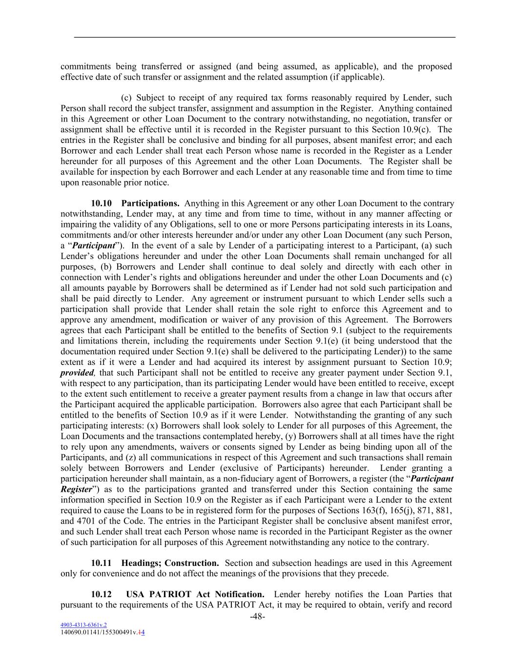 commitments being transferred or assigned (and being assumed, as applicable), and the proposed effective date of such transfer or assignment and the related assumption (if applicable). (c) Subject to receipt of any required tax forms reasonably required by Lender, such Person shall record the subject transfer, assignment and assumption in the Register. Anything contained in this Agreement or other Loan Document to the contrary notwithstanding, no negotiation, transfer or assignment shall be effective until it is recorded in the Register pursuant to this Section 10.9(c). The entries in the Register shall be conclusive and binding for all purposes, absent manifest error; and each Borrower and each Lender shall treat each Person whose name is recorded in the Register as a Lender hereunder for all purposes of this Agreement and the other Loan Documents. The Register shall be available for inspection by each Borrower and each Lender at any reasonable time and from time to time upon reasonable prior notice. 10.10 Participations. Anything in this Agreement or any other Loan Document to the contrary notwithstanding, Lender may, at any time and from time to time, without in any manner affecting or impairing the validity of any Obligations, sell to one or more Persons participating interests in its Loans, commitments and/or other interests hereunder and/or under any other Loan Document (any such Person, a “Participant”). In the event of a sale by Lender of a participating interest to a Participant, (a) such Lender’s obligations hereunder and under the other Loan Documents shall remain unchanged for all purposes, (b) Borrowers and Lender shall continue to deal solely and directly with each other in connection with Lender’s rights and obligations hereunder and under the other Loan Documents and (c) all amounts payable by Borrowers shall be determined as if Lender had not sold such participation and shall be paid directly to Lender. Any agreement or instrument pursuant to which Lender sells such a participation shall provide that Lender shall retain the sole right to enforce this Agreement and to approve any amendment, modification or waiver of any provision of this Agreement. The Borrowers agrees that each Participant shall be entitled to the benefits of Section 9.1 (subject to the requirements and limitations therein, including the requirements under Section 9.1(e) (it being understood that the documentation required under Section 9.1(e) shall be delivered to the participating Lender)) to the same extent as if it were a Lender and had acquired its interest by assignment pursuant to Section 10.9; provided, that such Participant shall not be entitled to receive any greater payment under Section 9.1, with respect to any participation, than its participating Lender would have been entitled to receive, except to the extent such entitlement to receive a greater payment results from a change in law that occurs after the Participant acquired the applicable participation. Borrowers also agree that each Participant shall be entitled to the benefits of Section 10.9 as if it were Lender. Notwithstanding the granting of any such participating interests: (x) Borrowers shall look solely to Lender for all purposes of this Agreement, the Loan Documents and the transactions contemplated hereby, (y) Borrowers shall at all times have the right to rely upon any amendments, waivers or consents signed by Lender as being binding upon all of the Participants, and (z) all communications in respect of this Agreement and such transactions shall remain solely between Borrowers and Lender (exclusive of Participants) hereunder. Lender granting a participation hereunder shall maintain, as a non-fiduciary agent of Borrowers, a register (the “Participant Register”) as to the participations granted and transferred under this Section containing the same information specified in Section 10.9 on the Register as if each Participant were a Lender to the extent required to cause the Loans to be in registered form for the purposes of Sections 163(f), 165(j), 871, 881, and 4701 of the Code. The entries in the Participant Register shall be conclusive absent manifest error, and such Lender shall treat each Person whose name is recorded in the Participant Register as the owner of such participation for all purposes of this Agreement notwithstanding any notice to the contrary. 10.11 Headings; Construction. Section and subsection headings are used in this Agreement only for convenience and do not affect the meanings of the provisions that they precede. 10.12 USA PATRIOT Act Notification. Lender hereby notifies the Loan Parties that pursuant to the requirements of the USA PATRIOT Act, it may be required to obtain, verify and record -48- 4903-4313-6361v.2 140690.01141/155300491v.14