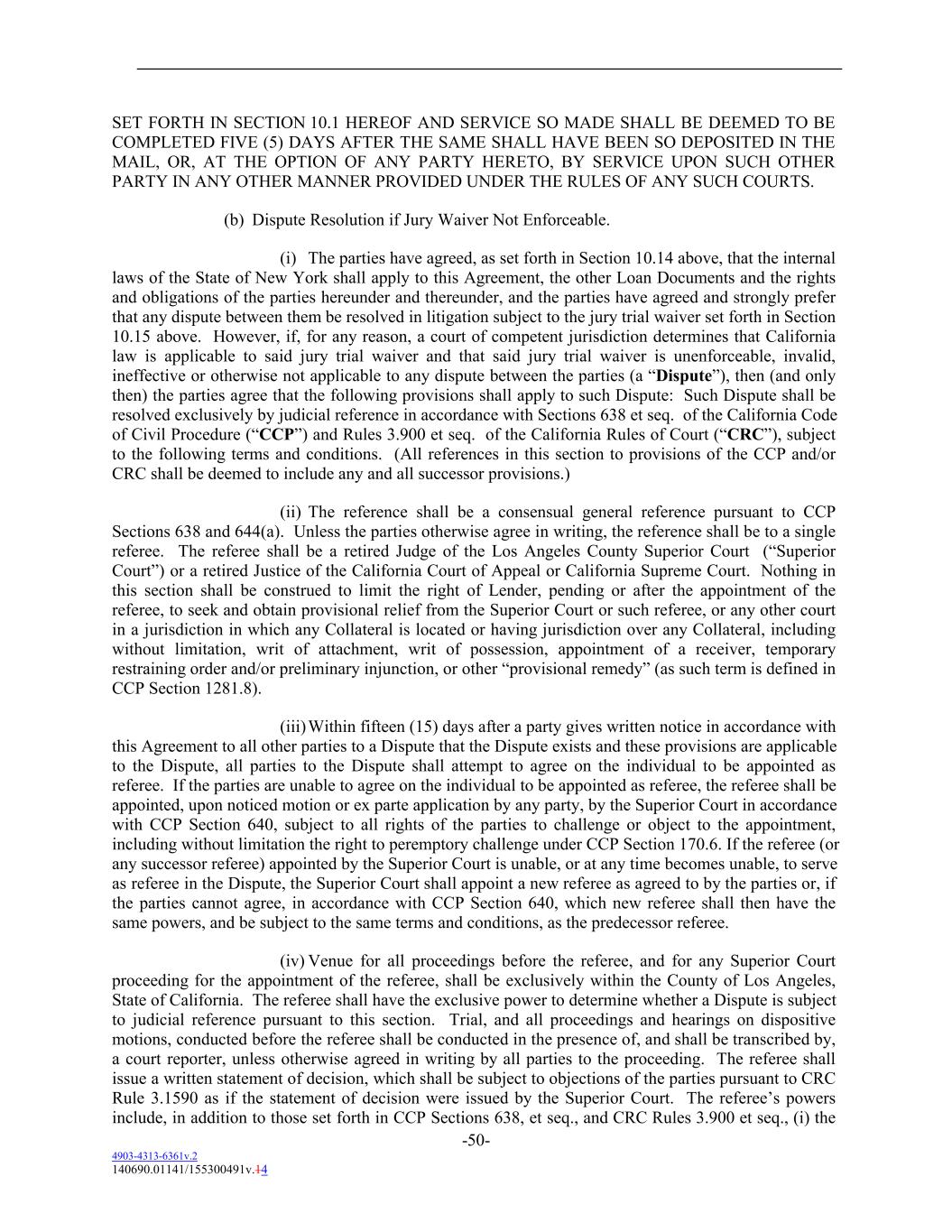 SET FORTH IN SECTION 10.1 HEREOF AND SERVICE SO MADE SHALL BE DEEMED TO BE COMPLETED FIVE (5) DAYS AFTER THE SAME SHALL HAVE BEEN SO DEPOSITED IN THE MAIL, OR, AT THE OPTION OF ANY PARTY HERETO, BY SERVICE UPON SUCH OTHER PARTY IN ANY OTHER MANNER PROVIDED UNDER THE RULES OF ANY SUCH COURTS. (b) Dispute Resolution if Jury Waiver Not Enforceable. (i) The parties have agreed, as set forth in Section 10.14 above, that the internal laws of the State of New York shall apply to this Agreement, the other Loan Documents and the rights and obligations of the parties hereunder and thereunder, and the parties have agreed and strongly prefer that any dispute between them be resolved in litigation subject to the jury trial waiver set forth in Section 10.15 above. However, if, for any reason, a court of competent jurisdiction determines that California law is applicable to said jury trial waiver and that said jury trial waiver is unenforceable, invalid, ineffective or otherwise not applicable to any dispute between the parties (a “Dispute”), then (and only then) the parties agree that the following provisions shall apply to such Dispute: Such Dispute shall be resolved exclusively by judicial reference in accordance with Sections 638 et seq. of the California Code of Civil Procedure (“CCP”) and Rules 3.900 et seq. of the California Rules of Court (“CRC”), subject to the following terms and conditions. (All references in this section to provisions of the CCP and/or CRC shall be deemed to include any and all successor provisions.) (ii) The reference shall be a consensual general reference pursuant to CCP Sections 638 and 644(a). Unless the parties otherwise agree in writing, the reference shall be to a single referee. The referee shall be a retired Judge of the Los Angeles County Superior Court (“Superior Court”) or a retired Justice of the California Court of Appeal or California Supreme Court. Nothing in this section shall be construed to limit the right of Lender, pending or after the appointment of the referee, to seek and obtain provisional relief from the Superior Court or such referee, or any other court in a jurisdiction in which any Collateral is located or having jurisdiction over any Collateral, including without limitation, writ of attachment, writ of possession, appointment of a receiver, temporary restraining order and/or preliminary injunction, or other “provisional remedy” (as such term is defined in CCP Section 1281.8). (iii)Within fifteen (15) days after a party gives written notice in accordance with this Agreement to all other parties to a Dispute that the Dispute exists and these provisions are applicable to the Dispute, all parties to the Dispute shall attempt to agree on the individual to be appointed as referee. If the parties are unable to agree on the individual to be appointed as referee, the referee shall be appointed, upon noticed motion or ex parte application by any party, by the Superior Court in accordance with CCP Section 640, subject to all rights of the parties to challenge or object to the appointment, including without limitation the right to peremptory challenge under CCP Section 170.6. If the referee (or any successor referee) appointed by the Superior Court is unable, or at any time becomes unable, to serve as referee in the Dispute, the Superior Court shall appoint a new referee as agreed to by the parties or, if the parties cannot agree, in accordance with CCP Section 640, which new referee shall then have the same powers, and be subject to the same terms and conditions, as the predecessor referee. (iv) Venue for all proceedings before the referee, and for any Superior Court proceeding for the appointment of the referee, shall be exclusively within the County of Los Angeles, State of California. The referee shall have the exclusive power to determine whether a Dispute is subject to judicial reference pursuant to this section. Trial, and all proceedings and hearings on dispositive motions, conducted before the referee shall be conducted in the presence of, and shall be transcribed by, a court reporter, unless otherwise agreed in writing by all parties to the proceeding. The referee shall issue a written statement of decision, which shall be subject to objections of the parties pursuant to CRC Rule 3.1590 as if the statement of decision were issued by the Superior Court. The referee’s powers include, in addition to those set forth in CCP Sections 638, et seq., and CRC Rules 3.900 et seq., (i) the -50- 4903-4313-6361v.2 140690.01141/155300491v.14