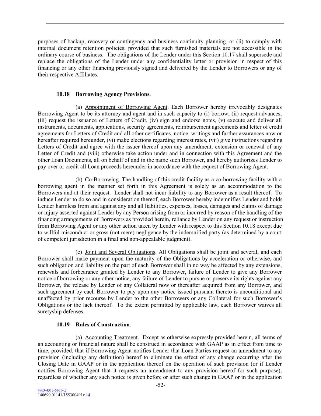 purposes of backup, recovery or contingency and business continuity planning, or (ii) to comply with internal document retention policies; provided that such furnished materials are not accessible in the ordinary course of business. The obligations of the Lender under this Section 10.17 shall supersede and replace the obligations of the Lender under any confidentiality letter or provision in respect of this financing or any other financing previously signed and delivered by the Lender to Borrowers or any of their respective Affiliates. 10.18 Borrowing Agency Provisions. (a) Appointment of Borrowing Agent. Each Borrower hereby irrevocably designates Borrowing Agent to be its attorney and agent and in such capacity to (i) borrow, (ii) request advances, (iii) request the issuance of Letters of Credit, (iv) sign and endorse notes, (v) execute and deliver all instruments, documents, applications, security agreements, reimbursement agreements and letter of credit agreements for Letters of Credit and all other certificates, notice, writings and further assurances now or hereafter required hereunder, (vi) make elections regarding interest rates, (vii) give instructions regarding Letters of Credit and agree with the issuer thereof upon any amendment, extension or renewal of any Letter of Credit and (viii) otherwise take action under and in connection with this Agreement and the other Loan Documents, all on behalf of and in the name such Borrower, and hereby authorizes Lender to pay over or credit all Loan proceeds hereunder in accordance with the request of Borrowing Agent. (b) Co-Borrowing. The handling of this credit facility as a co-borrowing facility with a borrowing agent in the manner set forth in this Agreement is solely as an accommodation to the Borrowers and at their request. Lender shall not incur liability to any Borrower as a result thereof. To induce Lender to do so and in consideration thereof, each Borrower hereby indemnifies Lender and holds Lender harmless from and against any and all liabilities, expenses, losses, damages and claims of damage or injury asserted against Lender by any Person arising from or incurred by reason of the handling of the financing arrangements of Borrowers as provided herein, reliance by Lender on any request or instruction from Borrowing Agent or any other action taken by Lender with respect to this Section 10.18 except due to willful misconduct or gross (not mere) negligence by the indemnified party (as determined by a court of competent jurisdiction in a final and non-appealable judgment). (c) Joint and Several Obligations. All Obligations shall be joint and several, and each Borrower shall make payment upon the maturity of the Obligations by acceleration or otherwise, and such obligation and liability on the part of each Borrower shall in no way be affected by any extensions, renewals and forbearance granted by Lender to any Borrower, failure of Lender to give any Borrower notice of borrowing or any other notice, any failure of Lender to pursue or preserve its rights against any Borrower, the release by Lender of any Collateral now or thereafter acquired from any Borrower, and such agreement by each Borrower to pay upon any notice issued pursuant thereto is unconditional and unaffected by prior recourse by Lender to the other Borrowers or any Collateral for such Borrower’s Obligations or the lack thereof. To the extent permitted by applicable law, each Borrower waives all suretyship defenses. 10.19 Rules of Construction. (a) Accounting Treatment. Except as otherwise expressly provided herein, all terms of an accounting or financial nature shall be construed in accordance with GAAP as in effect from time to time, provided, that if Borrowing Agent notifies Lender that Loan Parties request an amendment to any provision (including any definition) hereof to eliminate the effect of any change occurring after the Closing Date in GAAP or in the application thereof on the operation of such provision (or if Lender notifies Borrowing Agent that it requests an amendment to any provision hereof for such purpose), regardless of whether any such notice is given before or after such change in GAAP or in the application -52- 4903-4313-6361v.2 140690.01141/155300491v.14