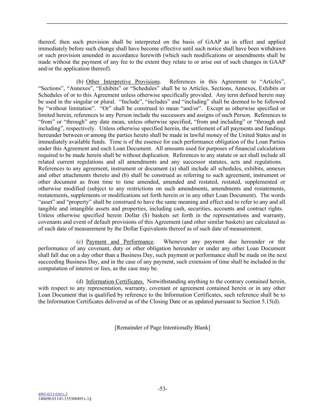 thereof, then such provision shall be interpreted on the basis of GAAP as in effect and applied immediately before such change shall have become effective until such notice shall have been withdrawn or such provision amended in accordance herewith (which such modifications or amendments shall be made without the payment of any fee to the extent they relate to or arise out of such changes in GAAP and/or the application thereof). (b) Other Interpretive Provisions. References in this Agreement to “Articles”, “Sections”, “Annexes”, “Exhibits” or “Schedules” shall be to Articles, Sections, Annexes, Exhibits or Schedules of or to this Agreement unless otherwise specifically provided. Any term defined herein may be used in the singular or plural. “Include”, “includes” and “including” shall be deemed to be followed by “without limitation”. “Or” shall be construed to mean “and/or”. Except as otherwise specified or limited herein, references to any Person include the successors and assigns of such Person. References to “from” or “through” any date mean, unless otherwise specified, “from and including” or “through and including”, respectively. Unless otherwise specified herein, the settlement of all payments and fundings hereunder between or among the parties hereto shall be made in lawful money of the United States and in immediately available funds. Time is of the essence for each performance obligation of the Loan Parties under this Agreement and each Loan Document. All amounts used for purposes of financial calculations required to be made herein shall be without duplication. References to any statute or act shall include all related current regulations and all amendments and any successor statutes, acts and regulations. References to any agreement, instrument or document (a) shall include all schedules, exhibits, annexes and other attachments thereto and (b) shall be construed as referring to such agreement, instrument or other document as from time to time amended, amended and restated, restated, supplemented or otherwise modified (subject to any restrictions on such amendments, amendments and restatements, restatements, supplements or modifications set forth herein or in any other Loan Document). The words “asset” and “property” shall be construed to have the same meaning and effect and to refer to any and all tangible and intangible assets and properties, including cash, securities, accounts and contract rights. Unless otherwise specified herein Dollar ($) baskets set forth in the representations and warranty, covenants and event of default provisions of this Agreement (and other similar baskets) are calculated as of each date of measurement by the Dollar Equivalents thereof as of such date of measurement. (c) Payment and Performance. Whenever any payment due hereunder or the performance of any covenant, duty or other obligation hereunder or under any other Loan Document shall fall due on a day other than a Business Day, such payment or performance shall be made on the next succeeding Business Day, and in the case of any payment, such extension of time shall be included in the computation of interest or fees, as the case may be. (d) Information Certificates. Notwithstanding anything to the contrary contained herein, with respect to any representation, warranty, covenant or agreement contained herein or in any other Loan Document that is qualified by reference to the Information Certificates, such reference shall be to the Information Certificates delivered as of the Closing Date or as updated pursuant to Section 5.15(d). [Remainder of Page Intentionally Blank] -53- 4903-4313-6361v.2 140690.01141/155300491v.14