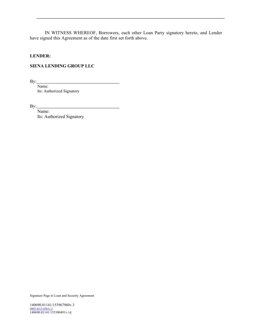 IN WITNESS WHEREOF, Borrowers, each other Loan Party signatory hereto, and Lender have signed this Agreement as of the date first set forth above. LENDER: SIENA LENDING GROUP LLC By: Name: Its: Authorized Signatory By: Name: Its: Authorized Signatory Signature Page to Loan and Security Agreement 140690.01141/153967960v.3 4903-4313-6361v.2 140690.01141/155300491v.14