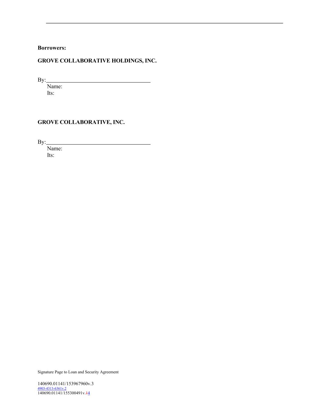 Borrowers: GROVE COLLABORATIVE HOLDINGS, INC. By: Name: Its: GROVE COLLABORATIVE, INC. By: Name: Its: Signature Page to Loan and Security Agreement 140690.01141/153967960v.3 4903-4313-6361v.2 140690.01141/155300491v.14