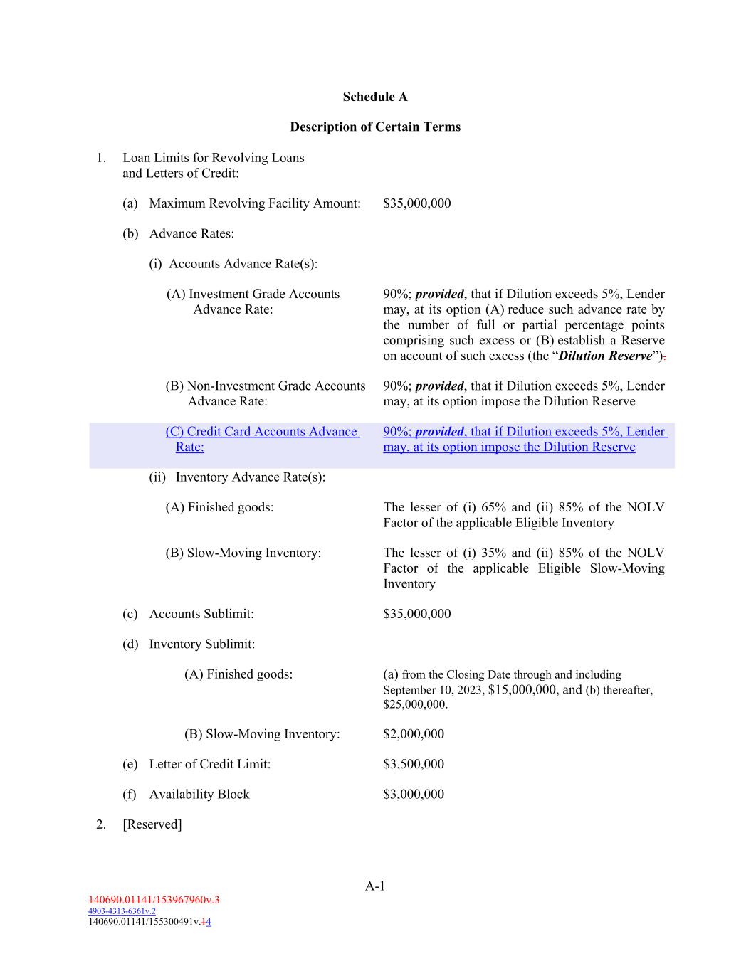 A-1 140690.01141/153967960v.3 4903-4313-6361v.2 140690.01141/155300491v.14 (A) Finished goods: The lesser of (i) 65% and (ii) 85% of the NOLV Factor of the applicable Eligible Inventory (a) Maximum Revolving Facility Amount: (B) Slow-Moving Inventory: The lesser of (i) 35% and (ii) 85% of the NOLV Factor of the applicable Eligible Slow-Moving Inventory (A) Investment Grade Accounts Advance Rate: $35,000,000 (c) Accounts Sublimit: 90%; provided, that if Dilution exceeds 5%, Lender may, at its option (A) reduce such advance rate by the number of full or partial percentage points comprising such excess or (B) establish a Reserve on account of such excess (the “Dilution Reserve”). $35,000,000 1. Loan Limits for Revolving Loans and Letters of Credit: (d) Inventory Sublimit: (B) Non-Investment Grade Accounts Advance Rate: (A) Finished goods: 90%; provided, that if Dilution exceeds 5%, Lender may, at its option impose the Dilution Reserve (a) from the Closing Date through and including September 10, 2023, $15,000,000, and (b) thereafter, $25,000,000. (b) Advance Rates: (B) Slow-Moving Inventory: $2,000,000 (C) Credit Card Accounts Advance Rate: (e) Letter of Credit Limit: 90%; provided, that if Dilution exceeds 5%, Lender may, at its option impose the Dilution Reserve $3,500,000 Schedule A Description of Certain Terms (f) Availability Block $3,000,000 (ii) Inventory Advance Rate(s): 2. [Reserved] (i) Accounts Advance Rate(s):