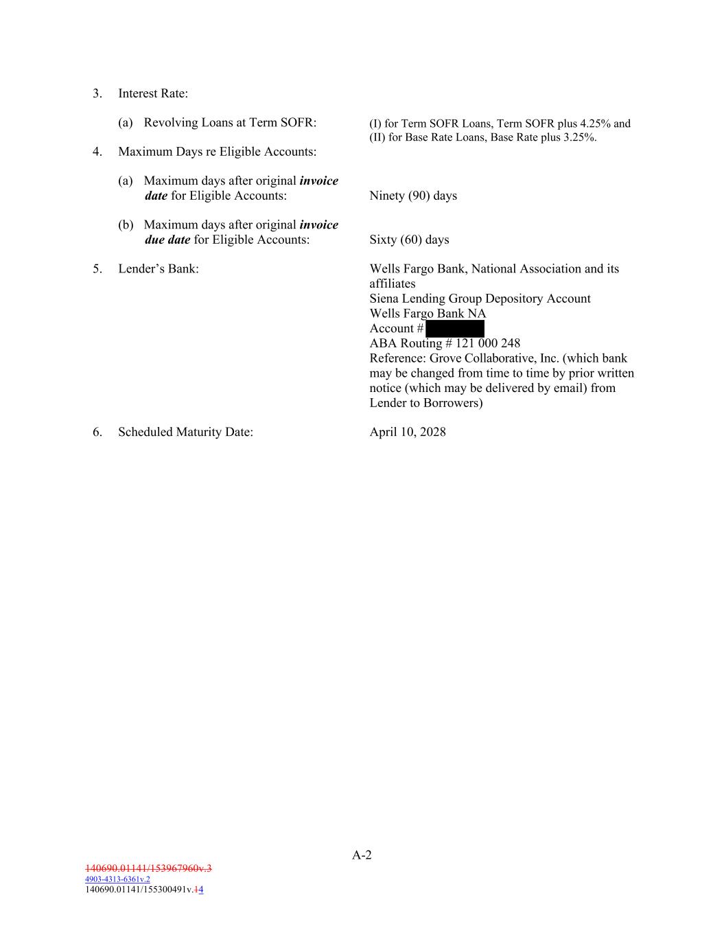 A-2 140690.01141/153967960v.3 4903-4313-6361v.2 140690.01141/155300491v.14 (a) Maximum days after original invoice date for Eligible Accounts: (a) Revolving Loans at Term SOFR: 3. Interest Rate: (I) for Term SOFR Loans, Term SOFR plus 4.25% and (II) for Base Rate Loans, Base Rate plus 3.25%. (b) Maximum days after original invoice due date for Eligible Accounts: 5. Lender’s Bank: 4. Maximum Days re Eligible Accounts: 6. Scheduled Maturity Date: Ninety (90) days Sixty (60) days Wells Fargo Bank, National Association and its affiliates Siena Lending Group Depository Account Wells Fargo Bank NA Account # ABA Routing # 121 000 248 Reference: Grove Collaborative, Inc. (which bank may be changed from time to time by prior written notice (which may be delivered by email) from Lender to Borrowers) April 10, 2028