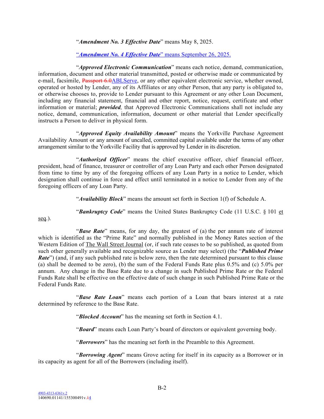 “Amendment No. 3 Effective Date” means May 8, 2025. “Amendment No. 4 Effective Date” means September 26, 2025. “Approved Electronic Communication” means each notice, demand, communication, information, document and other material transmitted, posted or otherwise made or communicated by e-mail, facsimile, Passport 6.0ABLServe, or any other equivalent electronic service, whether owned, operated or hosted by Lender, any of its Affiliates or any other Person, that any party is obligated to, or otherwise chooses to, provide to Lender pursuant to this Agreement or any other Loan Document, including any financial statement, financial and other report, notice, request, certificate and other information or material; provided, that Approved Electronic Communications shall not include any notice, demand, communication, information, document or other material that Lender specifically instructs a Person to deliver in physical form. “Approved Equity Availability Amount” means the Yorkville Purchase Agreement Availability Amount or any amount of uncalled, committed capital available under the terms of any other arrangement similar to the Yorkville Facility that is approved by Lender in its discretion. “Authorized Officer” means the chief executive officer, chief financial officer, president, head of finance, treasurer or controller of any Loan Party and each other Person designated from time to time by any of the foregoing officers of any Loan Party in a notice to Lender, which designation shall continue in force and effect until terminated in a notice to Lender from any of the foregoing officers of any Loan Party. “Availability Block” means the amount set forth in Section 1(f) of Schedule A. “Bankruptcy Code” means the United States Bankruptcy Code (11 U.S.C. § 101 et seq.). “Base Rate” means, for any day, the greatest of (a) the per annum rate of interest which is identified as the “Prime Rate” and normally published in the Money Rates section of the Western Edition of The Wall Street Journal (or, if such rate ceases to be so published, as quoted from such other generally available and recognizable source as Lender may select) (the “Published Prime Rate”) (and, if any such published rate is below zero, then the rate determined pursuant to this clause (a) shall be deemed to be zero), (b) the sum of the Federal Funds Rate plus 0.5% and (c) 5.0% per annum. Any change in the Base Rate due to a change in such Published Prime Rate or the Federal Funds Rate shall be effective on the effective date of such change in such Published Prime Rate or the Federal Funds Rate. “Base Rate Loan” means each portion of a Loan that bears interest at a rate determined by reference to the Base Rate. “Blocked Account” has the meaning set forth in Section 4.1. “Board” means each Loan Party’s board of directors or equivalent governing body. “Borrowers” has the meaning set forth in the Preamble to this Agreement. “Borrowing Agent” means Grove acting for itself in its capacity as a Borrower or in its capacity as agent for all of the Borrowers (including itself). B-2 4903-4313-6361v.2 140690.01141/155300491v.14