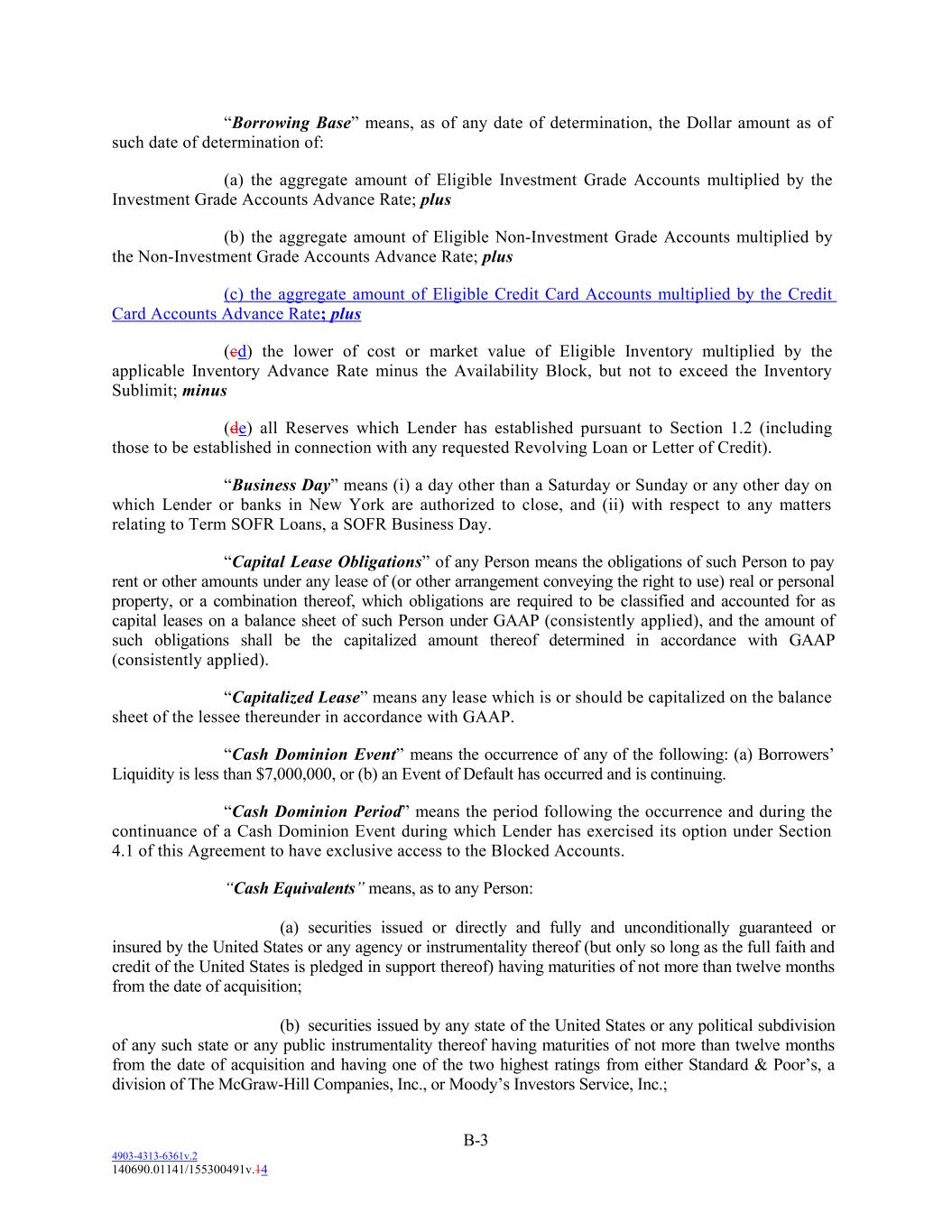 “Borrowing Base” means, as of any date of determination, the Dollar amount as of such date of determination of: (a) the aggregate amount of Eligible Investment Grade Accounts multiplied by the Investment Grade Accounts Advance Rate; plus (b) the aggregate amount of Eligible Non-Investment Grade Accounts multiplied by the Non-Investment Grade Accounts Advance Rate; plus (c) the aggregate amount of Eligible Credit Card Accounts multiplied by the Credit Card Accounts Advance Rate; plus (cd) the lower of cost or market value of Eligible Inventory multiplied by the applicable Inventory Advance Rate minus the Availability Block, but not to exceed the Inventory Sublimit; minus (de) all Reserves which Lender has established pursuant to Section 1.2 (including those to be established in connection with any requested Revolving Loan or Letter of Credit). “Business Day” means (i) a day other than a Saturday or Sunday or any other day on which Lender or banks in New York are authorized to close, and (ii) with respect to any matters relating to Term SOFR Loans, a SOFR Business Day. “Capital Lease Obligations” of any Person means the obligations of such Person to pay rent or other amounts under any lease of (or other arrangement conveying the right to use) real or personal property, or a combination thereof, which obligations are required to be classified and accounted for as capital leases on a balance sheet of such Person under GAAP (consistently applied), and the amount of such obligations shall be the capitalized amount thereof determined in accordance with GAAP (consistently applied). “Capitalized Lease” means any lease which is or should be capitalized on the balance sheet of the lessee thereunder in accordance with GAAP. “Cash Dominion Event” means the occurrence of any of the following: (a) Borrowers’ Liquidity is less than $7,000,000, or (b) an Event of Default has occurred and is continuing. “Cash Dominion Period” means the period following the occurrence and during the continuance of a Cash Dominion Event during which Lender has exercised its option under Section 4.1 of this Agreement to have exclusive access to the Blocked Accounts. “Cash Equivalents” means, as to any Person: (a) securities issued or directly and fully and unconditionally guaranteed or insured by the United States or any agency or instrumentality thereof (but only so long as the full faith and credit of the United States is pledged in support thereof) having maturities of not more than twelve months from the date of acquisition; (b) securities issued by any state of the United States or any political subdivision of any such state or any public instrumentality thereof having maturities of not more than twelve months from the date of acquisition and having one of the two highest ratings from either Standard & Poor’s, a division of The McGraw-Hill Companies, Inc., or Moody’s Investors Service, Inc.; B-3 4903-4313-6361v.2 140690.01141/155300491v.14