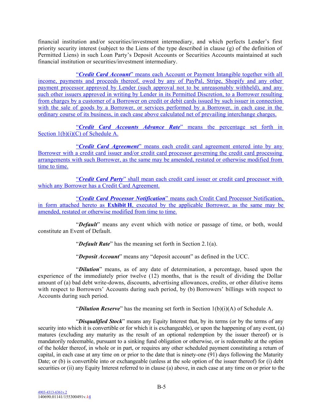 financial institution and/or securities/investment intermediary, and which perfects Lender’s first priority security interest (subject to the Liens of the type described in clause (g) of the definition of Permitted Liens) in such Loan Party’s Deposit Accounts or Securities Accounts maintained at such financial institution or securities/investment intermediary. “Credit Card Account” means each Account or Payment Intangible together with all income, payments and proceeds thereof, owed by any of PayPal, Stripe, Shopify and any other payment processor approved by Lender (such approval not to be unreasonably withheld), and any such other issuers approved in writing by Lender in its Permitted Discretion, to a Borrower resulting from charges by a customer of a Borrower on credit or debit cards issued by such issuer in connection with the sale of goods by a Borrower, or services performed by a Borrower, in each case in the ordinary course of its business, in each case above calculated net of prevailing interchange charges. “Credit Card Accounts Advance Rate” means the percentage set forth in Section 1(b)(i)(C) of Schedule A. “Credit Card Agreement” means each credit card agreement entered into by any Borrower with a credit card issuer and/or credit card processor governing the credit card processing arrangements with such Borrower, as the same may be amended, restated or otherwise modified from time to time. “Credit Card Party” shall mean each credit card issuer or credit card processor with which any Borrower has a Credit Card Agreement. “Credit Card Processor Notification” means each Credit Card Processor Notification, in form attached hereto as Exhibit H, executed by the applicable Borrower, as the same may be amended, restated or otherwise modified from time to time. “Default” means any event which with notice or passage of time, or both, would constitute an Event of Default. “Default Rate” has the meaning set forth in Section 2.1(a). “Deposit Account” means any “deposit account” as defined in the UCC. “Dilution” means, as of any date of determination, a percentage, based upon the experience of the immediately prior twelve (12) months, that is the result of dividing the Dollar amount of (a) bad debt write-downs, discounts, advertising allowances, credits, or other dilutive items with respect to Borrowers’ Accounts during such period, by (b) Borrowers’ billings with respect to Accounts during such period. “Dilution Reserve” has the meaning set forth in Section 1(b)(i)(A) of Schedule A. “Disqualified Stock” means any Equity Interest that, by its terms (or by the terms of any security into which it is convertible or for which it is exchangeable), or upon the happening of any event, (a) matures (excluding any maturity as the result of an optional redemption by the issuer thereof) or is mandatorily redeemable, pursuant to a sinking fund obligation or otherwise, or is redeemable at the option of the holder thereof, in whole or in part, or requires any other scheduled payment constituting a return of capital, in each case at any time on or prior to the date that is ninety-one (91) days following the Maturity Date; or (b) is convertible into or exchangeable (unless at the sole option of the issuer thereof) for (i) debt securities or (ii) any Equity Interest referred to in clause (a) above, in each case at any time on or prior to the B-5 4903-4313-6361v.2 140690.01141/155300491v.14