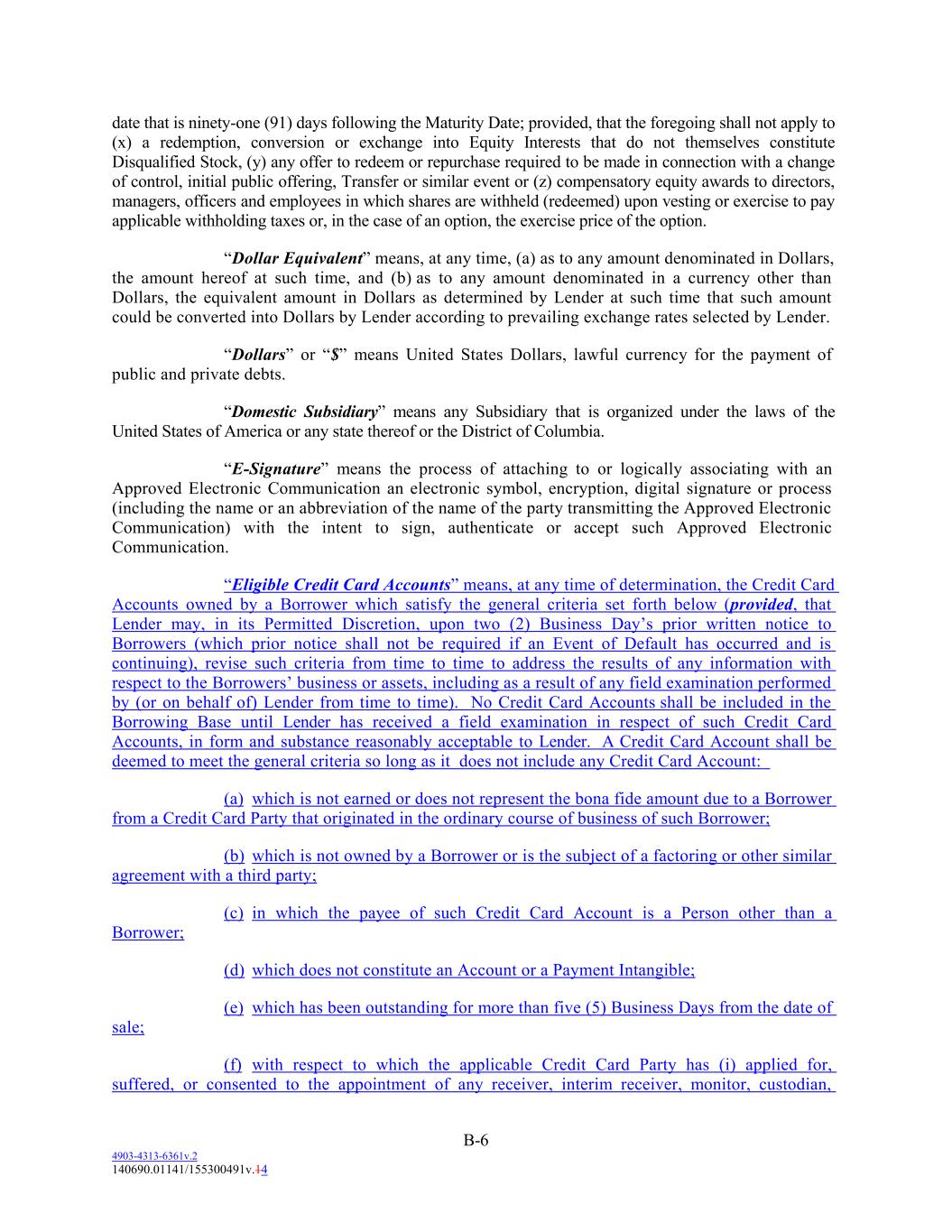 date that is ninety-one (91) days following the Maturity Date; provided, that the foregoing shall not apply to (x) a redemption, conversion or exchange into Equity Interests that do not themselves constitute Disqualified Stock, (y) any offer to redeem or repurchase required to be made in connection with a change of control, initial public offering, Transfer or similar event or (z) compensatory equity awards to directors, managers, officers and employees in which shares are withheld (redeemed) upon vesting or exercise to pay applicable withholding taxes or, in the case of an option, the exercise price of the option. “Dollar Equivalent” means, at any time, (a) as to any amount denominated in Dollars, the amount hereof at such time, and (b) as to any amount denominated in a currency other than Dollars, the equivalent amount in Dollars as determined by Lender at such time that such amount could be converted into Dollars by Lender according to prevailing exchange rates selected by Lender. “Dollars” or “$” means United States Dollars, lawful currency for the payment of public and private debts. “Domestic Subsidiary” means any Subsidiary that is organized under the laws of the United States of America or any state thereof or the District of Columbia. “E-Signature” means the process of attaching to or logically associating with an Approved Electronic Communication an electronic symbol, encryption, digital signature or process (including the name or an abbreviation of the name of the party transmitting the Approved Electronic Communication) with the intent to sign, authenticate or accept such Approved Electronic Communication. “Eligible Credit Card Accounts” means, at any time of determination, the Credit Card Accounts owned by a Borrower which satisfy the general criteria set forth below (provided, that Lender may, in its Permitted Discretion, upon two (2) Business Day’s prior written notice to Borrowers (which prior notice shall not be required if an Event of Default has occurred and is continuing), revise such criteria from time to time to address the results of any information with respect to the Borrowers’ business or assets, including as a result of any field examination performed by (or on behalf of) Lender from time to time). No Credit Card Accounts shall be included in the Borrowing Base until Lender has received a field examination in respect of such Credit Card Accounts, in form and substance reasonably acceptable to Lender. A Credit Card Account shall be deemed to meet the general criteria so long as it does not include any Credit Card Account: (a) which is not earned or does not represent the bona fide amount due to a Borrower from a Credit Card Party that originated in the ordinary course of business of such Borrower; (b) which is not owned by a Borrower or is the subject of a factoring or other similar agreement with a third party; (c) in which the payee of such Credit Card Account is a Person other than a Borrower; (d) which does not constitute an Account or a Payment Intangible; (e) which has been outstanding for more than five (5) Business Days from the date of sale; (f) with respect to which the applicable Credit Card Party has (i) applied for, suffered, or consented to the appointment of any receiver, interim receiver, monitor, custodian, B-6 4903-4313-6361v.2 140690.01141/155300491v.14