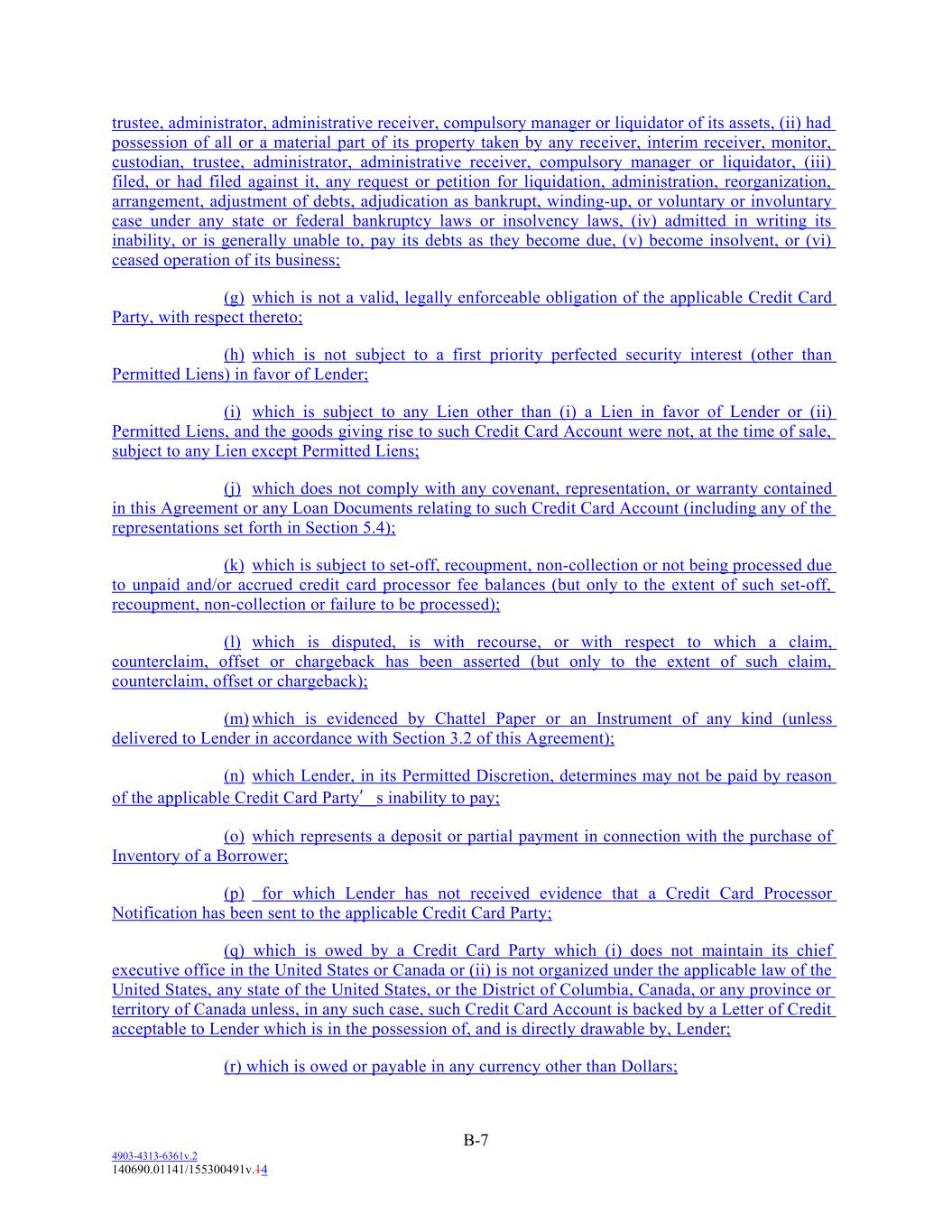 trustee, administrator, administrative receiver, compulsory manager or liquidator of its assets, (ii) had possession of all or a material part of its property taken by any receiver, interim receiver, monitor, custodian, trustee, administrator, administrative receiver, compulsory manager or liquidator, (iii) filed, or had filed against it, any request or petition for liquidation, administration, reorganization, arrangement, adjustment of debts, adjudication as bankrupt, winding-up, or voluntary or involuntary case under any state or federal bankruptcy laws or insolvency laws, (iv) admitted in writing its inability, or is generally unable to, pay its debts as they become due, (v) become insolvent, or (vi) ceased operation of its business; (g) which is not a valid, legally enforceable obligation of the applicable Credit Card Party, with respect thereto; (h) which is not subject to a first priority perfected security interest (other than Permitted Liens) in favor of Lender; (i) which is subject to any Lien other than (i) a Lien in favor of Lender or (ii) Permitted Liens, and the goods giving rise to such Credit Card Account were not, at the time of sale, subject to any Lien except Permitted Liens; (j) which does not comply with any covenant, representation, or warranty contained in this Agreement or any Loan Documents relating to such Credit Card Account (including any of the representations set forth in Section 5.4); (k) which is subject to set-off, recoupment, non-collection or not being processed due to unpaid and/or accrued credit card processor fee balances (but only to the extent of such set-off, recoupment, non-collection or failure to be processed); (l) which is disputed, is with recourse, or with respect to which a claim, counterclaim, offset or chargeback has been asserted (but only to the extent of such claim, counterclaim, offset or chargeback); (m) which is evidenced by Chattel Paper or an Instrument of any kind (unless delivered to Lender in accordance with Section 3.2 of this Agreement); (n) which Lender, in its Permitted Discretion, determines may not be paid by reason of the applicable Credit Card Party’s inability to pay; (o) which represents a deposit or partial payment in connection with the purchase of Inventory of a Borrower; (p) for which Lender has not received evidence that a Credit Card Processor Notification has been sent to the applicable Credit Card Party; (q) which is owed by a Credit Card Party which (i) does not maintain its chief executive office in the United States or Canada or (ii) is not organized under the applicable law of the United States, any state of the United States, or the District of Columbia, Canada, or any province or territory of Canada unless, in any such case, such Credit Card Account is backed by a Letter of Credit acceptable to Lender which is in the possession of, and is directly drawable by, Lender; (r) which is owed or payable in any currency other than Dollars; B-7 4903-4313-6361v.2 140690.01141/155300491v.14