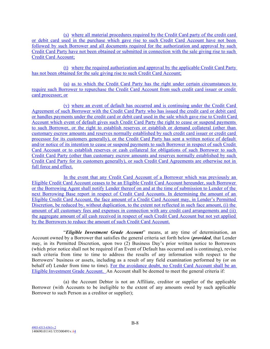 (s) where all material procedures required by the Credit Card party of the credit card or debit card used in the purchase which gave rise to such Credit Card Account have not been followed by such Borrower and all documents required for the authorization and approval by such Credit Card Party have not been obtained or submitted in connection with the sale giving rise to such Credit Card Account; (t) where the required authorization and approval by the applicable Credit Card Party has not been obtained for the sale giving rise to such Credit Card Account; (u) as to which the Credit Card Party has the right under certain circumstances to require such Borrower to repurchase the Credit Card Account from such credit card issuer or credit card processor; or (v) where an event of default has occurred and is continuing under the Credit Card Agreement of such Borrower with the Credit Card Party who has issued the credit card or debit card or handles payments under the credit card or debit card used in the sale which gave rise to Credit Card Account which event of default gives such Credit Card Party the right to cease or suspend payments to such Borrower, or the right to establish reserves or establish or demand collateral (other than customary escrow amounts and reserves normally established by such credit card issuer or credit card processor for its customers generally), or the Credit Card Party has sent a written notice of default and/or notice of its intention to cease or suspend payments to such Borrower in respect of such Credit Card Account or to establish reserves or cash collateral for obligations of such Borrower to such Credit Card Party (other than customary escrow amounts and reserves normally established by such Credit Card Party for its customers generally), or such Credit Card Agreements are otherwise not in full force and effect. In the event that any Credit Card Account of a Borrower which was previously an Eligible Credit Card Account ceases to be an Eligible Credit Card Account hereunder, such Borrower or the Borrowing Agent shall notify Lender thereof on and at the time of submission to Lender of the next Borrowing Base report in respect of Credit Card Accounts. In determining the amount of an Eligible Credit Card Account, the face amount of a Credit Card Account may, in Lender’s Permitted Discretion, be reduced by, without duplication, to the extent not reflected in such face amount, (i) the amount of all customary fees and expenses in connection with any credit card arrangements and (ii) the aggregate amount of all cash received in respect of such Credit Card Account but not yet applied by the Borrowers to reduce the amount of such Credit Card Account. “Eligible Investment Grade Account” means, at any time of determination, an Account owned by a Borrower that satisfies the general criteria set forth below (provided, that Lender may, in its Permitted Discretion, upon two (2) Business Day’s prior written notice to Borrowers (which prior notice shall not be required if an Event of Default has occurred and is continuing), revise such criteria from time to time to address the results of any information with respect to the Borrowers’ business or assets, including as a result of any field examination performed by (or on behalf of) Lender from time to time). For the avoidance doubt, no Credit Card Account shall be an Eligible Investment Grade Account. An Account shall be deemed to meet the general criteria if: (a) the Account Debtor is not an Affiliate, creditor or supplier of the applicable Borrower (with Accounts to be ineligible to the extent of any amounts owed by such applicable Borrower to such Person as a creditor or supplier); B-8 4903-4313-6361v.2 140690.01141/155300491v.14