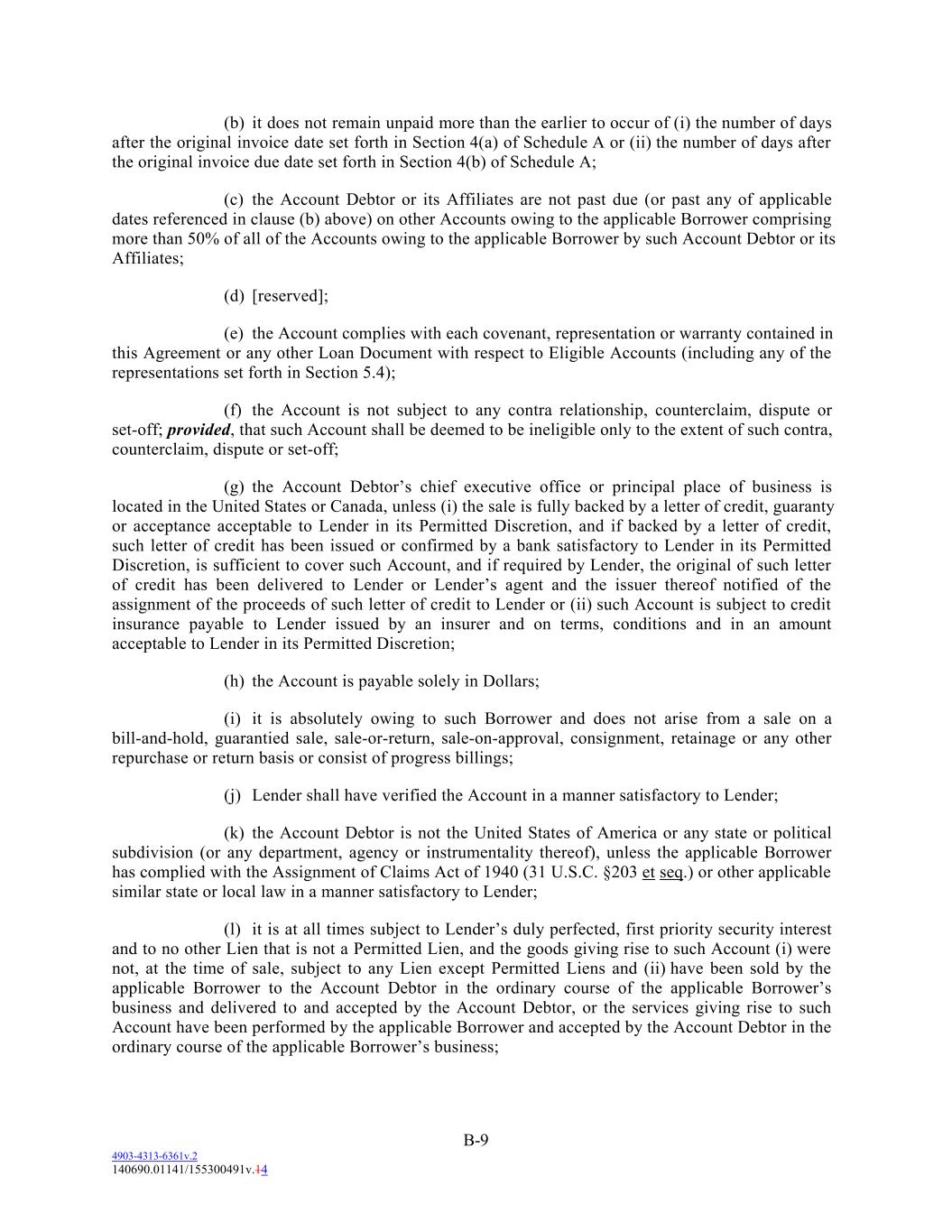 (b) it does not remain unpaid more than the earlier to occur of (i) the number of days after the original invoice date set forth in Section 4(a) of Schedule A or (ii) the number of days after the original invoice due date set forth in Section 4(b) of Schedule A; (c) the Account Debtor or its Affiliates are not past due (or past any of applicable dates referenced in clause (b) above) on other Accounts owing to the applicable Borrower comprising more than 50% of all of the Accounts owing to the applicable Borrower by such Account Debtor or its Affiliates; (d) [reserved]; (e) the Account complies with each covenant, representation or warranty contained in this Agreement or any other Loan Document with respect to Eligible Accounts (including any of the representations set forth in Section 5.4); (f) the Account is not subject to any contra relationship, counterclaim, dispute or set-off; provided, that such Account shall be deemed to be ineligible only to the extent of such contra, counterclaim, dispute or set-off; (g) the Account Debtor’s chief executive office or principal place of business is located in the United States or Canada, unless (i) the sale is fully backed by a letter of credit, guaranty or acceptance acceptable to Lender in its Permitted Discretion, and if backed by a letter of credit, such letter of credit has been issued or confirmed by a bank satisfactory to Lender in its Permitted Discretion, is sufficient to cover such Account, and if required by Lender, the original of such letter of credit has been delivered to Lender or Lender’s agent and the issuer thereof notified of the assignment of the proceeds of such letter of credit to Lender or (ii) such Account is subject to credit insurance payable to Lender issued by an insurer and on terms, conditions and in an amount acceptable to Lender in its Permitted Discretion; (h) the Account is payable solely in Dollars; (i) it is absolutely owing to such Borrower and does not arise from a sale on a bill-and-hold, guarantied sale, sale-or-return, sale-on-approval, consignment, retainage or any other repurchase or return basis or consist of progress billings; (j) Lender shall have verified the Account in a manner satisfactory to Lender; (k) the Account Debtor is not the United States of America or any state or political subdivision (or any department, agency or instrumentality thereof), unless the applicable Borrower has complied with the Assignment of Claims Act of 1940 (31 U.S.C. §203 et seq.) or other applicable similar state or local law in a manner satisfactory to Lender; (l) it is at all times subject to Lender’s duly perfected, first priority security interest and to no other Lien that is not a Permitted Lien, and the goods giving rise to such Account (i) were not, at the time of sale, subject to any Lien except Permitted Liens and (ii) have been sold by the applicable Borrower to the Account Debtor in the ordinary course of the applicable Borrower’s business and delivered to and accepted by the Account Debtor, or the services giving rise to such Account have been performed by the applicable Borrower and accepted by the Account Debtor in the ordinary course of the applicable Borrower’s business; B-9 4903-4313-6361v.2 140690.01141/155300491v.14