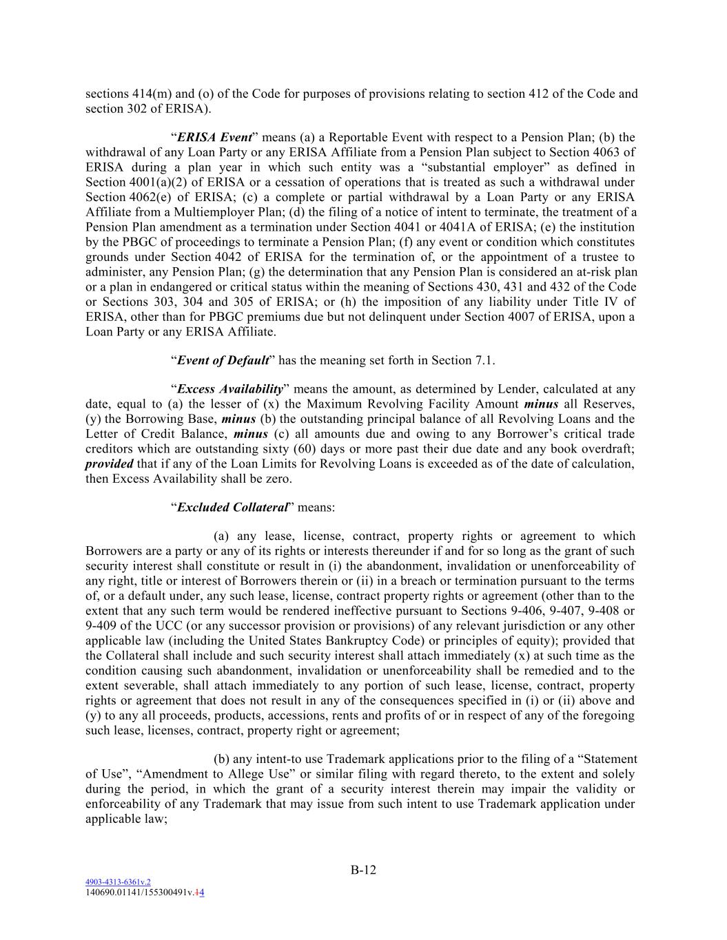 sections 414(m) and (o) of the Code for purposes of provisions relating to section 412 of the Code and section 302 of ERISA). “ERISA Event” means (a) a Reportable Event with respect to a Pension Plan; (b) the withdrawal of any Loan Party or any ERISA Affiliate from a Pension Plan subject to Section 4063 of ERISA during a plan year in which such entity was a “substantial employer” as defined in Section 4001(a)(2) of ERISA or a cessation of operations that is treated as such a withdrawal under Section 4062(e) of ERISA; (c) a complete or partial withdrawal by a Loan Party or any ERISA Affiliate from a Multiemployer Plan; (d) the filing of a notice of intent to terminate, the treatment of a Pension Plan amendment as a termination under Section 4041 or 4041A of ERISA; (e) the institution by the PBGC of proceedings to terminate a Pension Plan; (f) any event or condition which constitutes grounds under Section 4042 of ERISA for the termination of, or the appointment of a trustee to administer, any Pension Plan; (g) the determination that any Pension Plan is considered an at-risk plan or a plan in endangered or critical status within the meaning of Sections 430, 431 and 432 of the Code or Sections 303, 304 and 305 of ERISA; or (h) the imposition of any liability under Title IV of ERISA, other than for PBGC premiums due but not delinquent under Section 4007 of ERISA, upon a Loan Party or any ERISA Affiliate. “Event of Default” has the meaning set forth in Section 7.1. “Excess Availability” means the amount, as determined by Lender, calculated at any date, equal to (a) the lesser of (x) the Maximum Revolving Facility Amount minus all Reserves, (y) the Borrowing Base, minus (b) the outstanding principal balance of all Revolving Loans and the Letter of Credit Balance, minus (c) all amounts due and owing to any Borrower’s critical trade creditors which are outstanding sixty (60) days or more past their due date and any book overdraft; provided that if any of the Loan Limits for Revolving Loans is exceeded as of the date of calculation, then Excess Availability shall be zero. “Excluded Collateral” means: (a) any lease, license, contract, property rights or agreement to which Borrowers are a party or any of its rights or interests thereunder if and for so long as the grant of such security interest shall constitute or result in (i) the abandonment, invalidation or unenforceability of any right, title or interest of Borrowers therein or (ii) in a breach or termination pursuant to the terms of, or a default under, any such lease, license, contract property rights or agreement (other than to the extent that any such term would be rendered ineffective pursuant to Sections 9-406, 9-407, 9-408 or 9-409 of the UCC (or any successor provision or provisions) of any relevant jurisdiction or any other applicable law (including the United States Bankruptcy Code) or principles of equity); provided that the Collateral shall include and such security interest shall attach immediately (x) at such time as the condition causing such abandonment, invalidation or unenforceability shall be remedied and to the extent severable, shall attach immediately to any portion of such lease, license, contract, property rights or agreement that does not result in any of the consequences specified in (i) or (ii) above and (y) to any all proceeds, products, accessions, rents and profits of or in respect of any of the foregoing such lease, licenses, contract, property right or agreement; (b) any intent-to use Trademark applications prior to the filing of a “Statement of Use”, “Amendment to Allege Use” or similar filing with regard thereto, to the extent and solely during the period, in which the grant of a security interest therein may impair the validity or enforceability of any Trademark that may issue from such intent to use Trademark application under applicable law; B-12 4903-4313-6361v.2 140690.01141/155300491v.14
