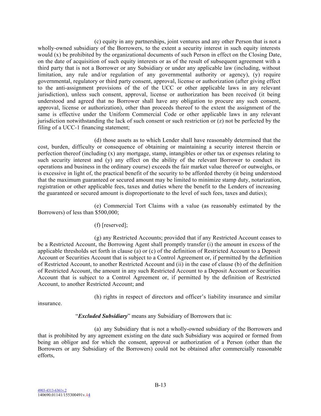 (c) equity in any partnerships, joint ventures and any other Person that is not a wholly-owned subsidiary of the Borrowers, to the extent a security interest in such equity interests would (x) be prohibited by the organizational documents of such Person in effect on the Closing Date, on the date of acquisition of such equity interests or as of the result of subsequent agreement with a third party that is not a Borrower or any Subsidiary or under any applicable law (including, without limitation, any rule and/or regulation of any governmental authority or agency), (y) require governmental, regulatory or third party consent, approval, license or authorization (after giving effect to the anti-assignment provisions of the of the UCC or other applicable laws in any relevant jurisdiction), unless such consent, approval, license or authorization has been received (it being understood and agreed that no Borrower shall have any obligation to procure any such consent, approval, license or authorization), other than proceeds thereof to the extent the assignment of the same is effective under the Uniform Commercial Code or other applicable laws in any relevant jurisdiction notwithstanding the lack of such consent or such restriction or (z) not be perfected by the filing of a UCC-1 financing statement; (d) those assets as to which Lender shall have reasonably determined that the cost, burden, difficulty or consequence of obtaining or maintaining a security interest therein or perfection thereof (including (x) any mortgage, stamp, intangibles or other tax or expenses relating to such security interest and (y) any effect on the ability of the relevant Borrower to conduct its operations and business in the ordinary course) exceeds the fair market value thereof or outweighs, or is excessive in light of, the practical benefit of the security to be afforded thereby (it being understood that the maximum guaranteed or secured amount may be limited to minimize stamp duty, notarization, registration or other applicable fees, taxes and duties where the benefit to the Lenders of increasing the guaranteed or secured amount is disproportionate to the level of such fees, taxes and duties); (e) Commercial Tort Claims with a value (as reasonably estimated by the Borrowers) of less than $500,000; (f) [reserved]; (g) any Restricted Accounts; provided that if any Restricted Account ceases to be a Restricted Account, the Borrowing Agent shall promptly transfer (i) the amount in excess of the applicable thresholds set forth in clause (a) or (c) of the definition of Restricted Account to a Deposit Account or Securities Account that is subject to a Control Agreement or, if permitted by the definition of Restricted Account, to another Restricted Account and (ii) in the case of clause (b) of the definition of Restricted Account, the amount in any such Restricted Account to a Deposit Account or Securities Account that is subject to a Control Agreement or, if permitted by the definition of Restricted Account, to another Restricted Account; and (h) rights in respect of directors and officer’s liability insurance and similar insurance. “Excluded Subsidiary” means any Subsidiary of Borrowers that is: (a) any Subsidiary that is not a wholly-owned subsidiary of the Borrowers and that is prohibited by any agreement existing on the date such Subsidiary was acquired or formed from being an obligor and for which the consent, approval or authorization of a Person (other than the Borrowers or any Subsidiary of the Borrowers) could not be obtained after commercially reasonable efforts, B-13 4903-4313-6361v.2 140690.01141/155300491v.14