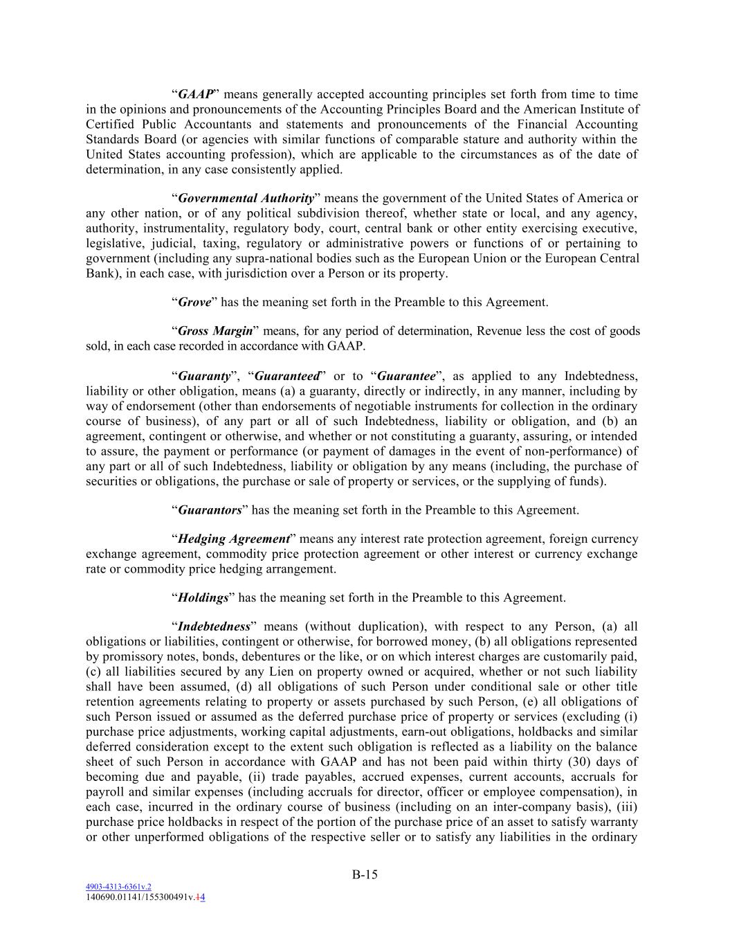 “GAAP” means generally accepted accounting principles set forth from time to time in the opinions and pronouncements of the Accounting Principles Board and the American Institute of Certified Public Accountants and statements and pronouncements of the Financial Accounting Standards Board (or agencies with similar functions of comparable stature and authority within the United States accounting profession), which are applicable to the circumstances as of the date of determination, in any case consistently applied. “Governmental Authority” means the government of the United States of America or any other nation, or of any political subdivision thereof, whether state or local, and any agency, authority, instrumentality, regulatory body, court, central bank or other entity exercising executive, legislative, judicial, taxing, regulatory or administrative powers or functions of or pertaining to government (including any supra-national bodies such as the European Union or the European Central Bank), in each case, with jurisdiction over a Person or its property. “Grove” has the meaning set forth in the Preamble to this Agreement. “Gross Margin” means, for any period of determination, Revenue less the cost of goods sold, in each case recorded in accordance with GAAP. “Guaranty”, “Guaranteed” or to “Guarantee”, as applied to any Indebtedness, liability or other obligation, means (a) a guaranty, directly or indirectly, in any manner, including by way of endorsement (other than endorsements of negotiable instruments for collection in the ordinary course of business), of any part or all of such Indebtedness, liability or obligation, and (b) an agreement, contingent or otherwise, and whether or not constituting a guaranty, assuring, or intended to assure, the payment or performance (or payment of damages in the event of non-performance) of any part or all of such Indebtedness, liability or obligation by any means (including, the purchase of securities or obligations, the purchase or sale of property or services, or the supplying of funds). “Guarantors” has the meaning set forth in the Preamble to this Agreement. “Hedging Agreement” means any interest rate protection agreement, foreign currency exchange agreement, commodity price protection agreement or other interest or currency exchange rate or commodity price hedging arrangement. “Holdings” has the meaning set forth in the Preamble to this Agreement. “Indebtedness” means (without duplication), with respect to any Person, (a) all obligations or liabilities, contingent or otherwise, for borrowed money, (b) all obligations represented by promissory notes, bonds, debentures or the like, or on which interest charges are customarily paid, (c) all liabilities secured by any Lien on property owned or acquired, whether or not such liability shall have been assumed, (d) all obligations of such Person under conditional sale or other title retention agreements relating to property or assets purchased by such Person, (e) all obligations of such Person issued or assumed as the deferred purchase price of property or services (excluding (i) purchase price adjustments, working capital adjustments, earn-out obligations, holdbacks and similar deferred consideration except to the extent such obligation is reflected as a liability on the balance sheet of such Person in accordance with GAAP and has not been paid within thirty (30) days of becoming due and payable, (ii) trade payables, accrued expenses, current accounts, accruals for payroll and similar expenses (including accruals for director, officer or employee compensation), in each case, incurred in the ordinary course of business (including on an inter-company basis), (iii) purchase price holdbacks in respect of the portion of the purchase price of an asset to satisfy warranty or other unperformed obligations of the respective seller or to satisfy any liabilities in the ordinary B-15 4903-4313-6361v.2 140690.01141/155300491v.14