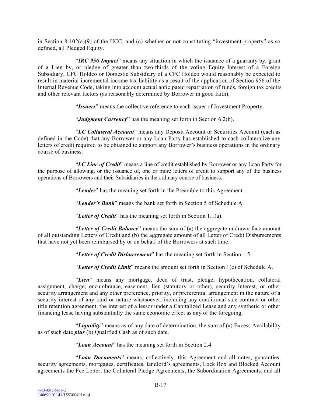 in Section 8-102(a)(9) of the UCC, and (c) whether or not constituting “investment property” as so defined, all Pledged Equity. “IRC 956 Impact” means any situation in which the issuance of a guaranty by, grant of a Lien by, or pledge of greater than two-thirds of the voting Equity Interest of a Foreign Subsidiary, CFC Holdco or Domestic Subsidiary of a CFC Holdco would reasonably be expected to result in material incremental income tax liability as a result of the application of Section 956 of the Internal Revenue Code, taking into account actual anticipated repatriation of funds, foreign tax credits and other relevant factors (as reasonably determined by Borrower in good faith). “Issuers” means the collective reference to each issuer of Investment Property. “Judgment Currency” has the meaning set forth in Section 6.2(b). “LC Collateral Account” means any Deposit Account or Securities Account (each as defined in the Code) that any Borrower or any Loan Party has established to cash collateralize any letters of credit required to be obtained to support any Borrower’s business operations in the ordinary course of business. “LC Line of Credit” means a line of credit established by Borrower or any Loan Party for the purpose of allowing, or the issuance of, one or more letters of credit to support any of the business operations of Borrowers and their Subsidiaries in the ordinary course of business. “Lender” has the meaning set forth in the Preamble to this Agreement. “Lender’s Bank” means the bank set forth in Section 5 of Schedule A. “Letter of Credit” has the meaning set forth in Section 1.1(a). “Letter of Credit Balance” means the sum of (a) the aggregate undrawn face amount of all outstanding Letters of Credit and (b) the aggregate amount of all Letter of Credit Disbursements that have not yet been reimbursed by or on behalf of the Borrowers at such time. “Letter of Credit Disbursement” has the meaning set forth in Section 1.5. “Letter of Credit Limit” means the amount set forth in Section 1(e) of Schedule A. “Lien” means any mortgage, deed of trust, pledge, hypothecation, collateral assignment, charge, encumbrance, easement, lien (statutory or other), security interest, or other security arrangement and any other preference, priority, or preferential arrangement in the nature of a security interest of any kind or nature whatsoever, including any conditional sale contract or other title retention agreement, the interest of a lessor under a Capitalized Lease and any synthetic or other financing lease having substantially the same economic effect as any of the foregoing. “Liquidity” means as of any date of determination, the sum of (a) Excess Availability as of such date plus (b) Qualified Cash as of such date. “Loan Account” has the meaning set forth in Section 2.4. “Loan Documents” means, collectively, this Agreement and all notes, guaranties, security agreements, mortgages, certificates, landlord’s agreements, Lock Box and Blocked Account agreements the Fee Letter, the Collateral Pledge Agreements, the Subordination Agreements, and all B-17 4903-4313-6361v.2 140690.01141/155300491v.14