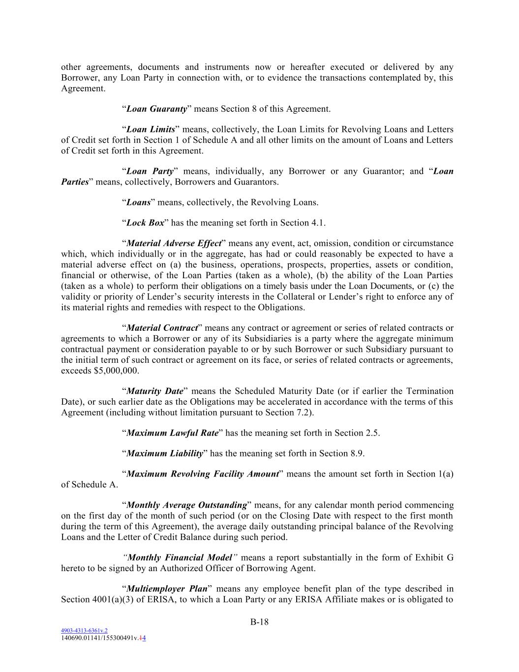other agreements, documents and instruments now or hereafter executed or delivered by any Borrower, any Loan Party in connection with, or to evidence the transactions contemplated by, this Agreement. “Loan Guaranty” means Section 8 of this Agreement. “Loan Limits” means, collectively, the Loan Limits for Revolving Loans and Letters of Credit set forth in Section 1 of Schedule A and all other limits on the amount of Loans and Letters of Credit set forth in this Agreement. “Loan Party” means, individually, any Borrower or any Guarantor; and “Loan Parties” means, collectively, Borrowers and Guarantors. “Loans” means, collectively, the Revolving Loans. “Lock Box” has the meaning set forth in Section 4.1. “Material Adverse Effect” means any event, act, omission, condition or circumstance which, which individually or in the aggregate, has had or could reasonably be expected to have a material adverse effect on (a) the business, operations, prospects, properties, assets or condition, financial or otherwise, of the Loan Parties (taken as a whole), (b) the ability of the Loan Parties (taken as a whole) to perform their obligations on a timely basis under the Loan Documents, or (c) the validity or priority of Lender’s security interests in the Collateral or Lender’s right to enforce any of its material rights and remedies with respect to the Obligations. “Material Contract” means any contract or agreement or series of related contracts or agreements to which a Borrower or any of its Subsidiaries is a party where the aggregate minimum contractual payment or consideration payable to or by such Borrower or such Subsidiary pursuant to the initial term of such contract or agreement on its face, or series of related contracts or agreements, exceeds $5,000,000. “Maturity Date” means the Scheduled Maturity Date (or if earlier the Termination Date), or such earlier date as the Obligations may be accelerated in accordance with the terms of this Agreement (including without limitation pursuant to Section 7.2). “Maximum Lawful Rate” has the meaning set forth in Section 2.5. “Maximum Liability” has the meaning set forth in Section 8.9. “Maximum Revolving Facility Amount” means the amount set forth in Section 1(a) of Schedule A. “Monthly Average Outstanding” means, for any calendar month period commencing on the first day of the month of such period (or on the Closing Date with respect to the first month during the term of this Agreement), the average daily outstanding principal balance of the Revolving Loans and the Letter of Credit Balance during such period. “Monthly Financial Model” means a report substantially in the form of Exhibit G hereto to be signed by an Authorized Officer of Borrowing Agent. “Multiemployer Plan” means any employee benefit plan of the type described in Section 4001(a)(3) of ERISA, to which a Loan Party or any ERISA Affiliate makes or is obligated to B-18 4903-4313-6361v.2 140690.01141/155300491v.14