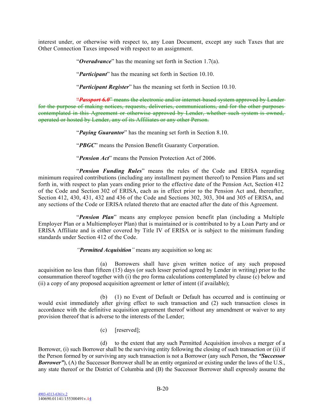 interest under, or otherwise with respect to, any Loan Document, except any such Taxes that are Other Connection Taxes imposed with respect to an assignment. “Overadvance” has the meaning set forth in Section 1.7(a). “Participant” has the meaning set forth in Section 10.10. “Participant Register” has the meaning set forth in Section 10.10. “Passport 6.0” means the electronic and/or internet-based system approved by Lender for the purpose of making notices, requests, deliveries, communications, and for the other purposes contemplated in this Agreement or otherwise approved by Lender, whether such system is owned, operated or hosted by Lender, any of its Affiliates or any other Person. “Paying Guarantor” has the meaning set forth in Section 8.10. “PBGC” means the Pension Benefit Guaranty Corporation. “Pension Act” means the Pension Protection Act of 2006. “Pension Funding Rules” means the rules of the Code and ERISA regarding minimum required contributions (including any installment payment thereof) to Pension Plans and set forth in, with respect to plan years ending prior to the effective date of the Pension Act, Section 412 of the Code and Section 302 of ERISA, each as in effect prior to the Pension Act and, thereafter, Section 412, 430, 431, 432 and 436 of the Code and Sections 302, 303, 304 and 305 of ERISA, and any sections of the Code or ERISA related thereto that are enacted after the date of this Agreement. “Pension Plan” means any employee pension benefit plan (including a Multiple Employer Plan or a Multiemployer Plan) that is maintained or is contributed to by a Loan Party and or ERISA Affiliate and is either covered by Title IV of ERISA or is subject to the minimum funding standards under Section 412 of the Code. “Permitted Acquisition” means any acquisition so long as: (a) Borrowers shall have given written notice of any such proposed acquisition no less than fifteen (15) days (or such lesser period agreed by Lender in writing) prior to the consummation thereof together with (i) the pro forma calculations contemplated by clause (c) below and (ii) a copy of any proposed acquisition agreement or letter of intent (if available); (b) (1) no Event of Default or Default has occurred and is continuing or would exist immediately after giving effect to such transaction and (2) such transaction closes in accordance with the definitive acquisition agreement thereof without any amendment or waiver to any provision thereof that is adverse to the interests of the Lender; (c) [reserved]; (d) to the extent that any such Permitted Acquisition involves a merger of a Borrower, (i) such Borrower shall be the surviving entity following the closing of such transaction or (ii) if the Person formed by or surviving any such transaction is not a Borrower (any such Person, the “Successor Borrower”), (A) the Successor Borrower shall be an entity organized or existing under the laws of the U.S., any state thereof or the District of Columbia and (B) the Successor Borrower shall expressly assume the B-20 4903-4313-6361v.2 140690.01141/155300491v.14