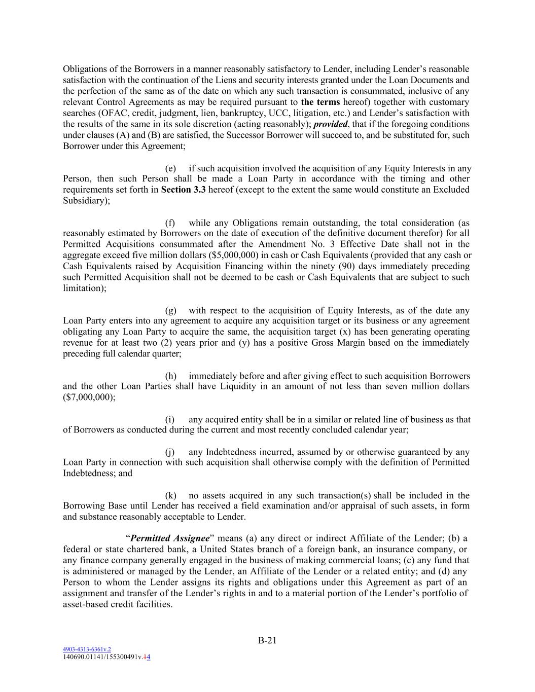 Obligations of the Borrowers in a manner reasonably satisfactory to Lender, including Lender’s reasonable satisfaction with the continuation of the Liens and security interests granted under the Loan Documents and the perfection of the same as of the date on which any such transaction is consummated, inclusive of any relevant Control Agreements as may be required pursuant to the terms hereof) together with customary searches (OFAC, credit, judgment, lien, bankruptcy, UCC, litigation, etc.) and Lender’s satisfaction with the results of the same in its sole discretion (acting reasonably); provided, that if the foregoing conditions under clauses (A) and (B) are satisfied, the Successor Borrower will succeed to, and be substituted for, such Borrower under this Agreement; (e) if such acquisition involved the acquisition of any Equity Interests in any Person, then such Person shall be made a Loan Party in accordance with the timing and other requirements set forth in Section 3.3 hereof (except to the extent the same would constitute an Excluded Subsidiary); (f) while any Obligations remain outstanding, the total consideration (as reasonably estimated by Borrowers on the date of execution of the definitive document therefor) for all Permitted Acquisitions consummated after the Amendment No. 3 Effective Date shall not in the aggregate exceed five million dollars ($5,000,000) in cash or Cash Equivalents (provided that any cash or Cash Equivalents raised by Acquisition Financing within the ninety (90) days immediately preceding such Permitted Acquisition shall not be deemed to be cash or Cash Equivalents that are subject to such limitation); (g) with respect to the acquisition of Equity Interests, as of the date any Loan Party enters into any agreement to acquire any acquisition target or its business or any agreement obligating any Loan Party to acquire the same, the acquisition target (x) has been generating operating revenue for at least two (2) years prior and (y) has a positive Gross Margin based on the immediately preceding full calendar quarter; (h) immediately before and after giving effect to such acquisition Borrowers and the other Loan Parties shall have Liquidity in an amount of not less than seven million dollars ($7,000,000); (i) any acquired entity shall be in a similar or related line of business as that of Borrowers as conducted during the current and most recently concluded calendar year; (j) any Indebtedness incurred, assumed by or otherwise guaranteed by any Loan Party in connection with such acquisition shall otherwise comply with the definition of Permitted Indebtedness; and (k) no assets acquired in any such transaction(s) shall be included in the Borrowing Base until Lender has received a field examination and/or appraisal of such assets, in form and substance reasonably acceptable to Lender. “Permitted Assignee” means (a) any direct or indirect Affiliate of the Lender; (b) a federal or state chartered bank, a United States branch of a foreign bank, an insurance company, or any finance company generally engaged in the business of making commercial loans; (c) any fund that is administered or managed by the Lender, an Affiliate of the Lender or a related entity; and (d) any Person to whom the Lender assigns its rights and obligations under this Agreement as part of an assignment and transfer of the Lender’s rights in and to a material portion of the Lender’s portfolio of asset-based credit facilities. B-21 4903-4313-6361v.2 140690.01141/155300491v.14