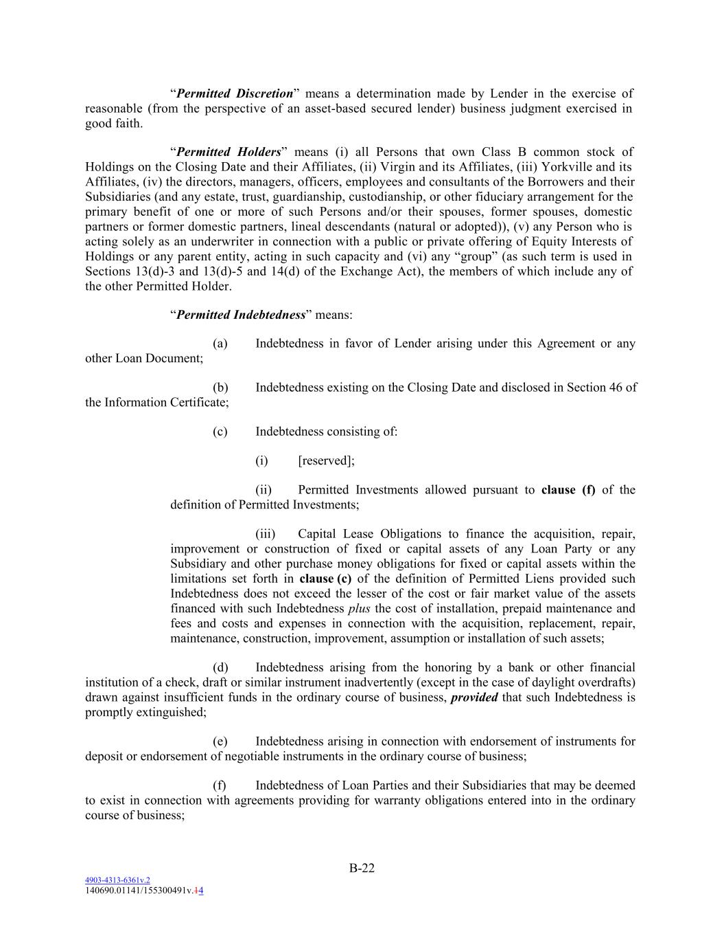 “Permitted Discretion” means a determination made by Lender in the exercise of reasonable (from the perspective of an asset-based secured lender) business judgment exercised in good faith. “Permitted Holders” means (i) all Persons that own Class B common stock of Holdings on the Closing Date and their Affiliates, (ii) Virgin and its Affiliates, (iii) Yorkville and its Affiliates, (iv) the directors, managers, officers, employees and consultants of the Borrowers and their Subsidiaries (and any estate, trust, guardianship, custodianship, or other fiduciary arrangement for the primary benefit of one or more of such Persons and/or their spouses, former spouses, domestic partners or former domestic partners, lineal descendants (natural or adopted)), (v) any Person who is acting solely as an underwriter in connection with a public or private offering of Equity Interests of Holdings or any parent entity, acting in such capacity and (vi) any “group” (as such term is used in Sections 13(d)-3 and 13(d)-5 and 14(d) of the Exchange Act), the members of which include any of the other Permitted Holder. “Permitted Indebtedness” means: (a) Indebtedness in favor of Lender arising under this Agreement or any other Loan Document; (b) Indebtedness existing on the Closing Date and disclosed in Section 46 of the Information Certificate; (c) Indebtedness consisting of: (i) [reserved]; (ii) Permitted Investments allowed pursuant to clause (f) of the definition of Permitted Investments; (iii) Capital Lease Obligations to finance the acquisition, repair, improvement or construction of fixed or capital assets of any Loan Party or any Subsidiary and other purchase money obligations for fixed or capital assets within the limitations set forth in clause (c) of the definition of Permitted Liens provided such Indebtedness does not exceed the lesser of the cost or fair market value of the assets financed with such Indebtedness plus the cost of installation, prepaid maintenance and fees and costs and expenses in connection with the acquisition, replacement, repair, maintenance, construction, improvement, assumption or installation of such assets; (d) Indebtedness arising from the honoring by a bank or other financial institution of a check, draft or similar instrument inadvertently (except in the case of daylight overdrafts) drawn against insufficient funds in the ordinary course of business, provided that such Indebtedness is promptly extinguished; (e) Indebtedness arising in connection with endorsement of instruments for deposit or endorsement of negotiable instruments in the ordinary course of business; (f) Indebtedness of Loan Parties and their Subsidiaries that may be deemed to exist in connection with agreements providing for warranty obligations entered into in the ordinary course of business; B-22 4903-4313-6361v.2 140690.01141/155300491v.14