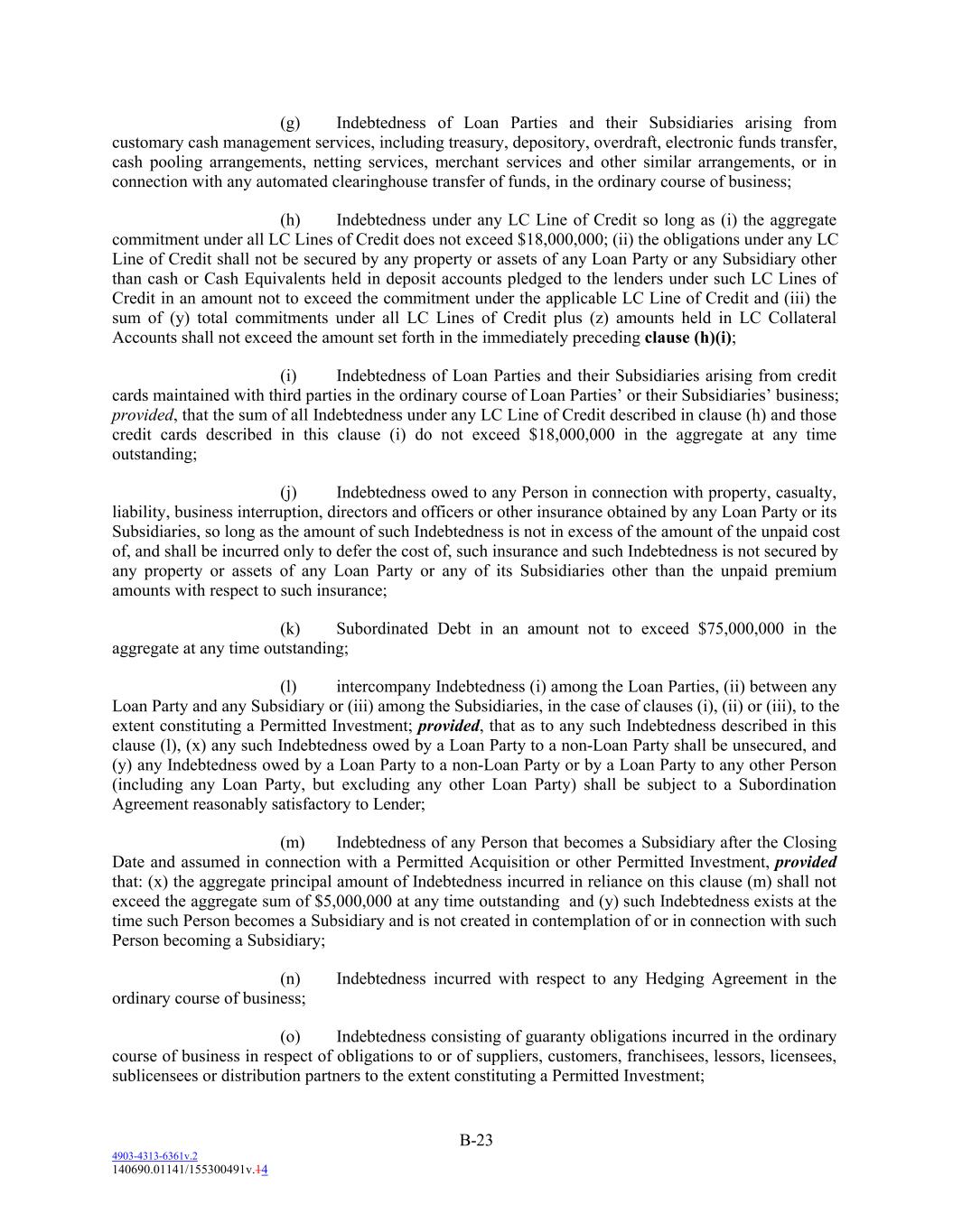 (g) Indebtedness of Loan Parties and their Subsidiaries arising from customary cash management services, including treasury, depository, overdraft, electronic funds transfer, cash pooling arrangements, netting services, merchant services and other similar arrangements, or in connection with any automated clearinghouse transfer of funds, in the ordinary course of business; (h) Indebtedness under any LC Line of Credit so long as (i) the aggregate commitment under all LC Lines of Credit does not exceed $18,000,000; (ii) the obligations under any LC Line of Credit shall not be secured by any property or assets of any Loan Party or any Subsidiary other than cash or Cash Equivalents held in deposit accounts pledged to the lenders under such LC Lines of Credit in an amount not to exceed the commitment under the applicable LC Line of Credit and (iii) the sum of (y) total commitments under all LC Lines of Credit plus (z) amounts held in LC Collateral Accounts shall not exceed the amount set forth in the immediately preceding clause (h)(i); (i) Indebtedness of Loan Parties and their Subsidiaries arising from credit cards maintained with third parties in the ordinary course of Loan Parties’ or their Subsidiaries’ business; provided, that the sum of all Indebtedness under any LC Line of Credit described in clause (h) and those credit cards described in this clause (i) do not exceed $18,000,000 in the aggregate at any time outstanding; (j) Indebtedness owed to any Person in connection with property, casualty, liability, business interruption, directors and officers or other insurance obtained by any Loan Party or its Subsidiaries, so long as the amount of such Indebtedness is not in excess of the amount of the unpaid cost of, and shall be incurred only to defer the cost of, such insurance and such Indebtedness is not secured by any property or assets of any Loan Party or any of its Subsidiaries other than the unpaid premium amounts with respect to such insurance; (k) Subordinated Debt in an amount not to exceed $75,000,000 in the aggregate at any time outstanding; (l) intercompany Indebtedness (i) among the Loan Parties, (ii) between any Loan Party and any Subsidiary or (iii) among the Subsidiaries, in the case of clauses (i), (ii) or (iii), to the extent constituting a Permitted Investment; provided, that as to any such Indebtedness described in this clause (l), (x) any such Indebtedness owed by a Loan Party to a non-Loan Party shall be unsecured, and (y) any Indebtedness owed by a Loan Party to a non-Loan Party or by a Loan Party to any other Person (including any Loan Party, but excluding any other Loan Party) shall be subject to a Subordination Agreement reasonably satisfactory to Lender; (m) Indebtedness of any Person that becomes a Subsidiary after the Closing Date and assumed in connection with a Permitted Acquisition or other Permitted Investment, provided that: (x) the aggregate principal amount of Indebtedness incurred in reliance on this clause (m) shall not exceed the aggregate sum of $5,000,000 at any time outstanding and (y) such Indebtedness exists at the time such Person becomes a Subsidiary and is not created in contemplation of or in connection with such Person becoming a Subsidiary; (n) Indebtedness incurred with respect to any Hedging Agreement in the ordinary course of business; (o) Indebtedness consisting of guaranty obligations incurred in the ordinary course of business in respect of obligations to or of suppliers, customers, franchisees, lessors, licensees, sublicensees or distribution partners to the extent constituting a Permitted Investment; B-23 4903-4313-6361v.2 140690.01141/155300491v.14
