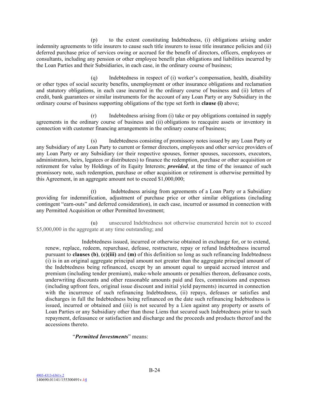 (p) to the extent constituting Indebtedness, (i) obligations arising under indemnity agreements to title insurers to cause such title insurers to issue title insurance policies and (ii) deferred purchase price of services owing or accrued for the benefit of directors, officers, employees or consultants, including any pension or other employee benefit plan obligations and liabilities incurred by the Loan Parties and their Subsidiaries, in each case, in the ordinary course of business; (q) Indebtedness in respect of (i) worker’s compensation, health, disability or other types of social security benefits, unemployment or other insurance obligations and reclamation and statutory obligations, in each case incurred in the ordinary course of business and (ii) letters of credit, bank guarantees or similar instruments for the account of any Loan Party or any Subsidiary in the ordinary course of business supporting obligations of the type set forth in clause (i) above; (r) Indebtedness arising from (i) take or pay obligations contained in supply agreements in the ordinary course of business and (ii) obligations to reacquire assets or inventory in connection with customer financing arrangements in the ordinary course of business; (s) Indebtedness consisting of promissory notes issued by any Loan Party or any Subsidiary of any Loan Party to current or former directors, employees and other service providers of any Loan Party or any Subsidiary (or their respective spouses, former spouses, successors, executors, administrators, heirs, legatees or distributees) to finance the redemption, purchase or other acquisition or retirement for value by Holdings of its Equity Interests; provided, at the time of the issuance of such promissory note, such redemption, purchase or other acquisition or retirement is otherwise permitted by this Agreement, in an aggregate amount not to exceed $1,000,000; (t) Indebtedness arising from agreements of a Loan Party or a Subsidiary providing for indemnification, adjustment of purchase price or other similar obligations (including contingent “earn-outs” and deferred consideration), in each case, incurred or assumed in connection with any Permitted Acquisition or other Permitted Investment; (u) unsecured Indebtedness not otherwise enumerated herein not to exceed $5,000,000 in the aggregate at any time outstanding; and Indebtedness issued, incurred or otherwise obtained in exchange for, or to extend, renew, replace, redeem, repurchase, defease, restructure, repay or refund Indebtedness incurred pursuant to clauses (b), (c)(iii) and (m) of this definition so long as such refinancing Indebtedness (i) is in an original aggregate principal amount not greater than the aggregate principal amount of the Indebtedness being refinanced, except by an amount equal to unpaid accrued interest and premium (including tender premium), make-whole amounts or penalties thereon, defeasance costs, underwriting discounts and other reasonable amounts paid and fees, commissions and expenses (including upfront fees, original issue discount and initial yield payments) incurred in connection with the incurrence of such refinancing Indebtedness, (ii) repays, defeases or satisfies and discharges in full the Indebtedness being refinanced on the date such refinancing Indebtedness is issued, incurred or obtained and (iii) is not secured by a Lien against any property or assets of Loan Parties or any Subsidiary other than those Liens that secured such Indebtedness prior to such repayment, defeasance or satisfaction and discharge and the proceeds and products thereof and the accessions thereto. “Permitted Investments” means: B-24 4903-4313-6361v.2 140690.01141/155300491v.14