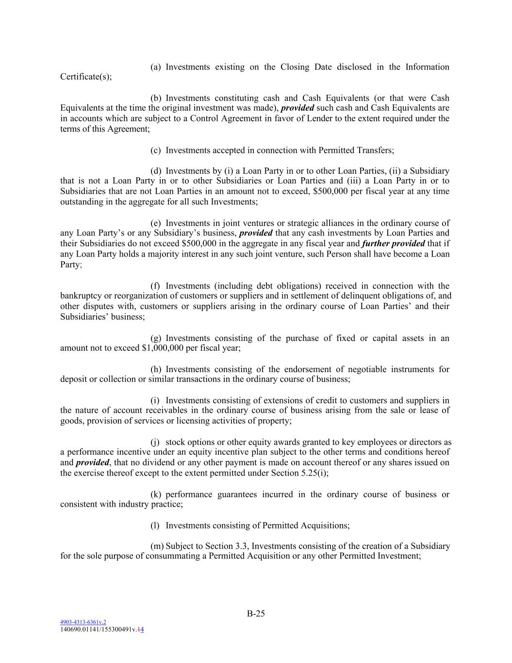 (a) Investments existing on the Closing Date disclosed in the Information Certificate(s); (b) Investments constituting cash and Cash Equivalents (or that were Cash Equivalents at the time the original investment was made), provided such cash and Cash Equivalents are in accounts which are subject to a Control Agreement in favor of Lender to the extent required under the terms of this Agreement; (c) Investments accepted in connection with Permitted Transfers; (d) Investments by (i) a Loan Party in or to other Loan Parties, (ii) a Subsidiary that is not a Loan Party in or to other Subsidiaries or Loan Parties and (iii) a Loan Party in or to Subsidiaries that are not Loan Parties in an amount not to exceed, $500,000 per fiscal year at any time outstanding in the aggregate for all such Investments; (e) Investments in joint ventures or strategic alliances in the ordinary course of any Loan Party’s or any Subsidiary’s business, provided that any cash investments by Loan Parties and their Subsidiaries do not exceed $500,000 in the aggregate in any fiscal year and further provided that if any Loan Party holds a majority interest in any such joint venture, such Person shall have become a Loan Party; (f) Investments (including debt obligations) received in connection with the bankruptcy or reorganization of customers or suppliers and in settlement of delinquent obligations of, and other disputes with, customers or suppliers arising in the ordinary course of Loan Parties’ and their Subsidiaries’ business; (g) Investments consisting of the purchase of fixed or capital assets in an amount not to exceed $1,000,000 per fiscal year; (h) Investments consisting of the endorsement of negotiable instruments for deposit or collection or similar transactions in the ordinary course of business; (i) Investments consisting of extensions of credit to customers and suppliers in the nature of account receivables in the ordinary course of business arising from the sale or lease of goods, provision of services or licensing activities of property; (j) stock options or other equity awards granted to key employees or directors as a performance incentive under an equity incentive plan subject to the other terms and conditions hereof and provided, that no dividend or any other payment is made on account thereof or any shares issued on the exercise thereof except to the extent permitted under Section 5.25(i); (k) performance guarantees incurred in the ordinary course of business or consistent with industry practice; (l) Investments consisting of Permitted Acquisitions; (m) Subject to Section 3.3, Investments consisting of the creation of a Subsidiary for the sole purpose of consummating a Permitted Acquisition or any other Permitted Investment; B-25 4903-4313-6361v.2 140690.01141/155300491v.14
