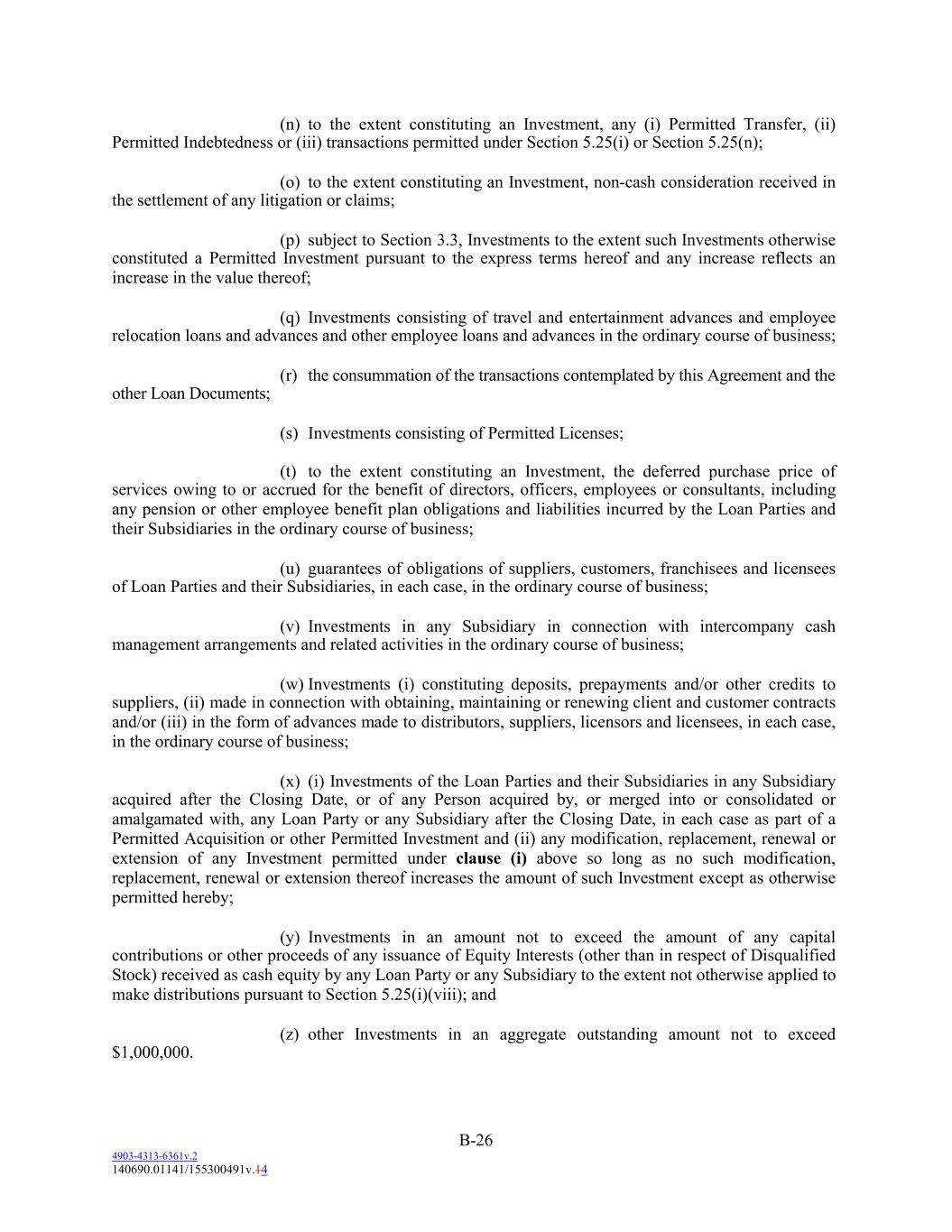(n) to the extent constituting an Investment, any (i) Permitted Transfer, (ii) Permitted Indebtedness or (iii) transactions permitted under Section 5.25(i) or Section 5.25(n); (o) to the extent constituting an Investment, non-cash consideration received in the settlement of any litigation or claims; (p) subject to Section 3.3, Investments to the extent such Investments otherwise constituted a Permitted Investment pursuant to the express terms hereof and any increase reflects an increase in the value thereof; (q) Investments consisting of travel and entertainment advances and employee relocation loans and advances and other employee loans and advances in the ordinary course of business; (r) the consummation of the transactions contemplated by this Agreement and the other Loan Documents; (s) Investments consisting of Permitted Licenses; (t) to the extent constituting an Investment, the deferred purchase price of services owing to or accrued for the benefit of directors, officers, employees or consultants, including any pension or other employee benefit plan obligations and liabilities incurred by the Loan Parties and their Subsidiaries in the ordinary course of business; (u) guarantees of obligations of suppliers, customers, franchisees and licensees of Loan Parties and their Subsidiaries, in each case, in the ordinary course of business; (v) Investments in any Subsidiary in connection with intercompany cash management arrangements and related activities in the ordinary course of business; (w) Investments (i) constituting deposits, prepayments and/or other credits to suppliers, (ii) made in connection with obtaining, maintaining or renewing client and customer contracts and/or (iii) in the form of advances made to distributors, suppliers, licensors and licensees, in each case, in the ordinary course of business; (x) (i) Investments of the Loan Parties and their Subsidiaries in any Subsidiary acquired after the Closing Date, or of any Person acquired by, or merged into or consolidated or amalgamated with, any Loan Party or any Subsidiary after the Closing Date, in each case as part of a Permitted Acquisition or other Permitted Investment and (ii) any modification, replacement, renewal or extension of any Investment permitted under clause (i) above so long as no such modification, replacement, renewal or extension thereof increases the amount of such Investment except as otherwise permitted hereby; (y) Investments in an amount not to exceed the amount of any capital contributions or other proceeds of any issuance of Equity Interests (other than in respect of Disqualified Stock) received as cash equity by any Loan Party or any Subsidiary to the extent not otherwise applied to make distributions pursuant to Section 5.25(i)(viii); and (z) other Investments in an aggregate outstanding amount not to exceed $1,000,000. B-26 4903-4313-6361v.2 140690.01141/155300491v.14