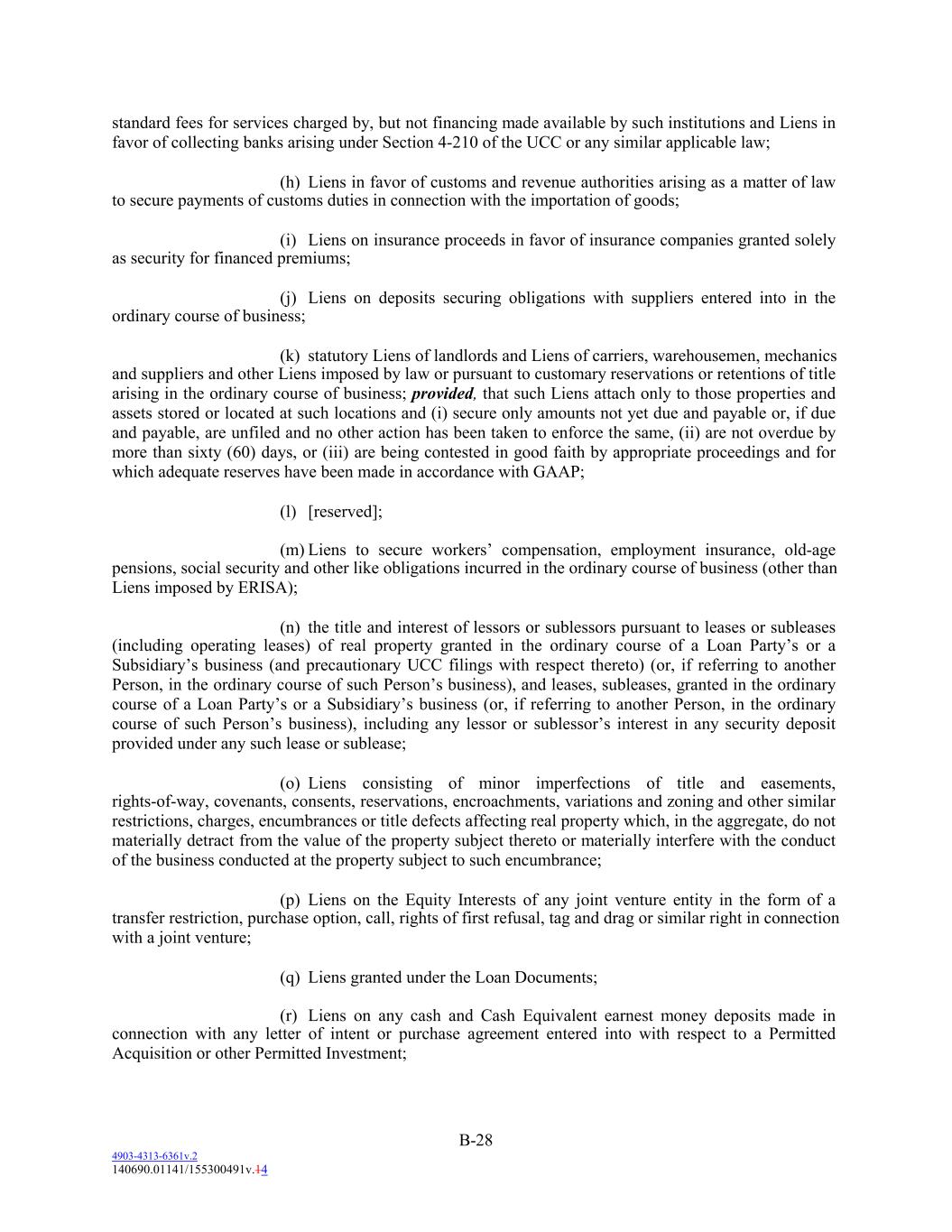 standard fees for services charged by, but not financing made available by such institutions and Liens in favor of collecting banks arising under Section 4-210 of the UCC or any similar applicable law; (h) Liens in favor of customs and revenue authorities arising as a matter of law to secure payments of customs duties in connection with the importation of goods; (i) Liens on insurance proceeds in favor of insurance companies granted solely as security for financed premiums; (j) Liens on deposits securing obligations with suppliers entered into in the ordinary course of business; (k) statutory Liens of landlords and Liens of carriers, warehousemen, mechanics and suppliers and other Liens imposed by law or pursuant to customary reservations or retentions of title arising in the ordinary course of business; provided, that such Liens attach only to those properties and assets stored or located at such locations and (i) secure only amounts not yet due and payable or, if due and payable, are unfiled and no other action has been taken to enforce the same, (ii) are not overdue by more than sixty (60) days, or (iii) are being contested in good faith by appropriate proceedings and for which adequate reserves have been made in accordance with GAAP; (l) [reserved]; (m) Liens to secure workers’ compensation, employment insurance, old-age pensions, social security and other like obligations incurred in the ordinary course of business (other than Liens imposed by ERISA); (n) the title and interest of lessors or sublessors pursuant to leases or subleases (including operating leases) of real property granted in the ordinary course of a Loan Party’s or a Subsidiary’s business (and precautionary UCC filings with respect thereto) (or, if referring to another Person, in the ordinary course of such Person’s business), and leases, subleases, granted in the ordinary course of a Loan Party’s or a Subsidiary’s business (or, if referring to another Person, in the ordinary course of such Person’s business), including any lessor or sublessor’s interest in any security deposit provided under any such lease or sublease; (o) Liens consisting of minor imperfections of title and easements, rights-of-way, covenants, consents, reservations, encroachments, variations and zoning and other similar restrictions, charges, encumbrances or title defects affecting real property which, in the aggregate, do not materially detract from the value of the property subject thereto or materially interfere with the conduct of the business conducted at the property subject to such encumbrance; (p) Liens on the Equity Interests of any joint venture entity in the form of a transfer restriction, purchase option, call, rights of first refusal, tag and drag or similar right in connection with a joint venture; (q) Liens granted under the Loan Documents; (r) Liens on any cash and Cash Equivalent earnest money deposits made in connection with any letter of intent or purchase agreement entered into with respect to a Permitted Acquisition or other Permitted Investment; B-28 4903-4313-6361v.2 140690.01141/155300491v.14