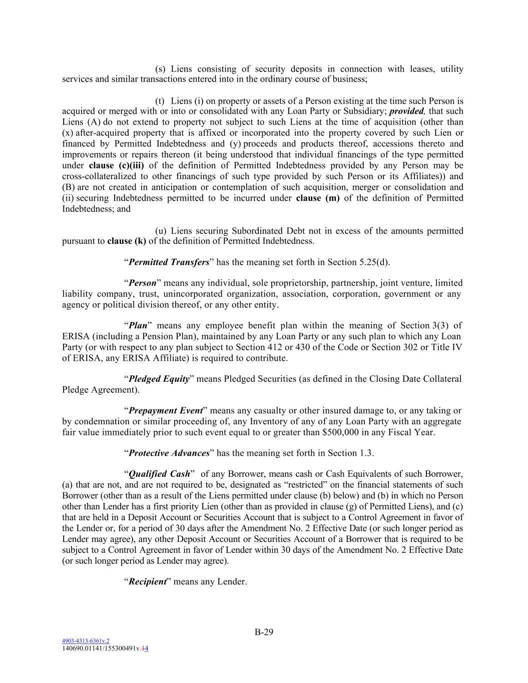 (s) Liens consisting of security deposits in connection with leases, utility services and similar transactions entered into in the ordinary course of business; (t) Liens (i) on property or assets of a Person existing at the time such Person is acquired or merged with or into or consolidated with any Loan Party or Subsidiary; provided, that such Liens (A) do not extend to property not subject to such Liens at the time of acquisition (other than (x) after-acquired property that is affixed or incorporated into the property covered by such Lien or financed by Permitted Indebtedness and (y) proceeds and products thereof, accessions thereto and improvements or repairs thereon (it being understood that individual financings of the type permitted under clause (c)(iii) of the definition of Permitted Indebtedness provided by any Person may be cross-collateralized to other financings of such type provided by such Person or its Affiliates)) and (B) are not created in anticipation or contemplation of such acquisition, merger or consolidation and (ii) securing Indebtedness permitted to be incurred under clause (m) of the definition of Permitted Indebtedness; and (u) Liens securing Subordinated Debt not in excess of the amounts permitted pursuant to clause (k) of the definition of Permitted Indebtedness. “Permitted Transfers” has the meaning set forth in Section 5.25(d). “Person” means any individual, sole proprietorship, partnership, joint venture, limited liability company, trust, unincorporated organization, association, corporation, government or any agency or political division thereof, or any other entity. “Plan” means any employee benefit plan within the meaning of Section 3(3) of ERISA (including a Pension Plan), maintained by any Loan Party or any such plan to which any Loan Party (or with respect to any plan subject to Section 412 or 430 of the Code or Section 302 or Title IV of ERISA, any ERISA Affiliate) is required to contribute. “Pledged Equity” means Pledged Securities (as defined in the Closing Date Collateral Pledge Agreement). “Prepayment Event” means any casualty or other insured damage to, or any taking or by condemnation or similar proceeding of, any Inventory of any of any Loan Party with an aggregate fair value immediately prior to such event equal to or greater than $500,000 in any Fiscal Year. “Protective Advances” has the meaning set forth in Section 1.3. “Qualified Cash” of any Borrower, means cash or Cash Equivalents of such Borrower, (a) that are not, and are not required to be, designated as “restricted” on the financial statements of such Borrower (other than as a result of the Liens permitted under clause (b) below) and (b) in which no Person other than Lender has a first priority Lien (other than as provided in clause (g) of Permitted Liens), and (c) that are held in a Deposit Account or Securities Account that is subject to a Control Agreement in favor of the Lender or, for a period of 30 days after the Amendment No. 2 Effective Date (or such longer period as Lender may agree), any other Deposit Account or Securities Account of a Borrower that is required to be subject to a Control Agreement in favor of Lender within 30 days of the Amendment No. 2 Effective Date (or such longer period as Lender may agree). “Recipient” means any Lender. B-29 4903-4313-6361v.2 140690.01141/155300491v.14