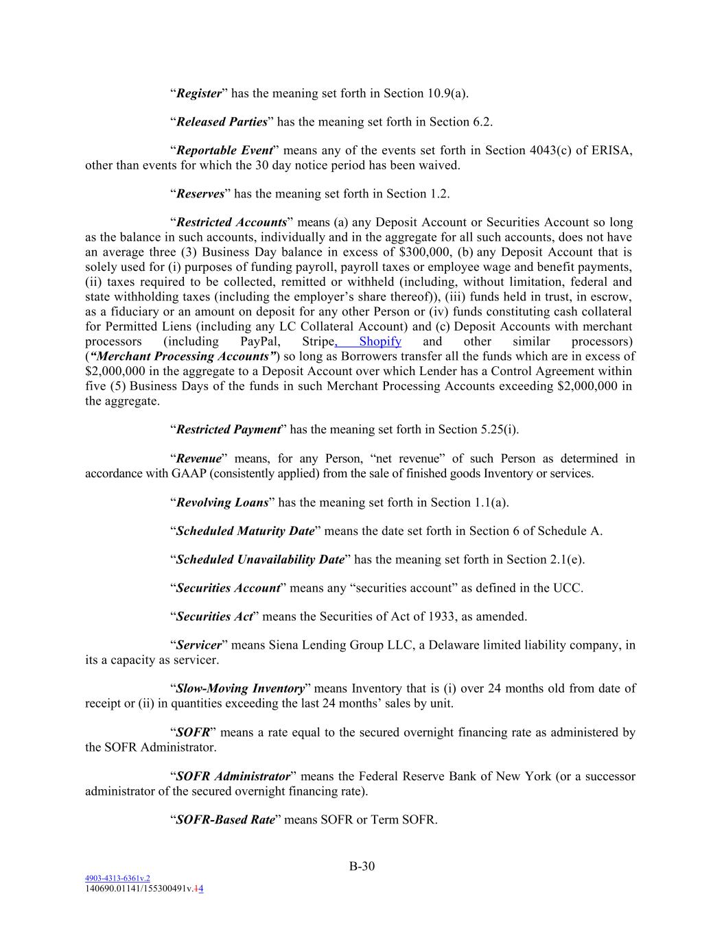 “Register” has the meaning set forth in Section 10.9(a). “Released Parties” has the meaning set forth in Section 6.2. “Reportable Event” means any of the events set forth in Section 4043(c) of ERISA, other than events for which the 30 day notice period has been waived. “Reserves” has the meaning set forth in Section 1.2. “Restricted Accounts” means (a) any Deposit Account or Securities Account so long as the balance in such accounts, individually and in the aggregate for all such accounts, does not have an average three (3) Business Day balance in excess of $300,000, (b) any Deposit Account that is solely used for (i) purposes of funding payroll, payroll taxes or employee wage and benefit payments, (ii) taxes required to be collected, remitted or withheld (including, without limitation, federal and state withholding taxes (including the employer’s share thereof)), (iii) funds held in trust, in escrow, as a fiduciary or an amount on deposit for any other Person or (iv) funds constituting cash collateral for Permitted Liens (including any LC Collateral Account) and (c) Deposit Accounts with merchant processors (including PayPal, Stripe, Shopify and other similar processors) (“Merchant Processing Accounts”) so long as Borrowers transfer all the funds which are in excess of $2,000,000 in the aggregate to a Deposit Account over which Lender has a Control Agreement within five (5) Business Days of the funds in such Merchant Processing Accounts exceeding $2,000,000 in the aggregate. “Restricted Payment” has the meaning set forth in Section 5.25(i). “Revenue” means, for any Person, “net revenue” of such Person as determined in accordance with GAAP (consistently applied) from the sale of finished goods Inventory or services. “Revolving Loans” has the meaning set forth in Section 1.1(a). “Scheduled Maturity Date” means the date set forth in Section 6 of Schedule A. “Scheduled Unavailability Date” has the meaning set forth in Section 2.1(e). “Securities Account” means any “securities account” as defined in the UCC. “Securities Act” means the Securities of Act of 1933, as amended. “Servicer” means Siena Lending Group LLC, a Delaware limited liability company, in its a capacity as servicer. “Slow-Moving Inventory” means Inventory that is (i) over 24 months old from date of receipt or (ii) in quantities exceeding the last 24 months’ sales by unit. “SOFR” means a rate equal to the secured overnight financing rate as administered by the SOFR Administrator. “SOFR Administrator” means the Federal Reserve Bank of New York (or a successor administrator of the secured overnight financing rate). “SOFR-Based Rate” means SOFR or Term SOFR. B-30 4903-4313-6361v.2 140690.01141/155300491v.14