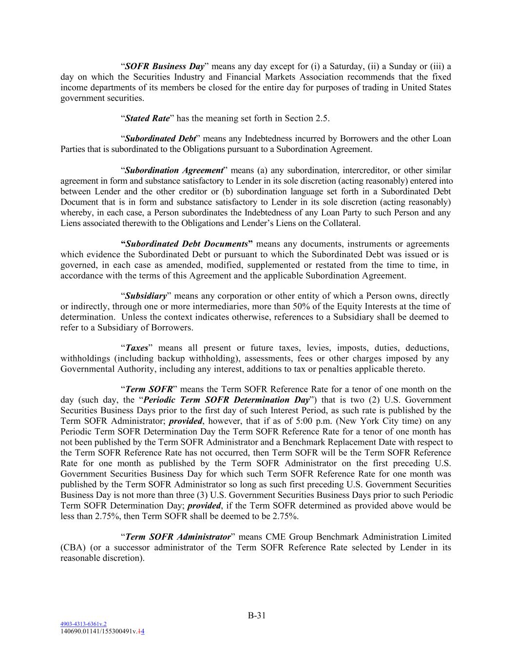 “SOFR Business Day” means any day except for (i) a Saturday, (ii) a Sunday or (iii) a day on which the Securities Industry and Financial Markets Association recommends that the fixed income departments of its members be closed for the entire day for purposes of trading in United States government securities. “Stated Rate” has the meaning set forth in Section 2.5. “Subordinated Debt” means any Indebtedness incurred by Borrowers and the other Loan Parties that is subordinated to the Obligations pursuant to a Subordination Agreement. “Subordination Agreement” means (a) any subordination, intercreditor, or other similar agreement in form and substance satisfactory to Lender in its sole discretion (acting reasonably) entered into between Lender and the other creditor or (b) subordination language set forth in a Subordinated Debt Document that is in form and substance satisfactory to Lender in its sole discretion (acting reasonably) whereby, in each case, a Person subordinates the Indebtedness of any Loan Party to such Person and any Liens associated therewith to the Obligations and Lender’s Liens on the Collateral. “Subordinated Debt Documents” means any documents, instruments or agreements which evidence the Subordinated Debt or pursuant to which the Subordinated Debt was issued or is governed, in each case as amended, modified, supplemented or restated from the time to time, in accordance with the terms of this Agreement and the applicable Subordination Agreement. “Subsidiary” means any corporation or other entity of which a Person owns, directly or indirectly, through one or more intermediaries, more than 50% of the Equity Interests at the time of determination. Unless the context indicates otherwise, references to a Subsidiary shall be deemed to refer to a Subsidiary of Borrowers. “Taxes” means all present or future taxes, levies, imposts, duties, deductions, withholdings (including backup withholding), assessments, fees or other charges imposed by any Governmental Authority, including any interest, additions to tax or penalties applicable thereto. “Term SOFR” means the Term SOFR Reference Rate for a tenor of one month on the day (such day, the “Periodic Term SOFR Determination Day”) that is two (2) U.S. Government Securities Business Days prior to the first day of such Interest Period, as such rate is published by the Term SOFR Administrator; provided, however, that if as of 5:00 p.m. (New York City time) on any Periodic Term SOFR Determination Day the Term SOFR Reference Rate for a tenor of one month has not been published by the Term SOFR Administrator and a Benchmark Replacement Date with respect to the Term SOFR Reference Rate has not occurred, then Term SOFR will be the Term SOFR Reference Rate for one month as published by the Term SOFR Administrator on the first preceding U.S. Government Securities Business Day for which such Term SOFR Reference Rate for one month was published by the Term SOFR Administrator so long as such first preceding U.S. Government Securities Business Day is not more than three (3) U.S. Government Securities Business Days prior to such Periodic Term SOFR Determination Day; provided, if the Term SOFR determined as provided above would be less than 2.75%, then Term SOFR shall be deemed to be 2.75%. “Term SOFR Administrator” means CME Group Benchmark Administration Limited (CBA) (or a successor administrator of the Term SOFR Reference Rate selected by Lender in its reasonable discretion). B-31 4903-4313-6361v.2 140690.01141/155300491v.14