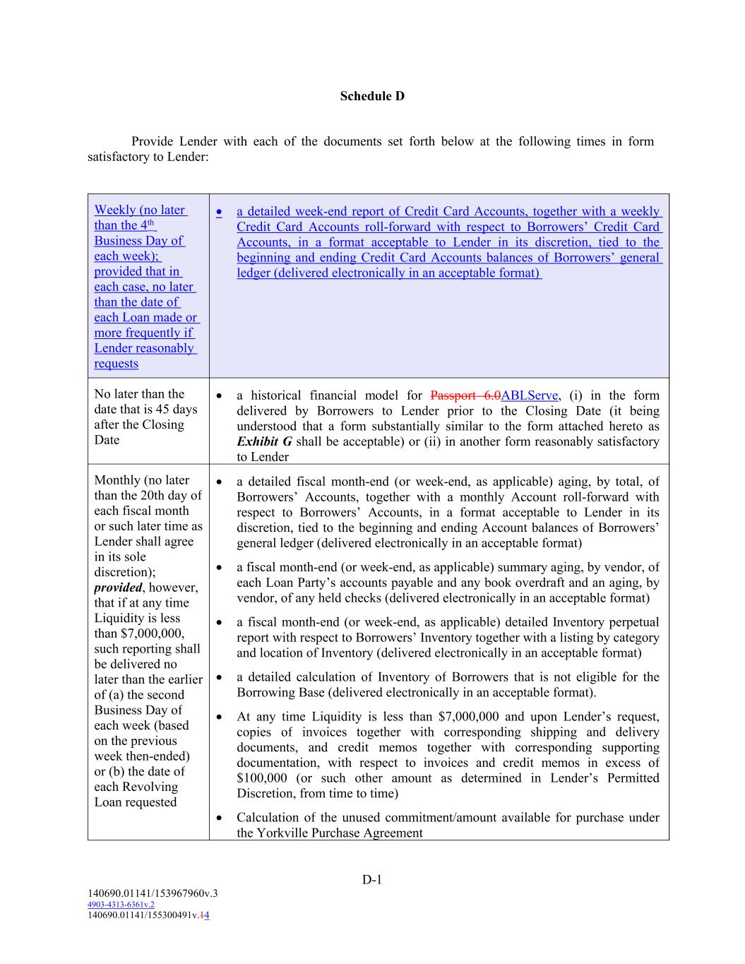 D-1 140690.01141/153967960v.3 4903-4313-6361v.2 140690.01141/155300491v.14 No later than the date that is 45 days after the Closing Date a historical financial model for Passport 6.0ABLServe, (i) in the form delivered by Borrowers to Lender prior to the Closing Date (it being understood that a form substantially similar to the form attached hereto as Exhibit G shall be acceptable) or (ii) in another form reasonably satisfactory to Lender Weekly (no later than the 4th Business Day of each week); provided that in each case, no later than the date of each Loan made or more frequently if Lender reasonably requests Monthly (no later than the 20th day of each fiscal month or such later time as Lender shall agree in its sole discretion); provided, however, that if at any time Liquidity is less than $7,000,000, such reporting shall be delivered no later than the earlier of (a) the second Business Day of each week (based on the previous week then-ended) or (b) the date of each Revolving Loan requested a detailed week-end report of Credit Card Accounts, together with a weekly Credit Card Accounts roll-forward with respect to Borrowers’ Credit Card Accounts, in a format acceptable to Lender in its discretion, tied to the beginning and ending Credit Card Accounts balances of Borrowers’ general ledger (delivered electronically in an acceptable format) a detailed fiscal month-end (or week-end, as applicable) aging, by total, of Borrowers’ Accounts, together with a monthly Account roll-forward with respect to Borrowers’ Accounts, in a format acceptable to Lender in its discretion, tied to the beginning and ending Account balances of Borrowers’ general ledger (delivered electronically in an acceptable format) a fiscal month-end (or week-end, as applicable) summary aging, by vendor, of each Loan Party’s accounts payable and any book overdraft and an aging, by vendor, of any held checks (delivered electronically in an acceptable format) a fiscal month-end (or week-end, as applicable) detailed Inventory perpetual report with respect to Borrowers’ Inventory together with a listing by category and location of Inventory (delivered electronically in an acceptable format) a detailed calculation of Inventory of Borrowers that is not eligible for the Borrowing Base (delivered electronically in an acceptable format). At any time Liquidity is less than $7,000,000 and upon Lender’s request, copies of invoices together with corresponding shipping and delivery documents, and credit memos together with corresponding supporting documentation, with respect to invoices and credit memos in excess of $100,000 (or such other amount as determined in Lender’s Permitted Discretion, from time to time) Calculation of the unused commitment/amount available for purchase under the Yorkville Purchase Agreement Schedule D Provide Lender with each of the documents set forth below at the following times in form satisfactory to Lender: