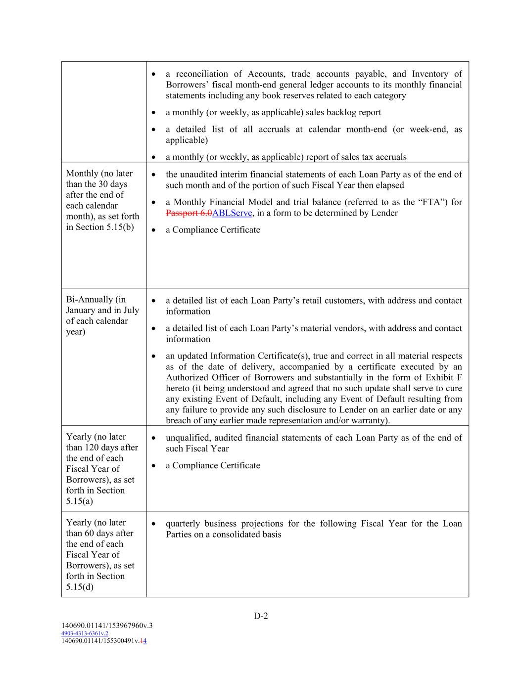 D-2 140690.01141/153967960v.3 4903-4313-6361v.2 140690.01141/155300491v.14 Bi-Annually (in January and in July of each calendar year) a detailed list of each Loan Party’s retail customers, with address and contact information a detailed list of each Loan Party’s material vendors, with address and contact information an updated Information Certificate(s), true and correct in all material respects as of the date of delivery, accompanied by a certificate executed by an Authorized Officer of Borrowers and substantially in the form of Exhibit F hereto (it being understood and agreed that no such update shall serve to cure any existing Event of Default, including any Event of Default resulting from any failure to provide any such disclosure to Lender on an earlier date or any breach of any earlier made representation and/or warranty). Yearly (no later than 120 days after the end of each Fiscal Year of Borrowers), as set forth in Section 5.15(a) Monthly (no later than the 30 days after the end of each calendar month), as set forth in Section 5.15(b) unqualified, audited financial statements of each Loan Party as of the end of such Fiscal Year a Compliance Certificate the unaudited interim financial statements of each Loan Party as of the end of such month and of the portion of such Fiscal Year then elapsed a Monthly Financial Model and trial balance (referred to as the “FTA”) for Passport 6.0ABLServe, in a form to be determined by Lender a Compliance Certificate Yearly (no later than 60 days after the end of each Fiscal Year of Borrowers), as set forth in Section 5.15(d) quarterly business projections for the following Fiscal Year for the Loan Parties on a consolidated basis a reconciliation of Accounts, trade accounts payable, and Inventory of Borrowers’ fiscal month-end general ledger accounts to its monthly financial statements including any book reserves related to each category a monthly (or weekly, as applicable) sales backlog report a detailed list of all accruals at calendar month-end (or week-end, as applicable) a monthly (or weekly, as applicable) report of sales tax accruals